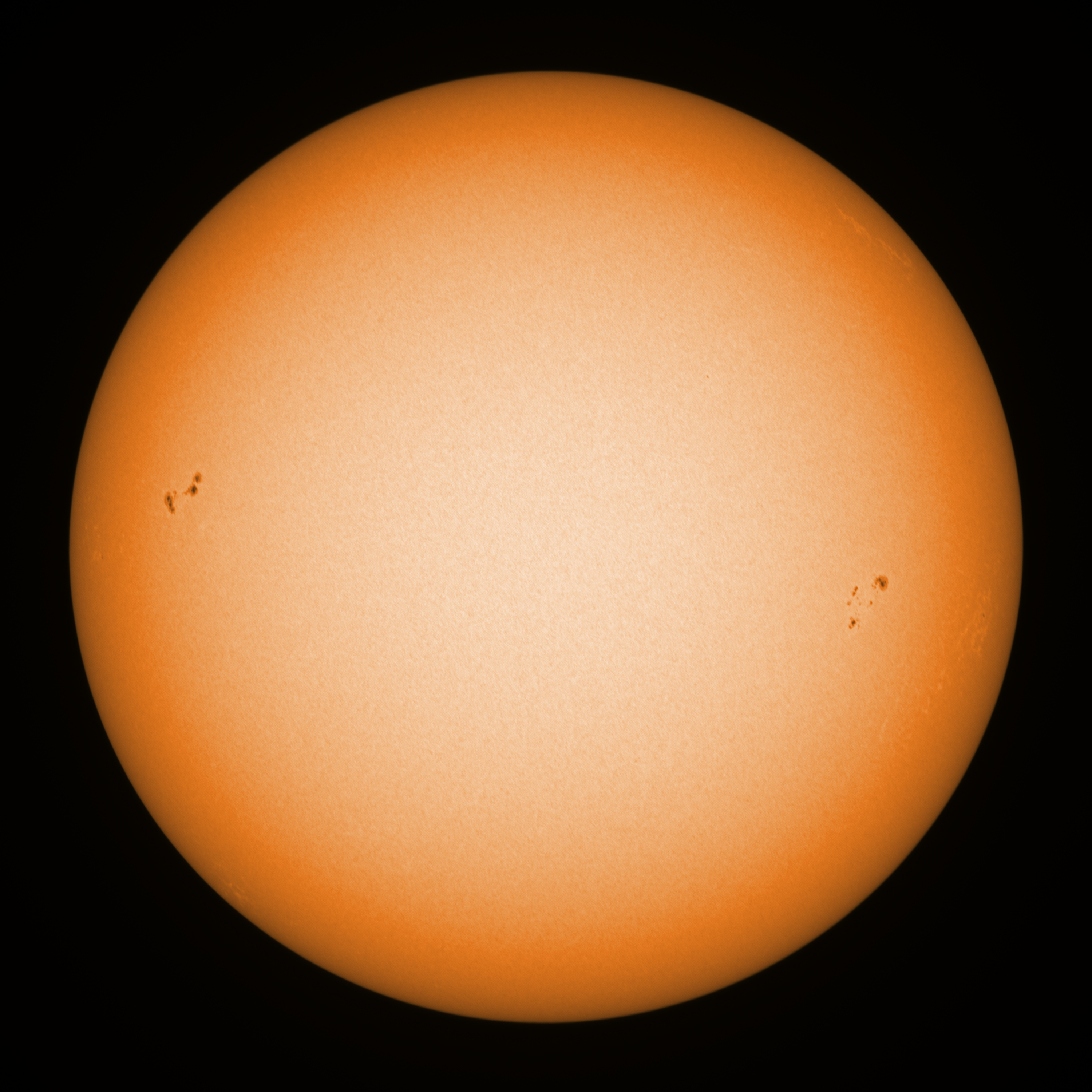 Observation date/time: 29 September 15:28 UTC Telescope: GTT60 (Galileo Type Telescope) Focal length: 1490mm (plano convex singlet) Aperture: 60mm Stop: 30mm Eyepiece: -75mm (plano concave singlet, 24mm aperture) Observation type: projection (351mm distance, 80mm diameter) Reference: Earth's rotation axis Exposure (transparency): 0.260ms Seeing (SSSMon): 1.5-2.0" =================================================================== Total number of sunspots: 12 | |