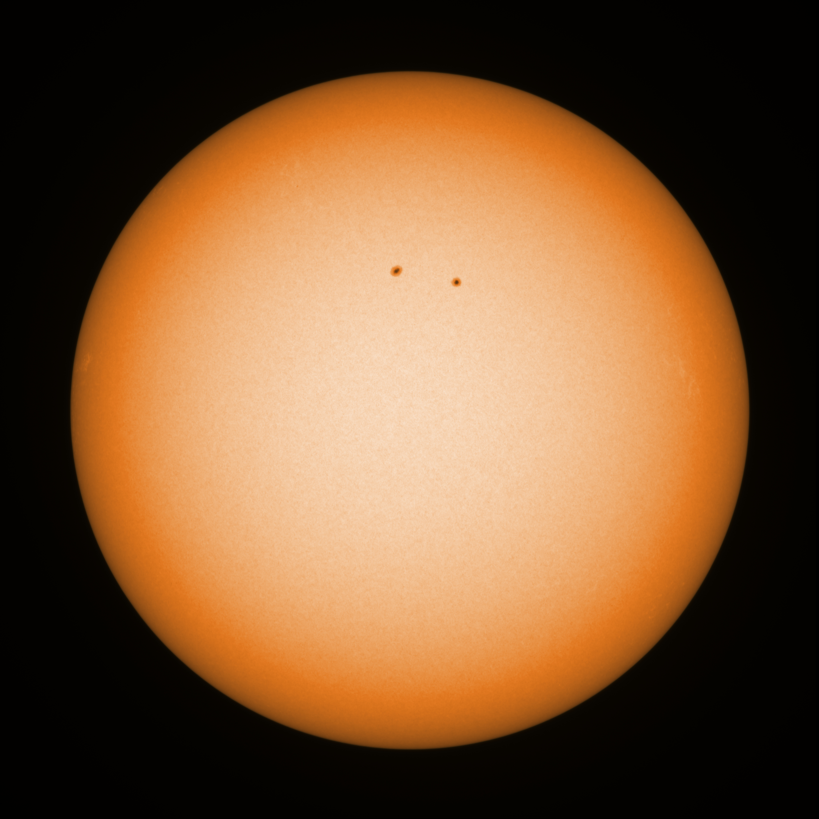 Observation date/time: 26 February 10:45 UTC Telescope: GTT60 (Galileo Type Telescope) Focal length: 1490mm (plano convex singlet) Aperture: 60mm Stop: 30mm Eyepiece: -75mm (plano concave singlet, 24mm aperture) Observation type: projection (343mm distance, 80mm diameter) Reference: Earth's rotation axis Exposure (transparency): 0.180ms Seeing (SSSMon): 4.0" =================================================================== Total number of sunspots: 2 | |