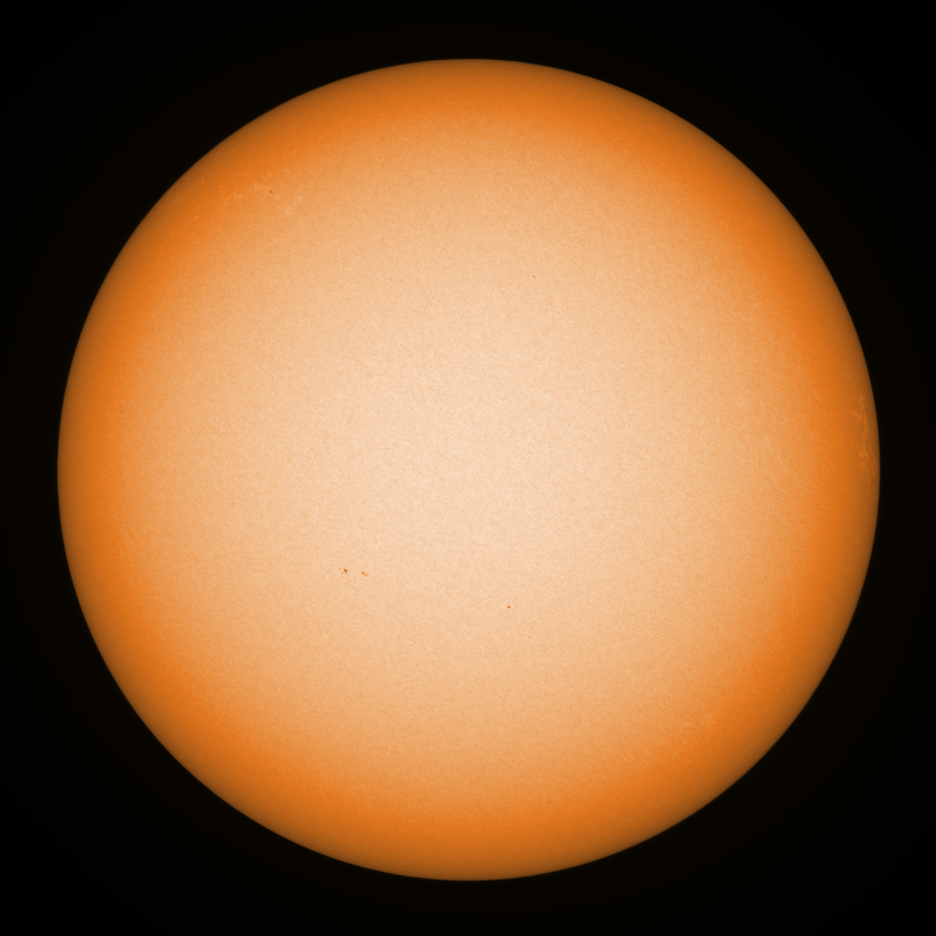 Observation date/time: 20 March 15:35 UTC Telescope: GTT60 (Galileo Type Telescope) Focal length: 1490mm (plano convex singlet) Aperture: 60mm Stop: 30mm Eyepiece: -75mm (plano concave singlet, 24mm aperture) Observation type: projection (343mm distance, 80mm diameter) Reference: Earth's rotation axis Exposure (transparency): 0.880ms Seeing (SSSMon): 2.0" =================================================================== Total number of sunspots: 3 | |