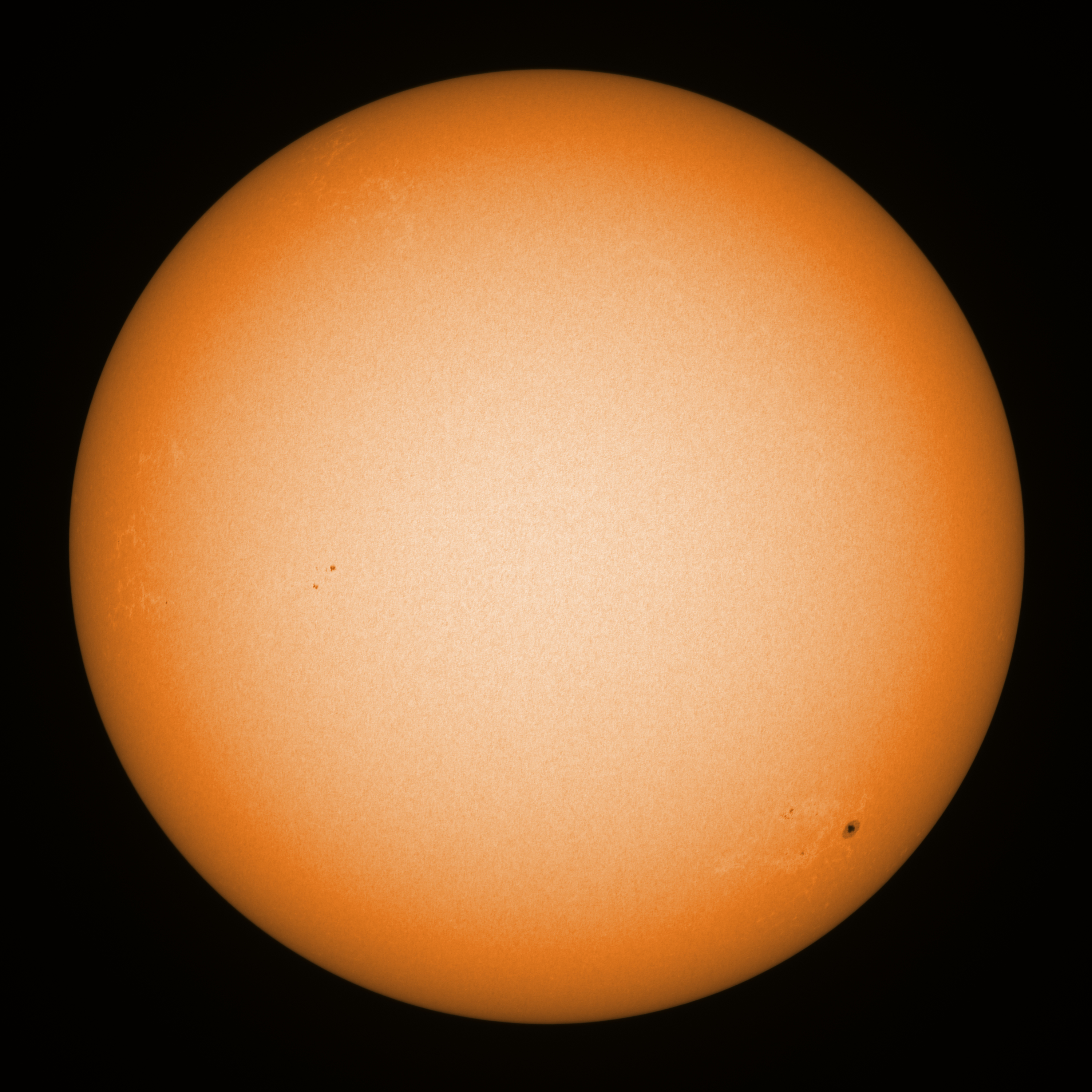 Observation date/time: 07 April 10:19 UTC Telescope: GTT60 (Galileo Type Telescope) Focal length: 1490mm (plano convex singlet) Aperture: 60mm Stop: 30mm Eyepiece: -75mm (plano concave singlet, 24mm aperture) Observation type: projection (343mm distance, 80mm diameter) Reference: Earth's rotation axis Exposure (transparency): 0.180ms Seeing (SSSMon): 3.5-4.0" =================================================================== Total number of sunspots: 6 | |
