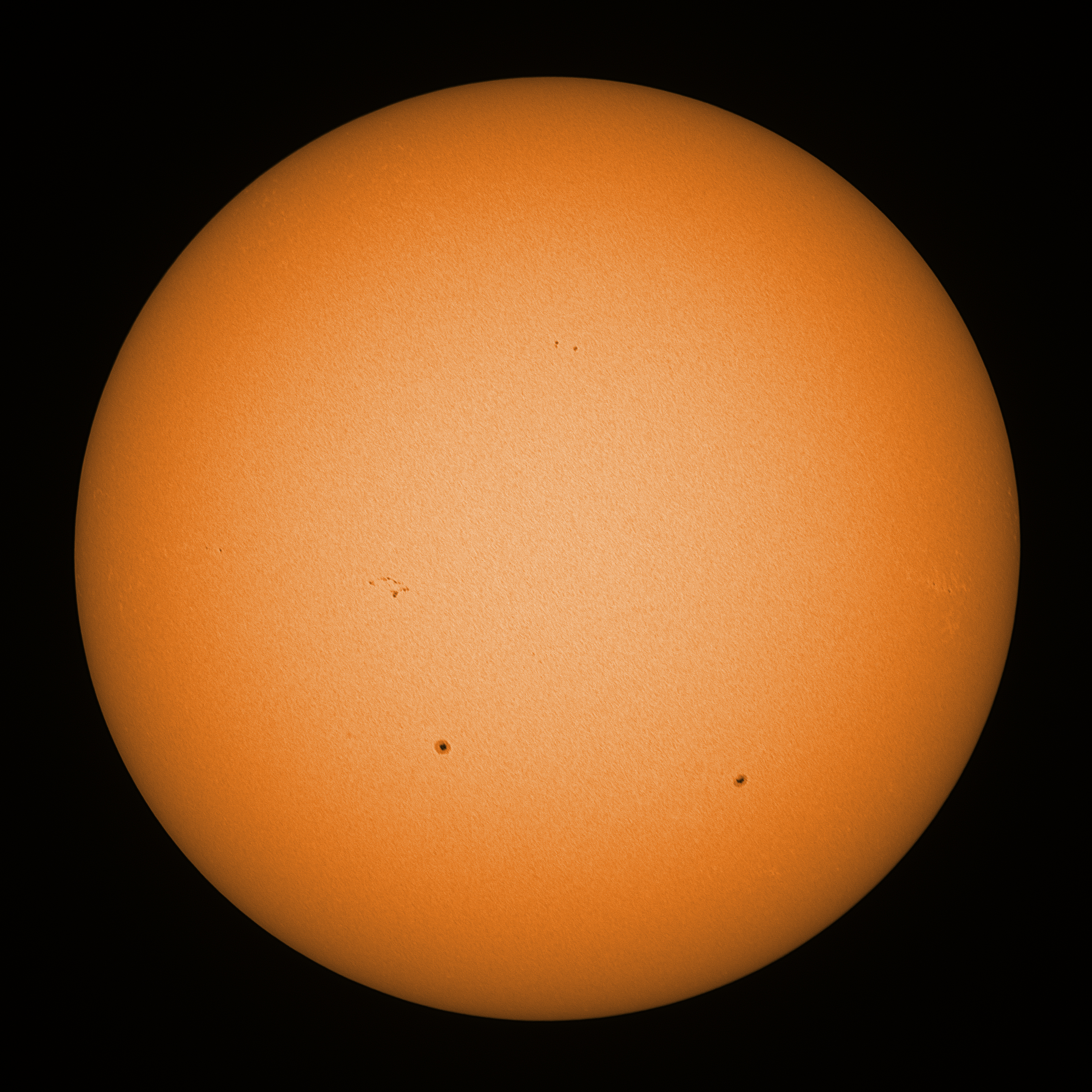 Observation date/time: 02 May 17:51 UTC Telescope: GTT60 (Galileo Type Telescope) Focal length: 1490mm (plano convex singlet) Aperture: 60mm Stop: 30mm Eyepiece: -75mm (plano concave singlet, 24mm aperture) Observation type: projection (346mm distance, 80mm diameter) Reference: Earth's rotation axis Exposure (transparency): 0.330ms Seeing (SSSMon): 4.0" =================================================================== Total number of sunspots: 7 | |