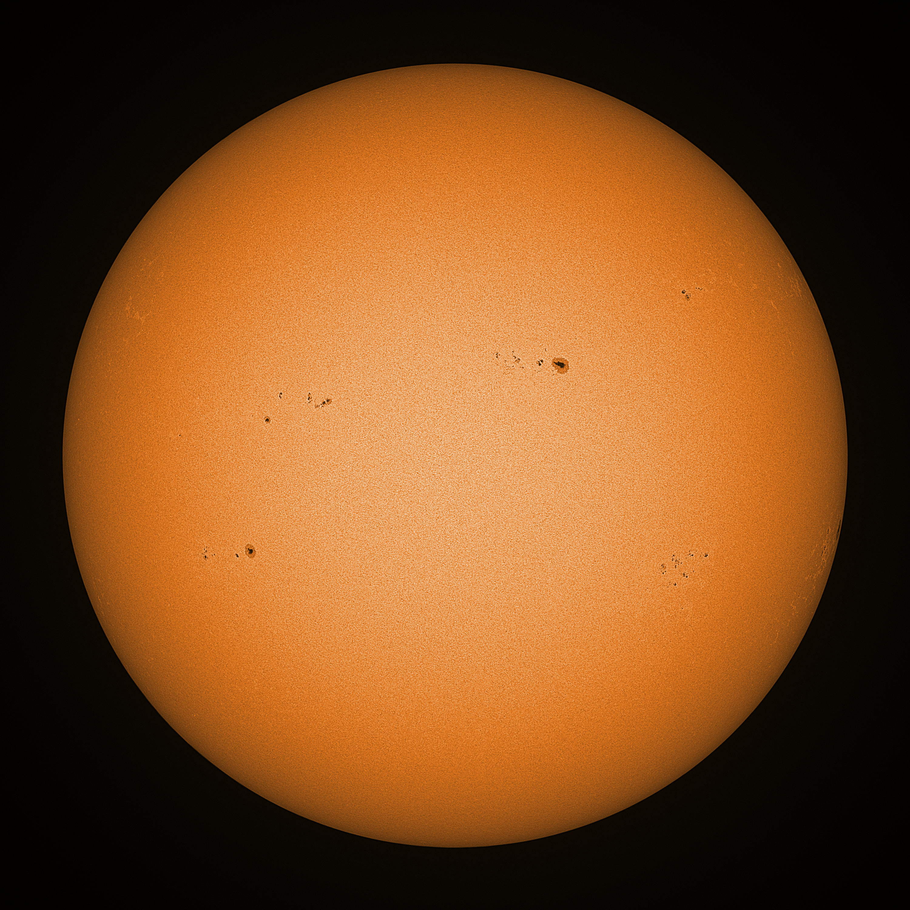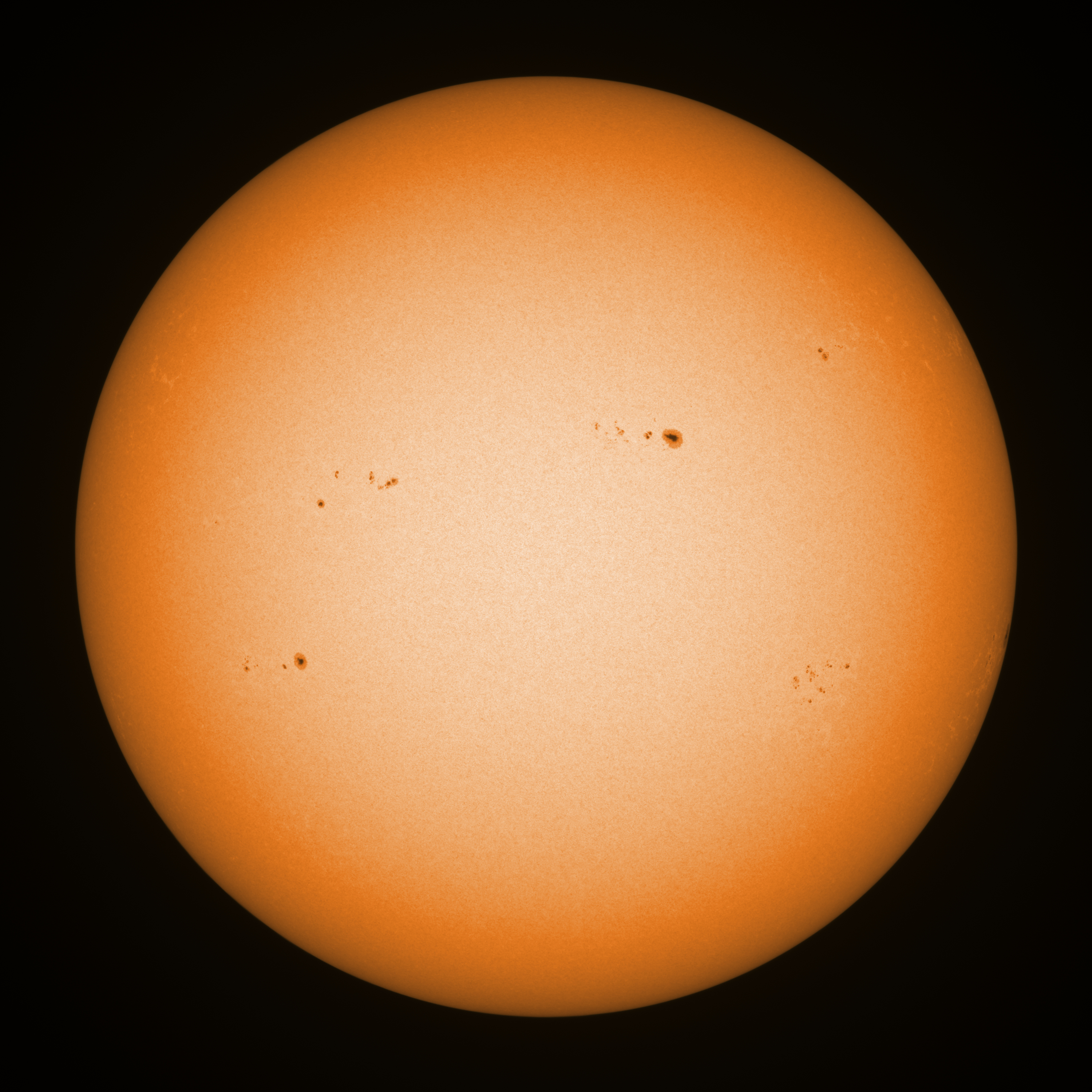 Observation date/time: 18 July 09:38 UTC Telescope: GTT60 (Galileo Type Telescope) Focal length: 1490mm (plano convex singlet) Aperture: 60mm Stop: 30mm Eyepiece: -75mm (plano concave singlet, 24mm aperture) Observation type: projection (349mm distance, 80mm diameter) Reference: Earth's rotation axis Exposure (transparency): 0.190ms Seeing (SSSMon): 3.0" =================================================================== Total number of sunspots: 38 | |