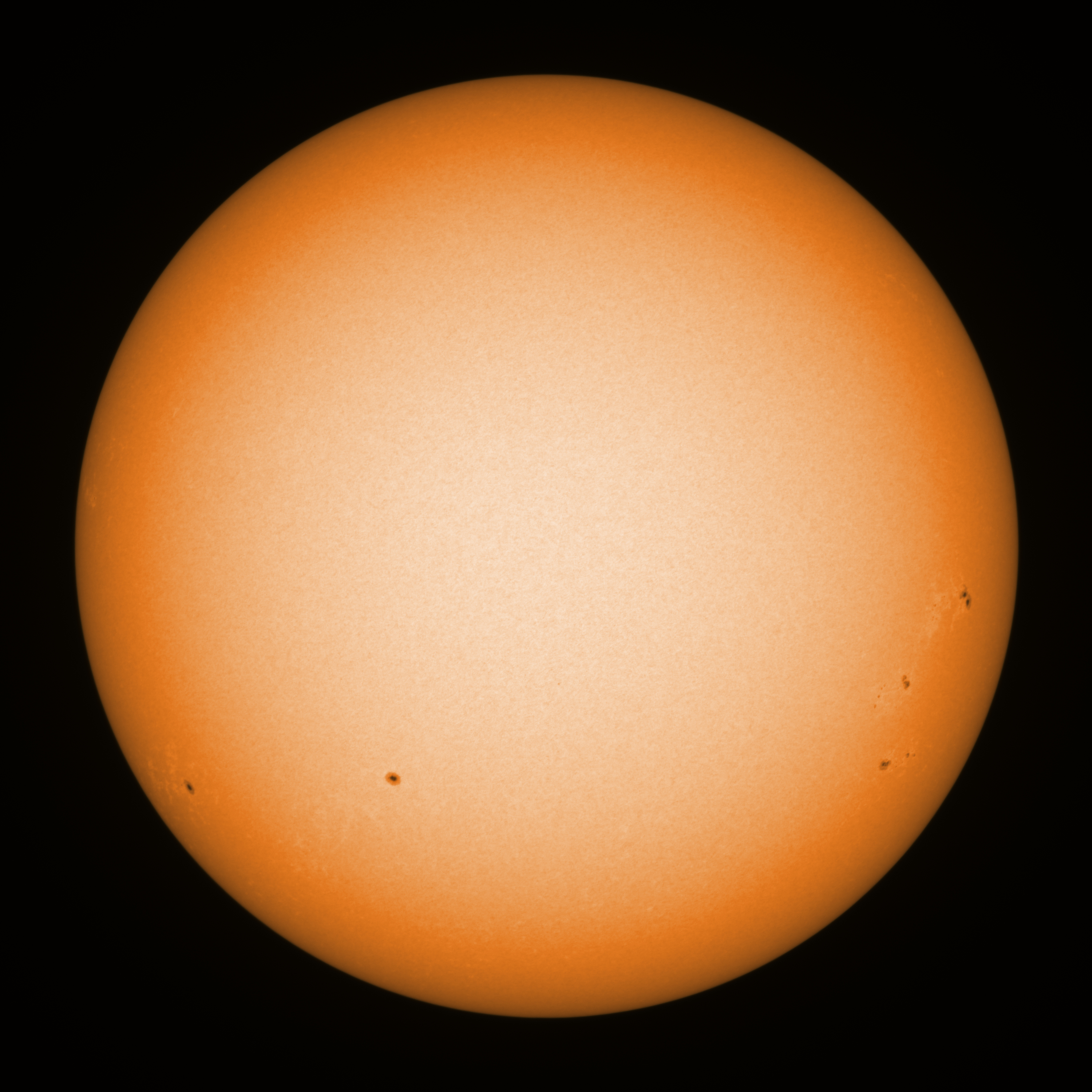 Observation date/time: 06 August 08:27 UTC Telescope: GTT60 (Galileo Type Telescope) Focal length: 1490mm (plano convex singlet) Aperture: 60mm Stop: 30mm Eyepiece: -75mm (plano concave singlet, 24mm aperture) Observation type: projection (349mm distance, 80mm diameter) Reference: Earth's rotation axis Exposure (transparency): 0.160ms Seeing (SSSMon): 4.5-5.0" (3.0" at best) =================================================================== Total number of sunspots: 10 | |