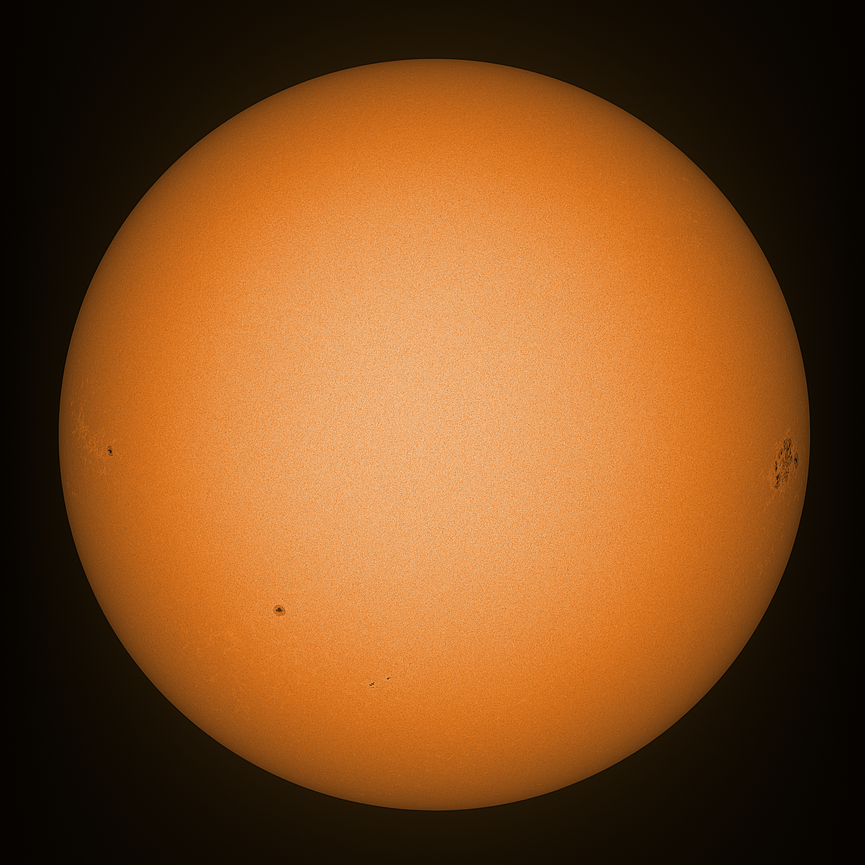 Observation date/time: 04 September 10:15 UTC Telescope: GTT60 (Galileo Type Telescope) Focal length: 1490mm (plano convex singlet) Aperture: 60mm Stop: 30mm Eyepiece: -75mm (plano concave singlet, 24mm aperture) Observation type: projection (352mm distance, 80mm diameter) Reference: Earth's rotation axis Exposure (transparency): 0.400ms Seeing (SSSMon): 3.5-4.0" (1.5" at best) =================================================================== Total number of sunspots: 15 | |