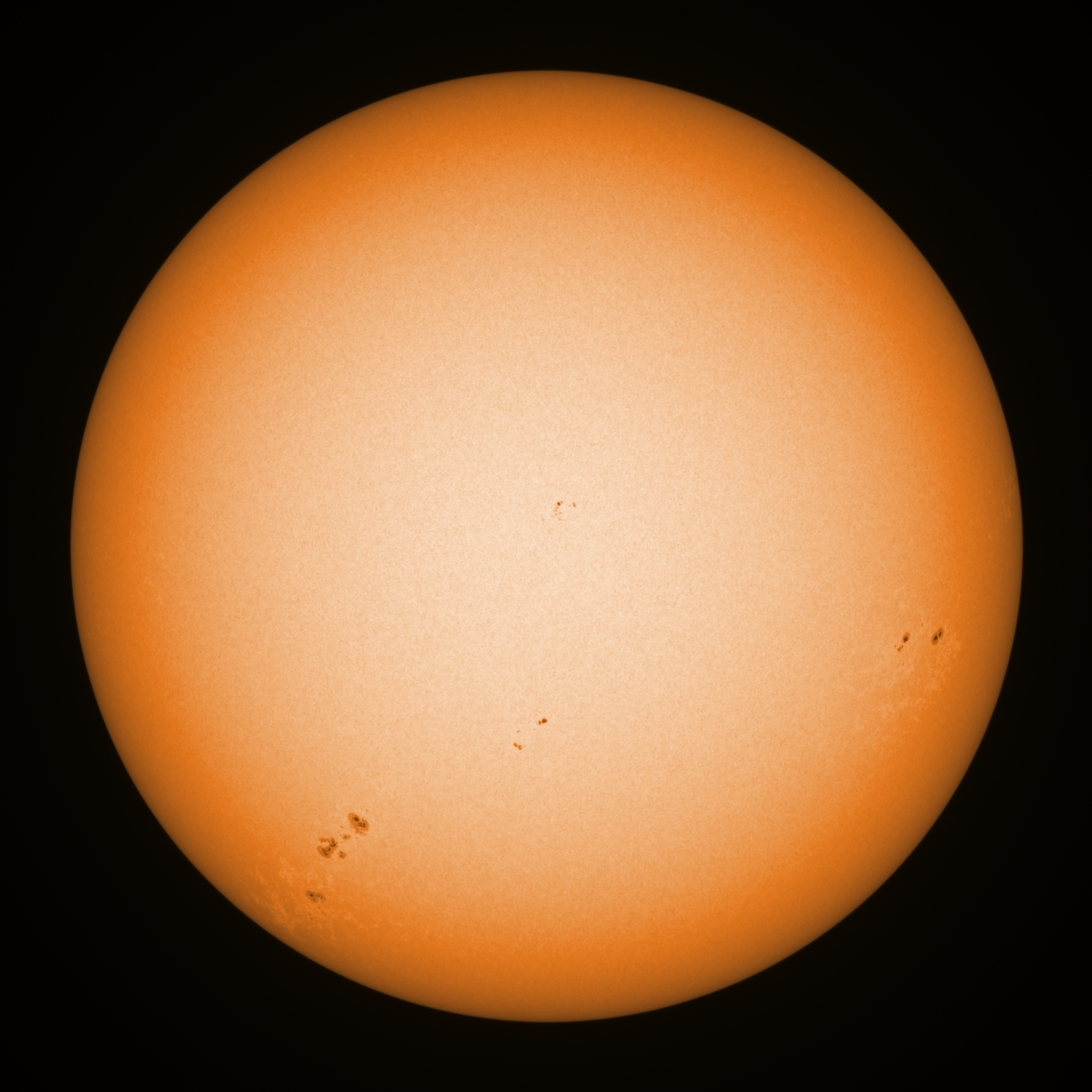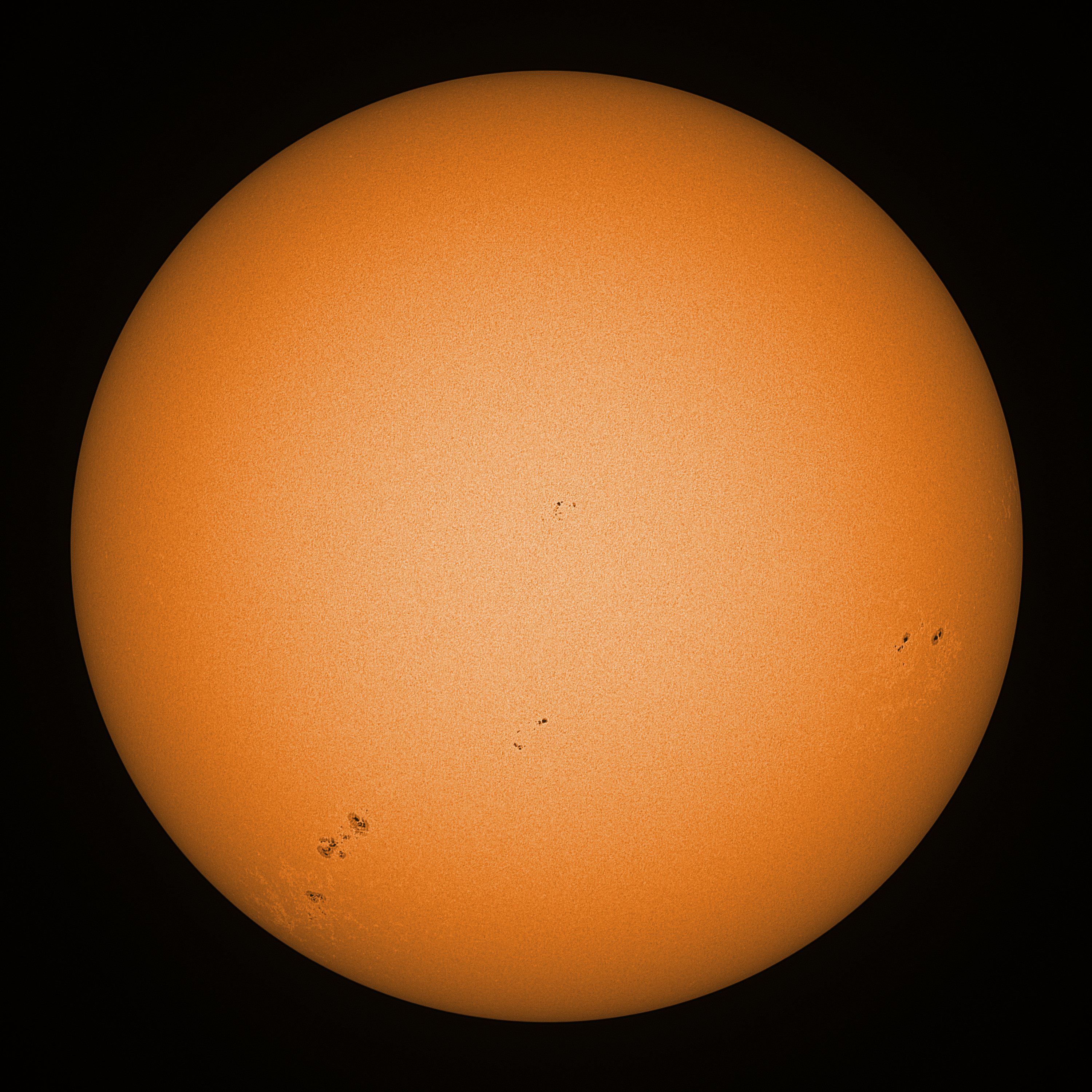 Observation date/time: 22 September 08:25 UTC Telescope: GTT60 (Galileo Type Telescope) Focal length: 1490mm (plano convex singlet) Aperture: 60mm Stop: 30mm Eyepiece: -75mm (plano concave singlet, 24mm aperture) Observation type: projection (349mm distance, 80mm diameter) Reference: Earth's rotation axis Exposure (transparency): 0.230ms Seeing (SSSMon): 1.4-1.6" (0.9" at best) =================================================================== Total number of sunspots: 28 | |