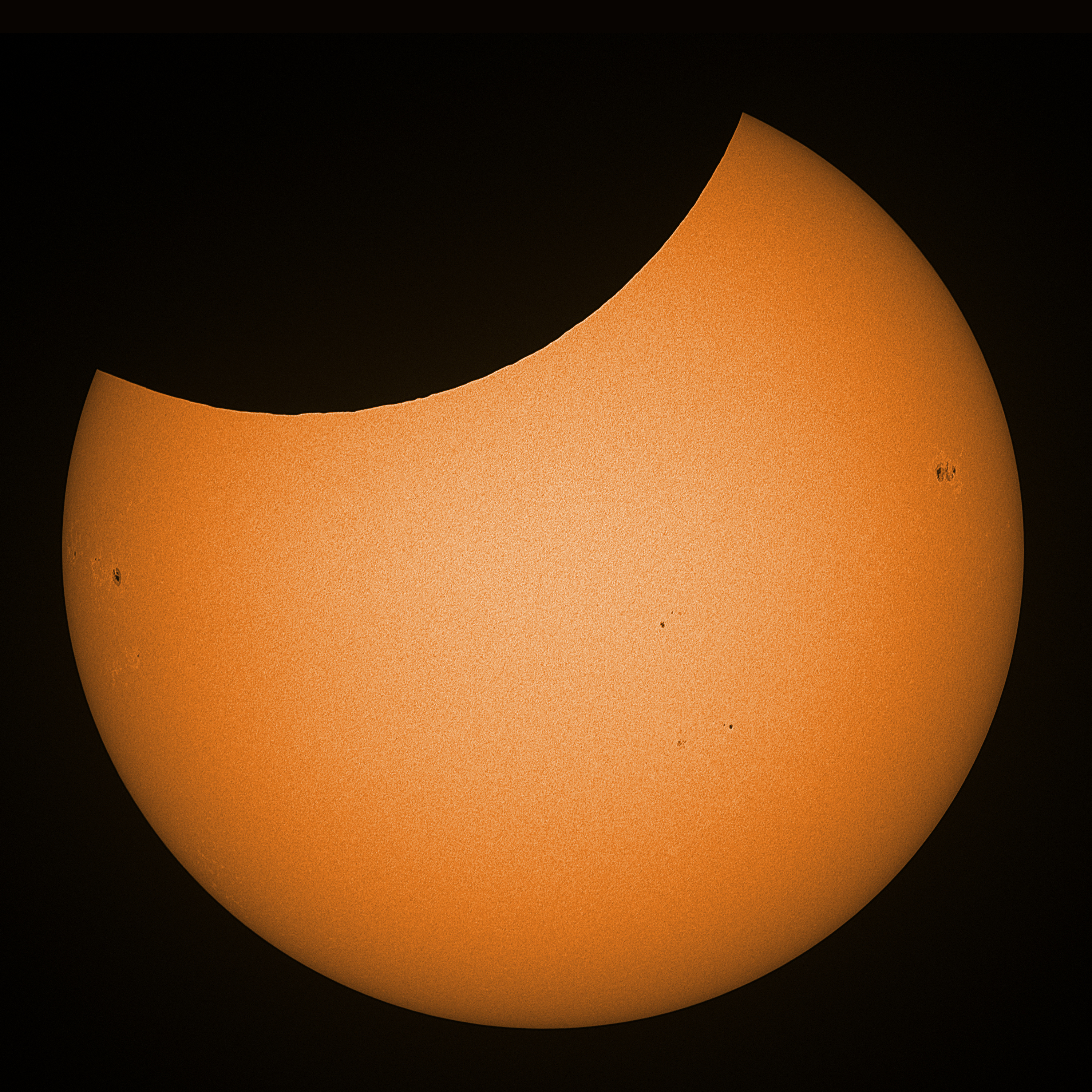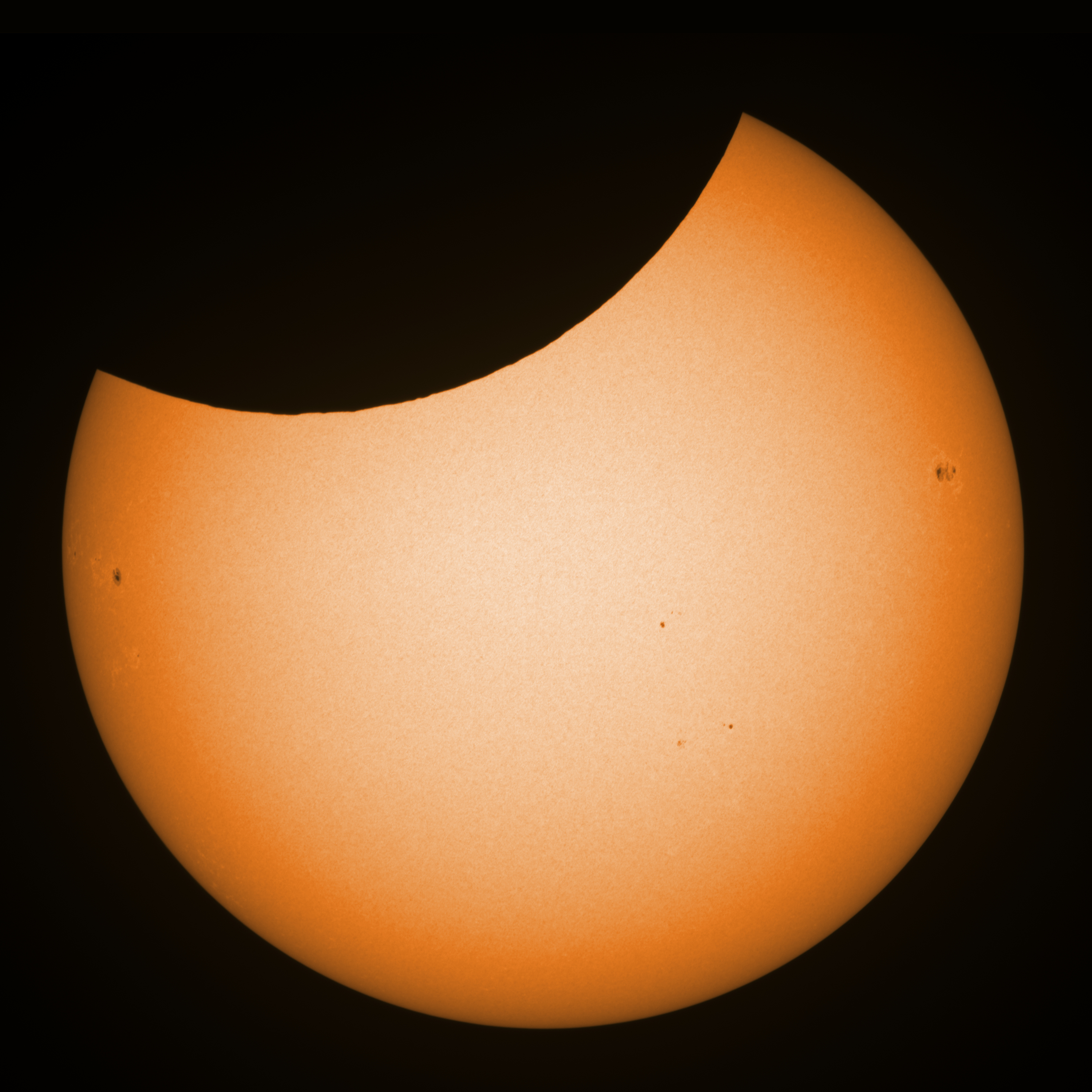 Today we had about 80% cumuli, topped with some cirrus and, more importantly, a partial solar eclipse (22%). In order to get that eclipse imaged I deviated from my usual habit to first sketch then image, so I had seen the Sun for the past hour or so before I made the sketch. The sketch was made just a few minutes before maximum as more cloud was expected to drift in soon. Earlier images showed that no spots were missed behind the moon. The transparency varied a lot, and the scintillation monitor failed to report any figures due to the very short clearances. I made the following observation (but you may want to ignore this for above reasons):
