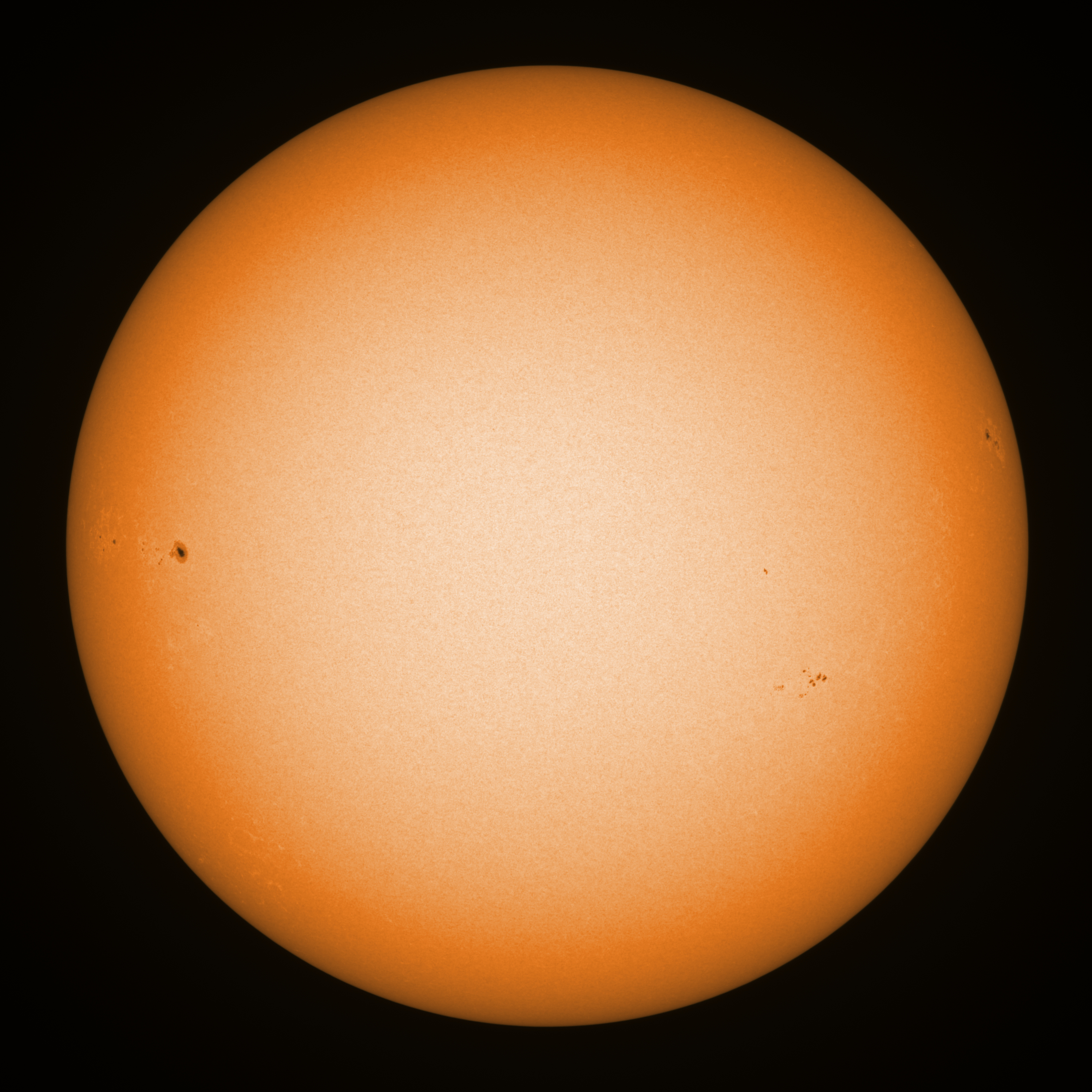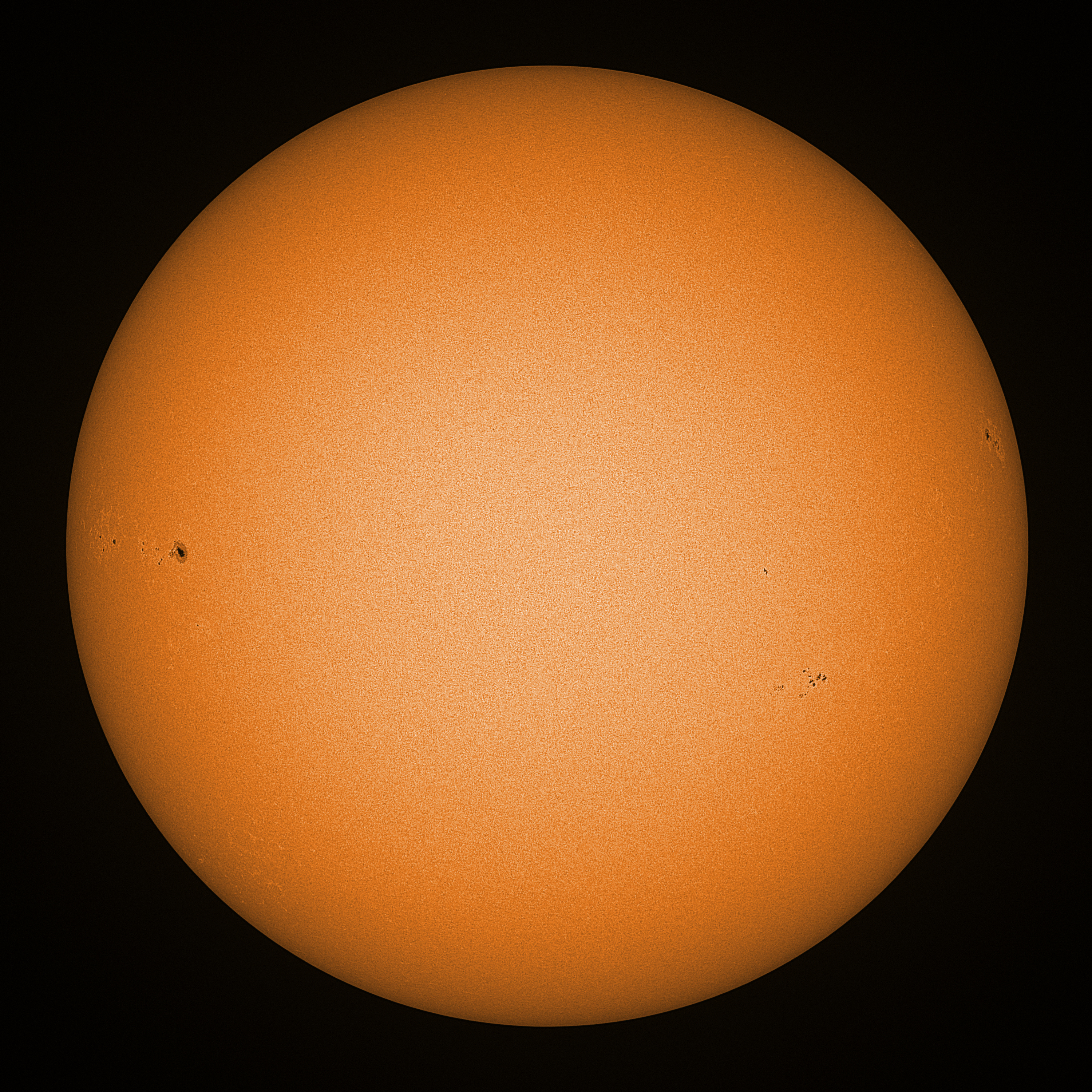 Observation date/time: 26 October 10:57 UTC Telescope: GTT60 (Galileo Type Telescope) Focal length: 1490mm (plano convex singlet) Aperture: 60mm Stop: 30mm Eyepiece: -75mm (plano concave singlet, 24mm aperture) Observation type: projection (346mm distance, 80mm diameter) Reference: Earth's rotation axis Exposure (transparency): 0.200ms Seeing (SSSMon): 1.5-3.0" (1.0" at best) =================================================================== Total number of sunspots: 15 | |