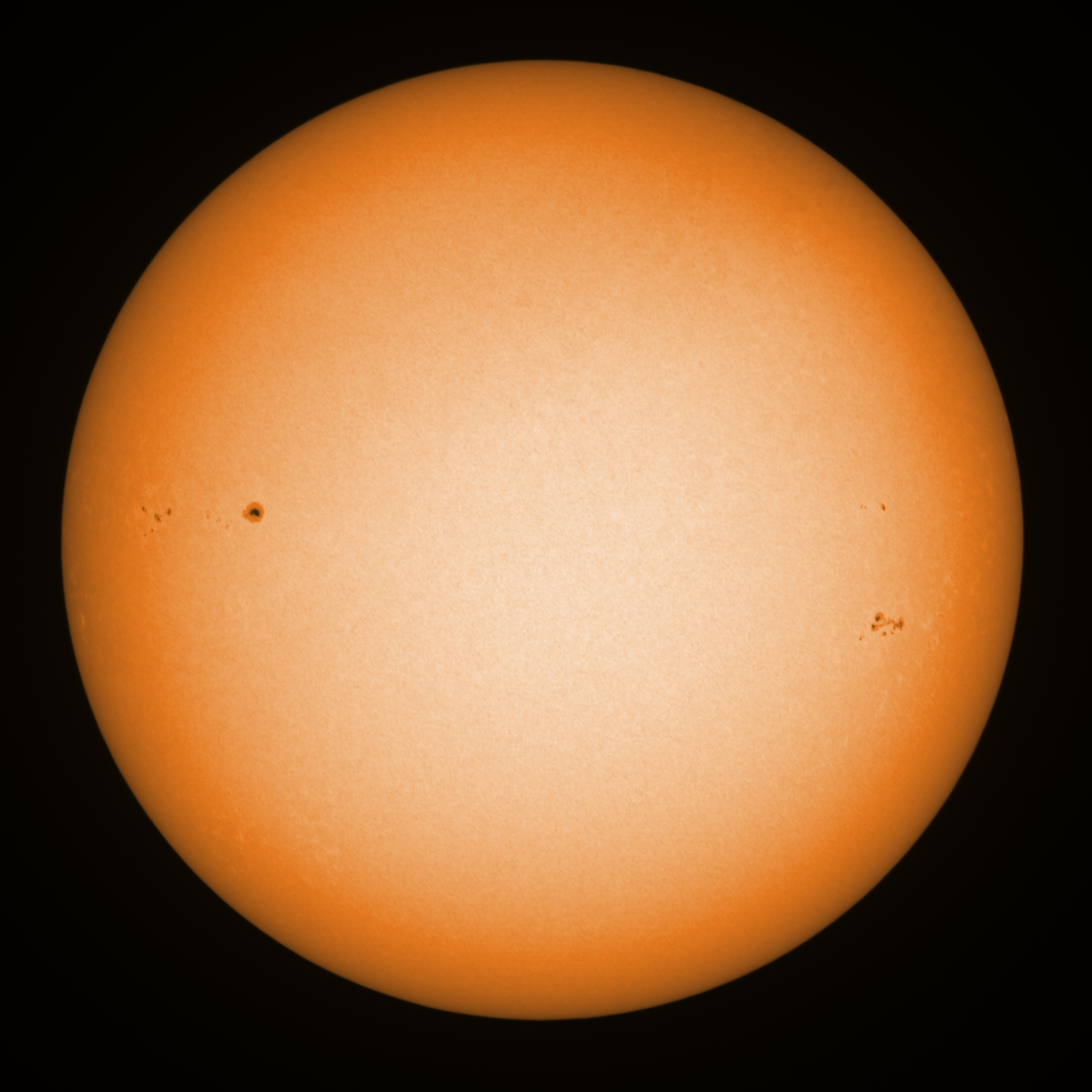 Observation date/time: 27 October 13:47 UTC Telescope: GTT60 (Galileo Type Telescope) Focal length: 1490mm (plano convex singlet) Aperture: 60mm Stop: 30mm Eyepiece: -75mm (plano concave singlet, 24mm aperture) Observation type: projection (346mm distance, 80mm diameter) Reference: Earth's rotation axis Exposure (transparency): 0.220ms Seeing (SSSMon): 0.6-1.5" (0.5" at best) =================================================================== Total number of sunspots: 10 | |