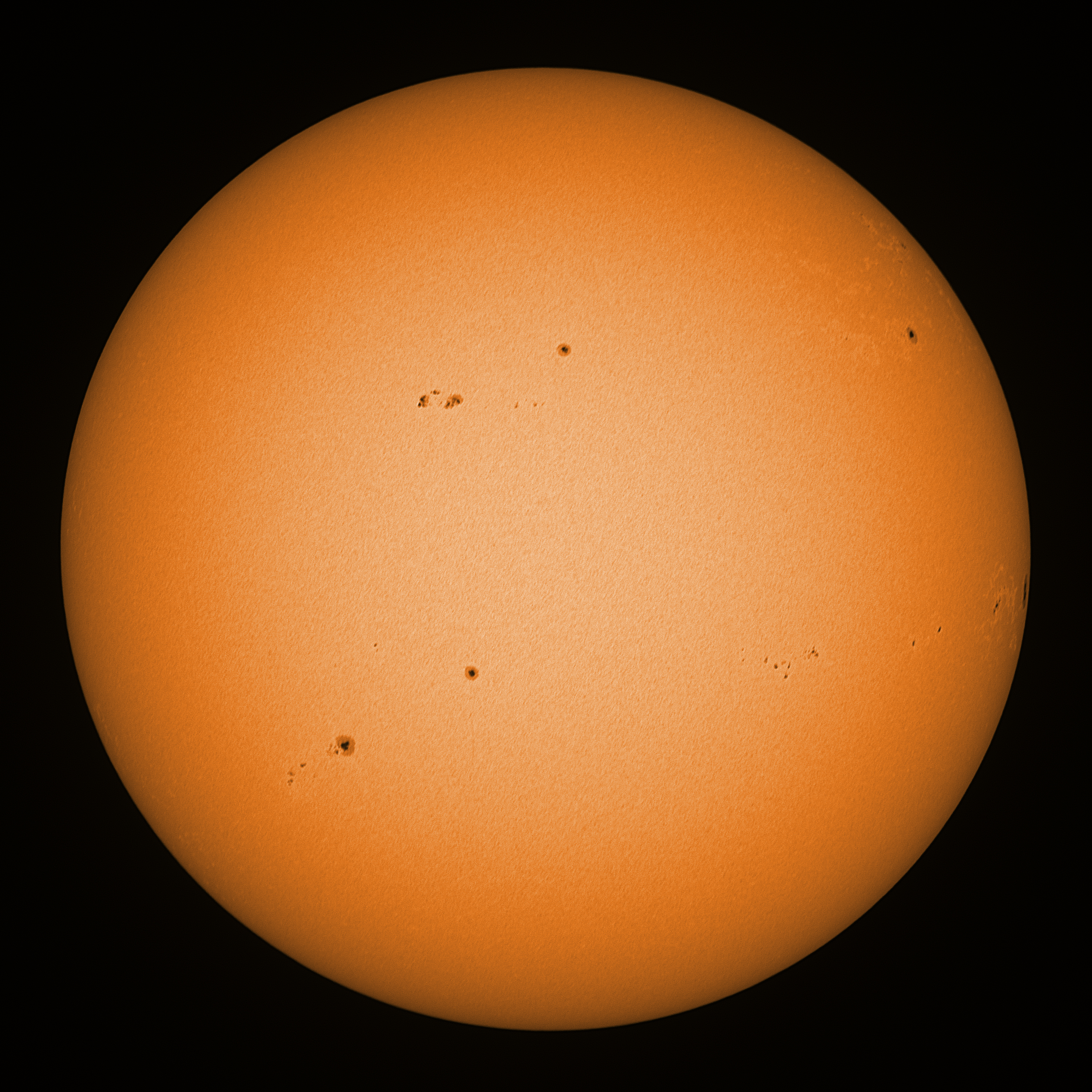 Observation date/time: 13 December 09:29 UTC Telescope: GTT60 (Galileo Type Telescope) Focal length: 1490mm (plano convex singlet) Aperture: 60mm Stop: 30mm Eyepiece: -75mm (plano concave singlet, 24mm aperture) Observation type: projection (340mm distance, 80mm diameter) Reference: Earth's rotation axis Exposure (transparency): 0.320ms Seeing (SSSMon): 2.0-2.0" (1.0" at best) =================================================================== Total number of sunspots: 32 | |