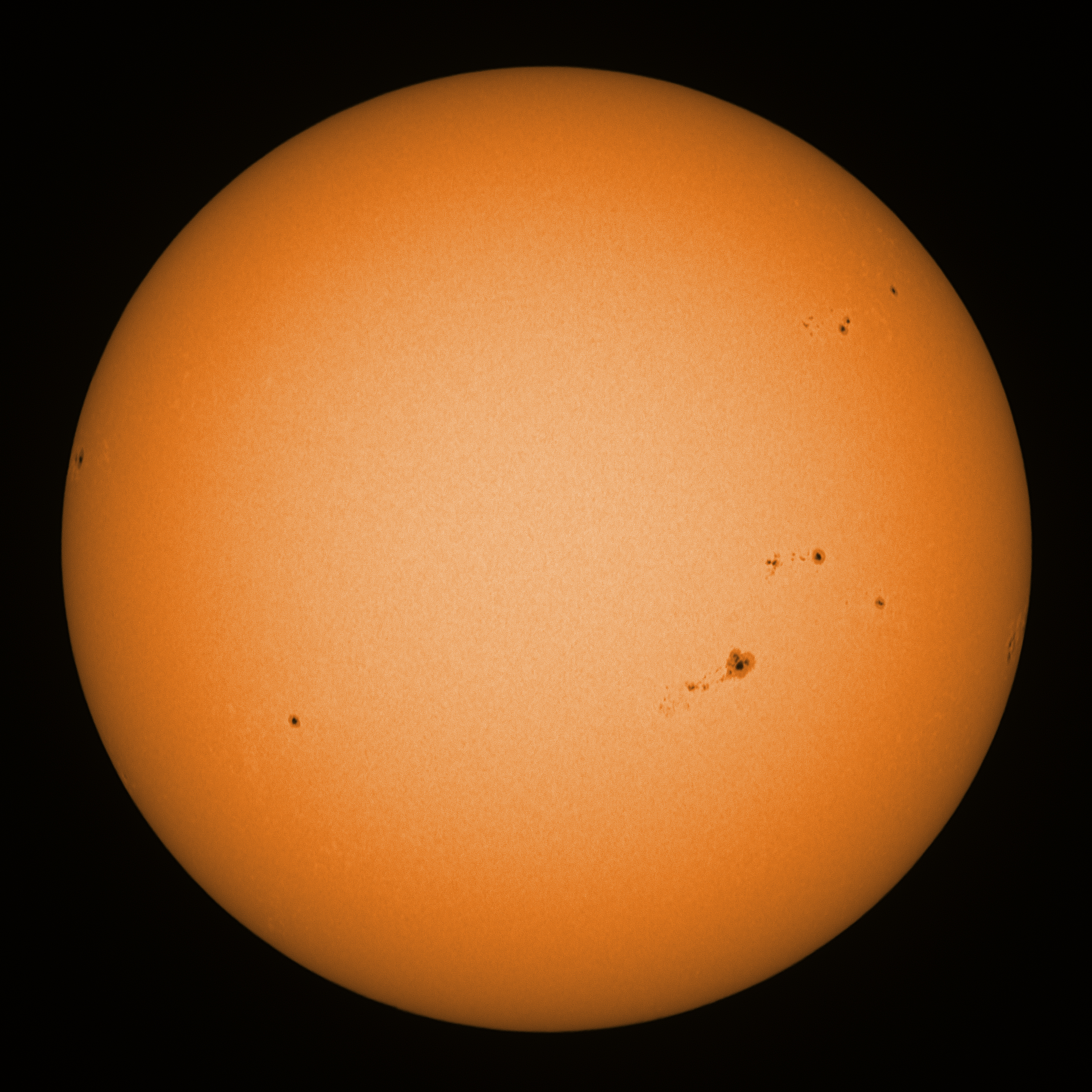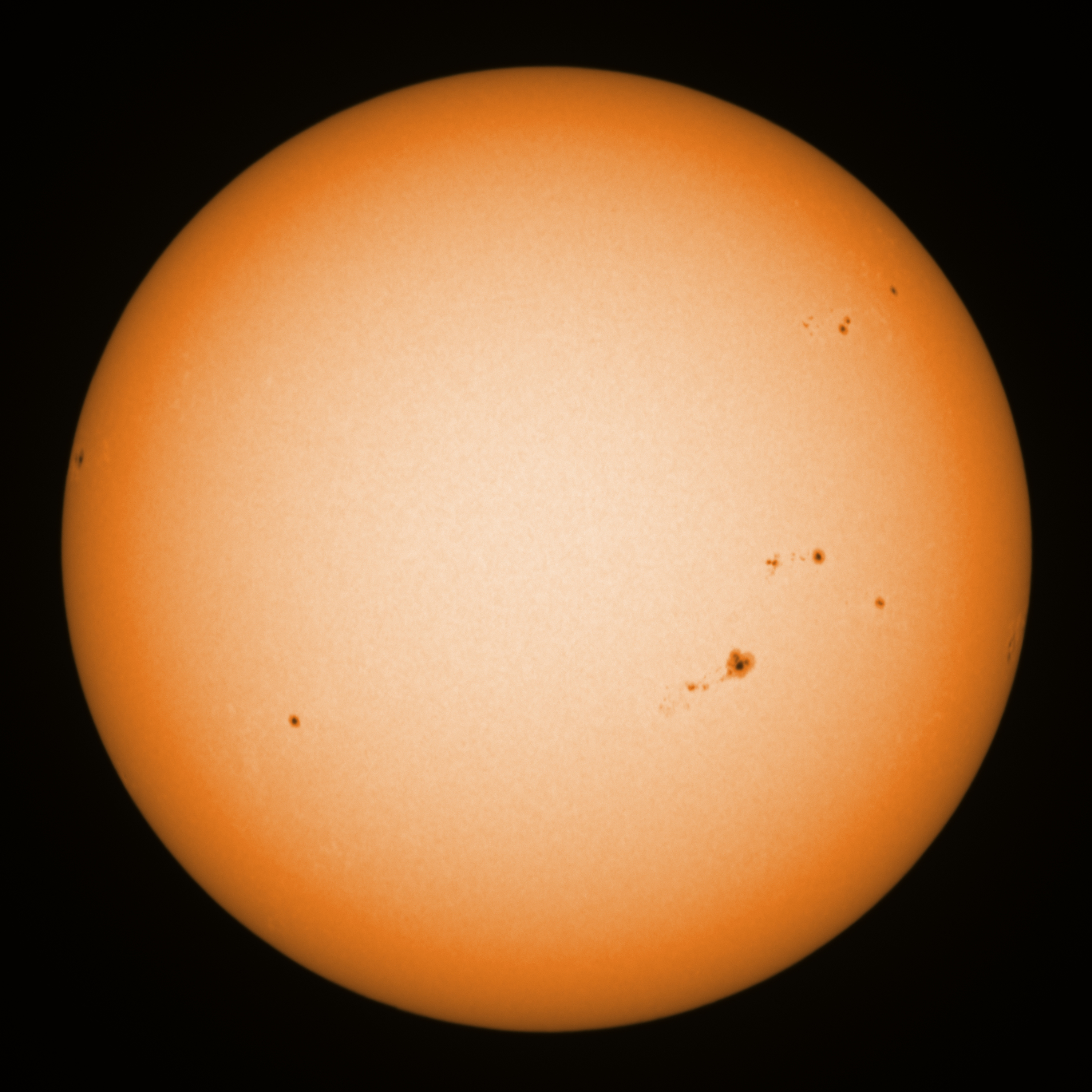 Observation date/time: 17 December 10:47 UTC Telescope: GTT60 (Galileo Type Telescope) Focal length: 1490mm (plano convex singlet) Aperture: 60mm Stop: 30mm Eyepiece: -75mm (plano concave singlet, 24mm aperture) Observation type: projection (340mm distance, 80mm diameter) Reference: Earth's rotation axis Exposure (transparency): 0.310ms Seeing (SSSMon): 1.5" (1.0" at best) =================================================================== Total number of sunspots: 28 | |