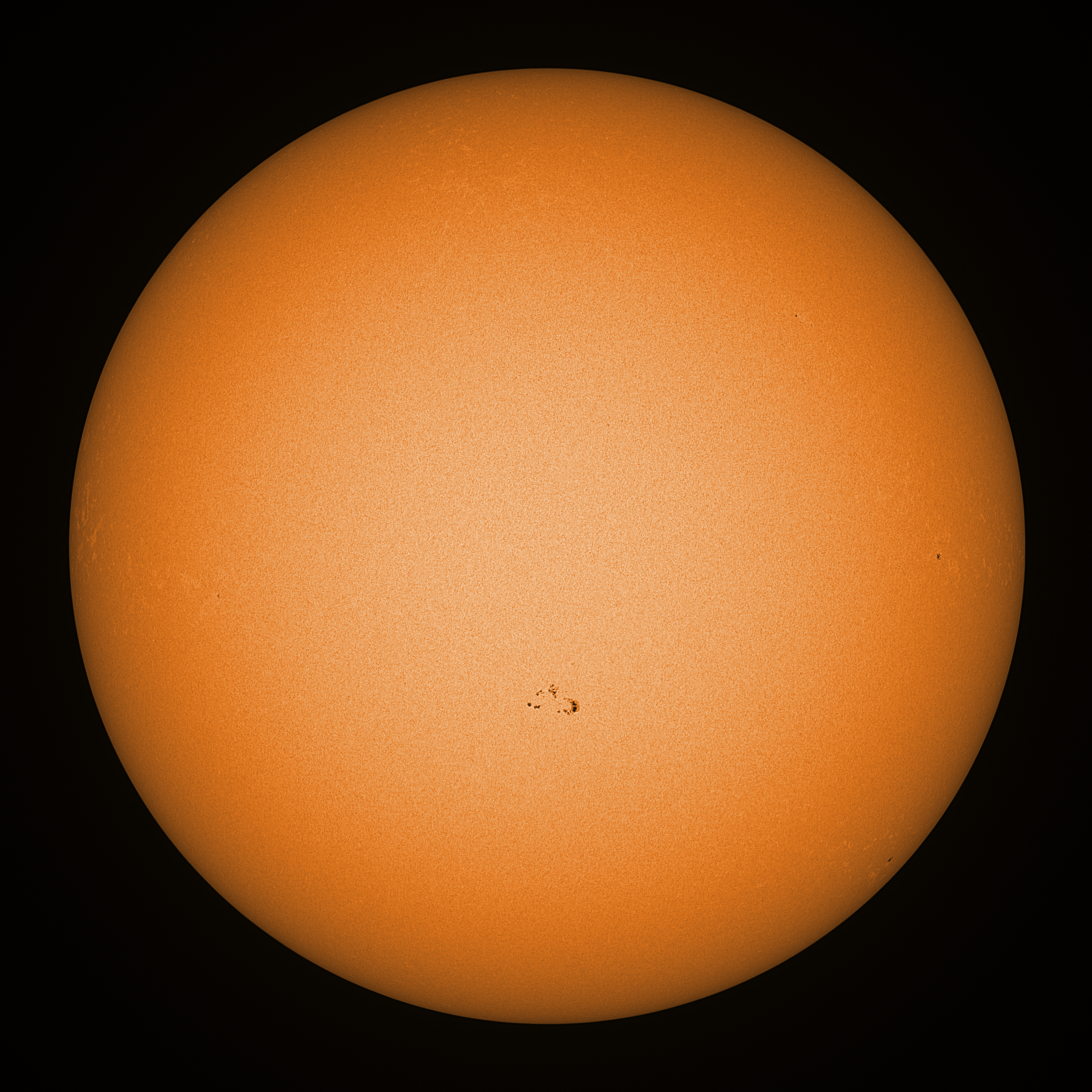Observation date/time: 03 April 2023 09:06 UTC Telescope: GTT60 (Galileo Type Telescope) Focal length: 1490mm (plano convex singlet) Aperture: 60mm Stop: 30mm Eyepiece: -75mm (plano concave singlet, 24mm aperture) Observation type: projection (343mm distance, 80mm diameter) Reference: Earth's rotation axis Exposure (transparency): 0.500ms (using 82nm bandwidth green filter) Seeing (SSSMon): 3.5"-4.5" (2.5" at best) =================================================================== Total number of sunspots: 16 | |