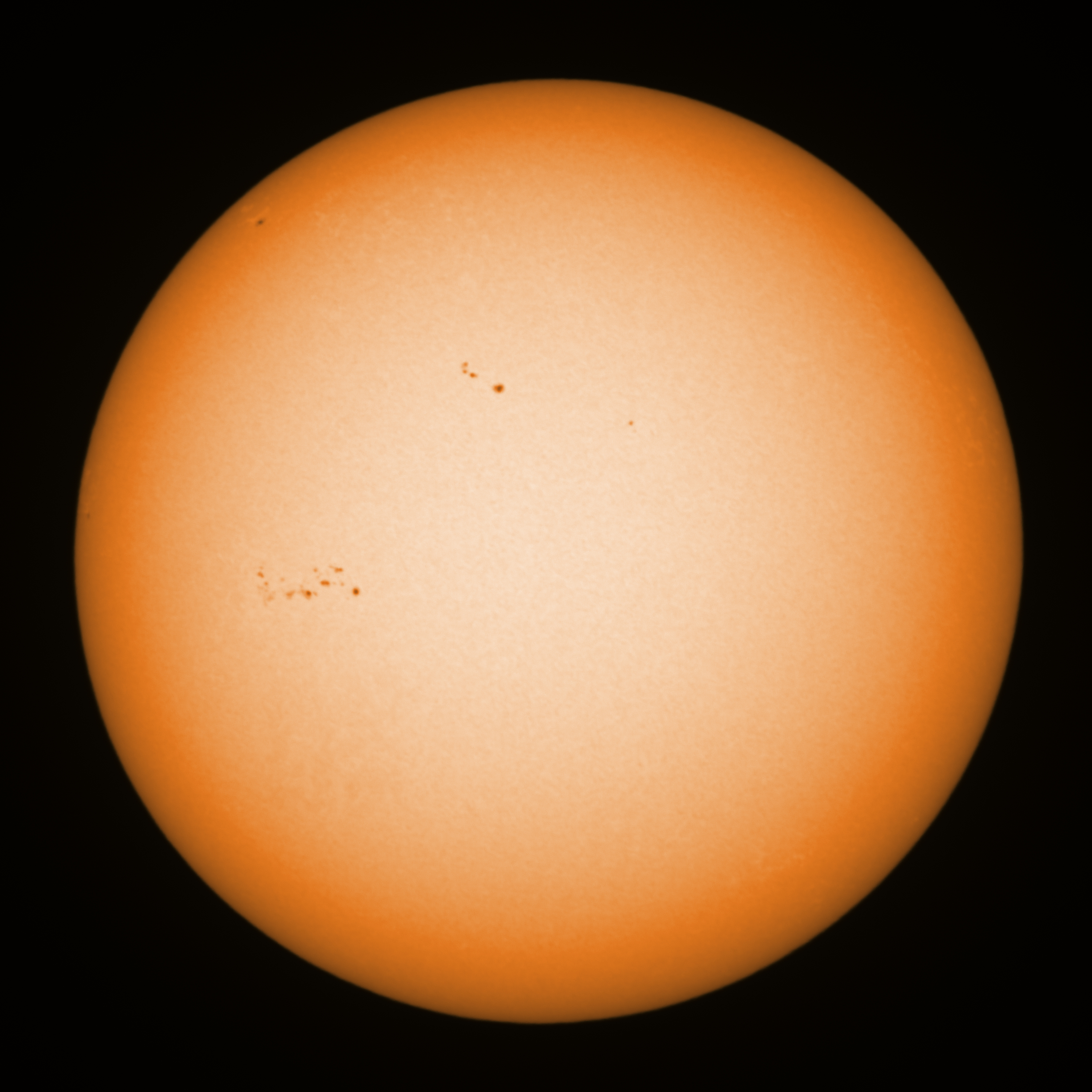 Observation date/time: 10 April 2023 17:45 UTC Telescope: GTT60 (Galileo Type Telescope) Focal length: 1490mm (plano convex singlet) Aperture: 60mm Stop: 30mm Eyepiece: -75mm (plano concave singlet, 24mm aperture) Observation type: projection (345mm distance, 80mm diameter) Reference: Earth's rotation axis Exposure (transparency): 4.650ms (using 82nm bandwidth green filter) Seeing (SSSMon): 1.0"-3.5" (0.5" at best) =================================================================== Total number of sunspots: 18 | |