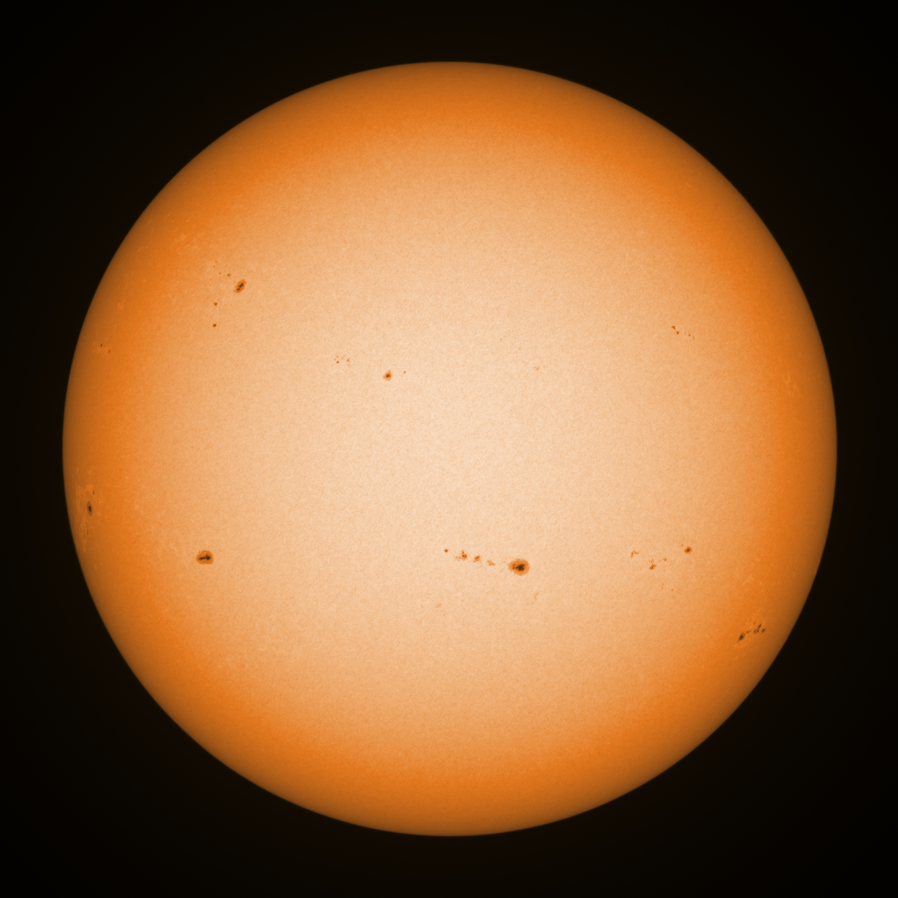 Observation date/time: 20 June 2023 08:21 UTC Telescope: GTT60 (Galileo Type Telescope) Focal length: 1490mm (plano convex singlet) Aperture: 60mm Stop: 30mm Eyepiece: -75mm (plano concave singlet, 24mm aperture) Observation type: projection (352mm distance, 80mm diameter) Reference: Earth's rotation axis Exposure (transparency): 0.650ms (using 82nm bandwidth green filter) Seeing (SSSMon): 3.5"-4.5" (3.0" at best) =================================================================== Total number of sunspots: 41 | |