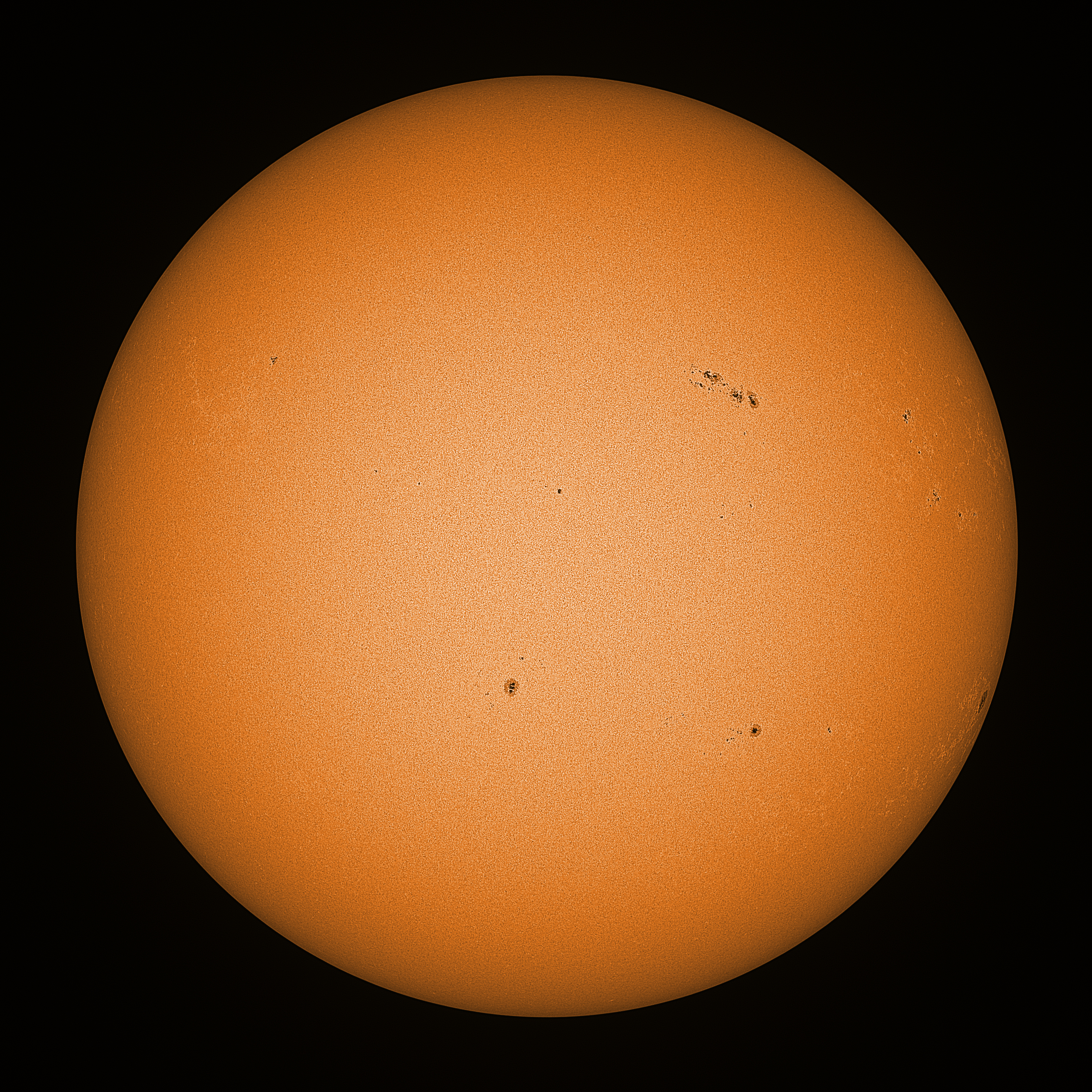 Observation date/time: 25 June 2023 08:32 UTC Telescope: GTT60 (Galileo Type Telescope) Focal length: 1490mm (plano convex singlet) Aperture: 60mm Stop: 30mm Eyepiece: -75mm (plano concave singlet, 24mm aperture) Observation type: projection (352mm distance, 80mm diameter) Reference: Earth's rotation axis Exposure (transparency): 0.400ms (using 82nm bandwidth green filter) Seeing (SSSMon): 1.5"-2.5" (1.0" at best) =================================================================== Total number of sunspots: 37 | |
