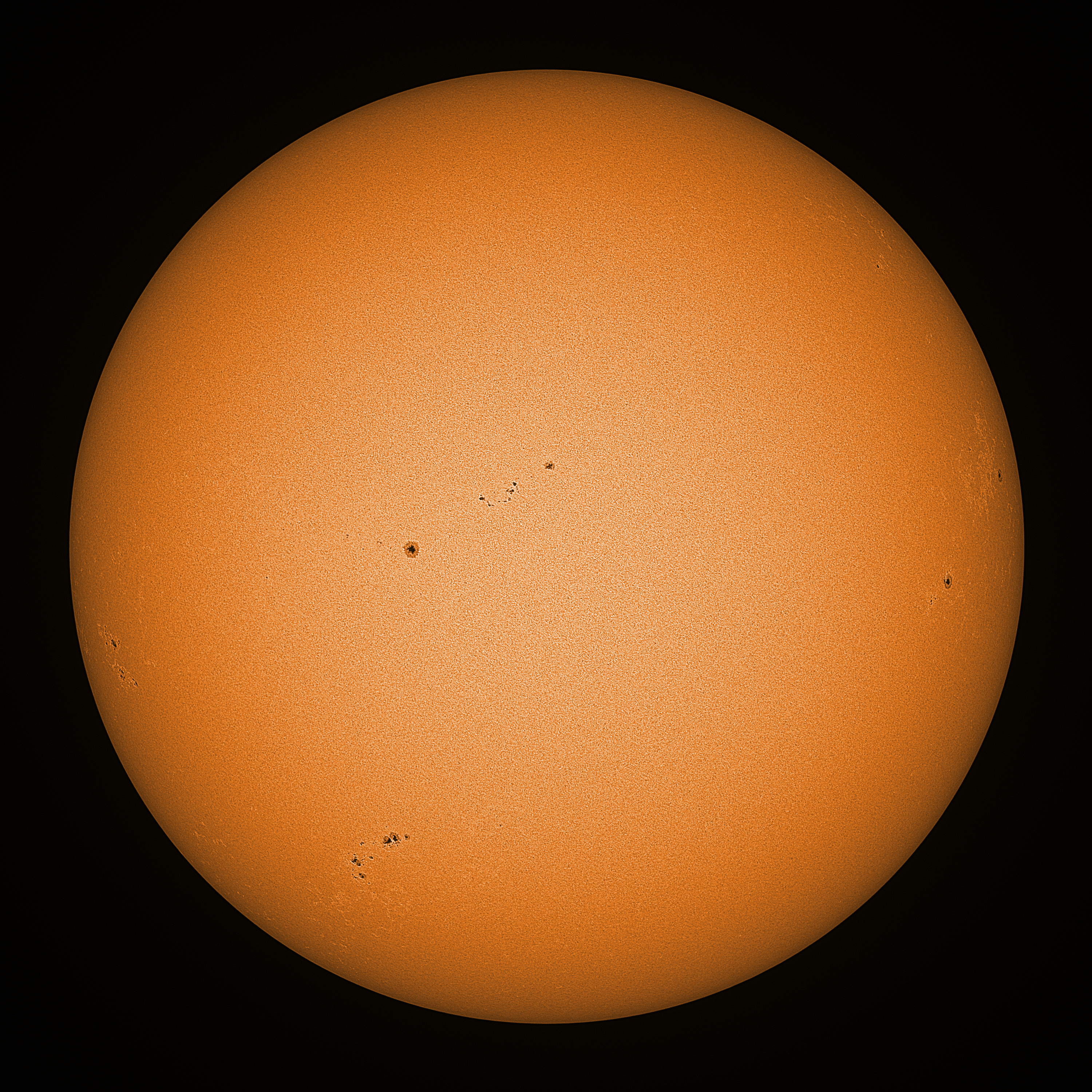 Observation date/time: 30 September 2023 09:09 UTC Telescope: GTT60 (Galileo Type Telescope) Focal length: 1490mm (plano convex singlet) Aperture: 60mm Stop: 30mm Eyepiece: -75mm (plano concave singlet, 24mm aperture) Observation type: projection (349mm distance, 80mm diameter) Reference: Earth's rotation axis Exposure (transparency): 0.550ms (using 82nm bandwidth green filter) Seeing (SSSMon): 2.5-3.0" (1.2" at best) =================================================================== Total number of sunspots: 26 | |