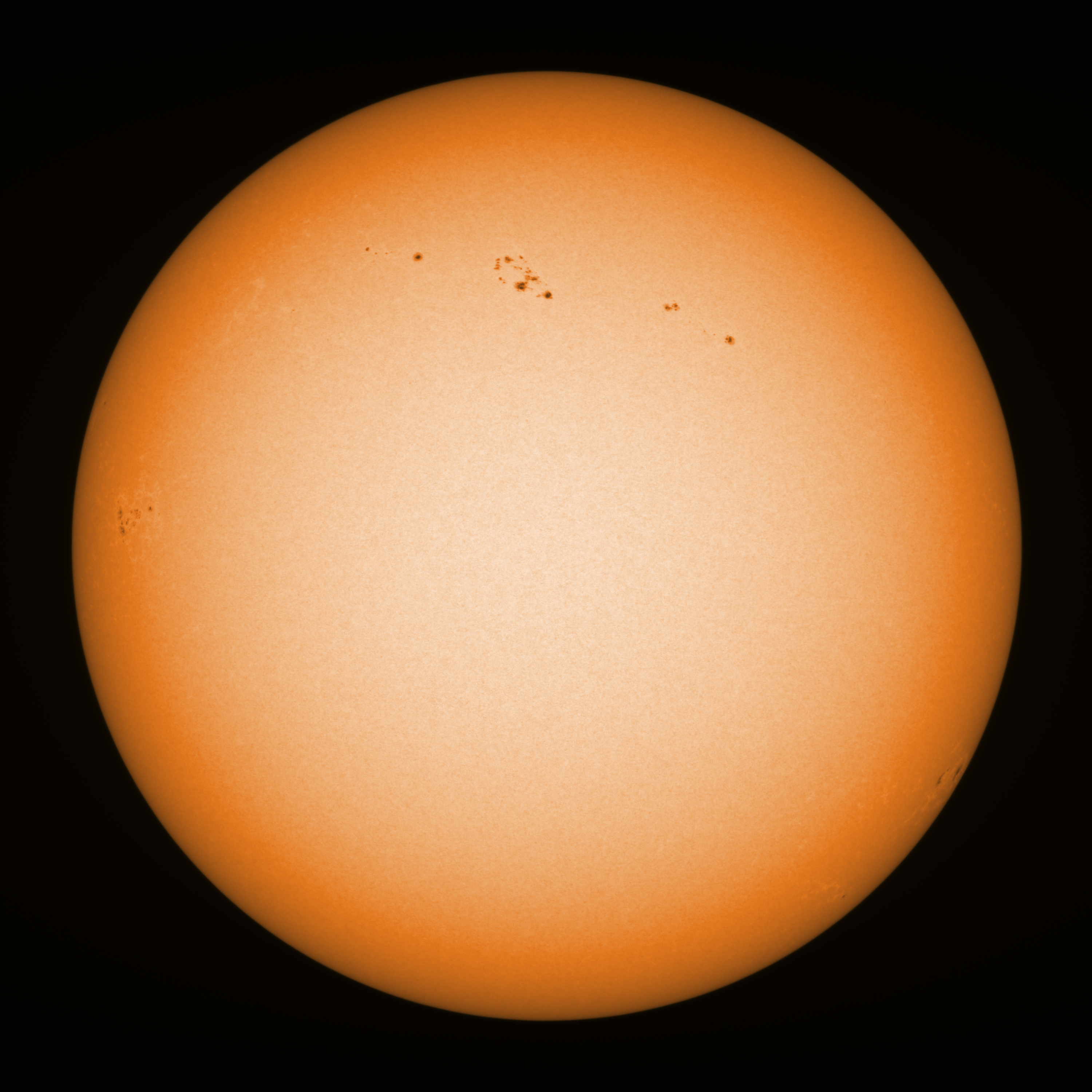 Observation date/time: 02 May 2024 10:29 UTC Telescope: GTT60 (Galileo Type Telescope) Focal length: 1490mm (plano convex singlet) Aperture: 60mm Stop: 30mm Eyepiece: -75mm (plano concave singlet, 24mm aperture) Observation type: projection (347mm distance, 80mm diameter) Reference: Earth's rotation axis Exposure (transparency): 0.400ms (using 82nm bandwidth green filter) Seeing (SSSMon): 4.5-5.0" (3.0" at best) =================================================================== Total number of sunspots: 29 | |
