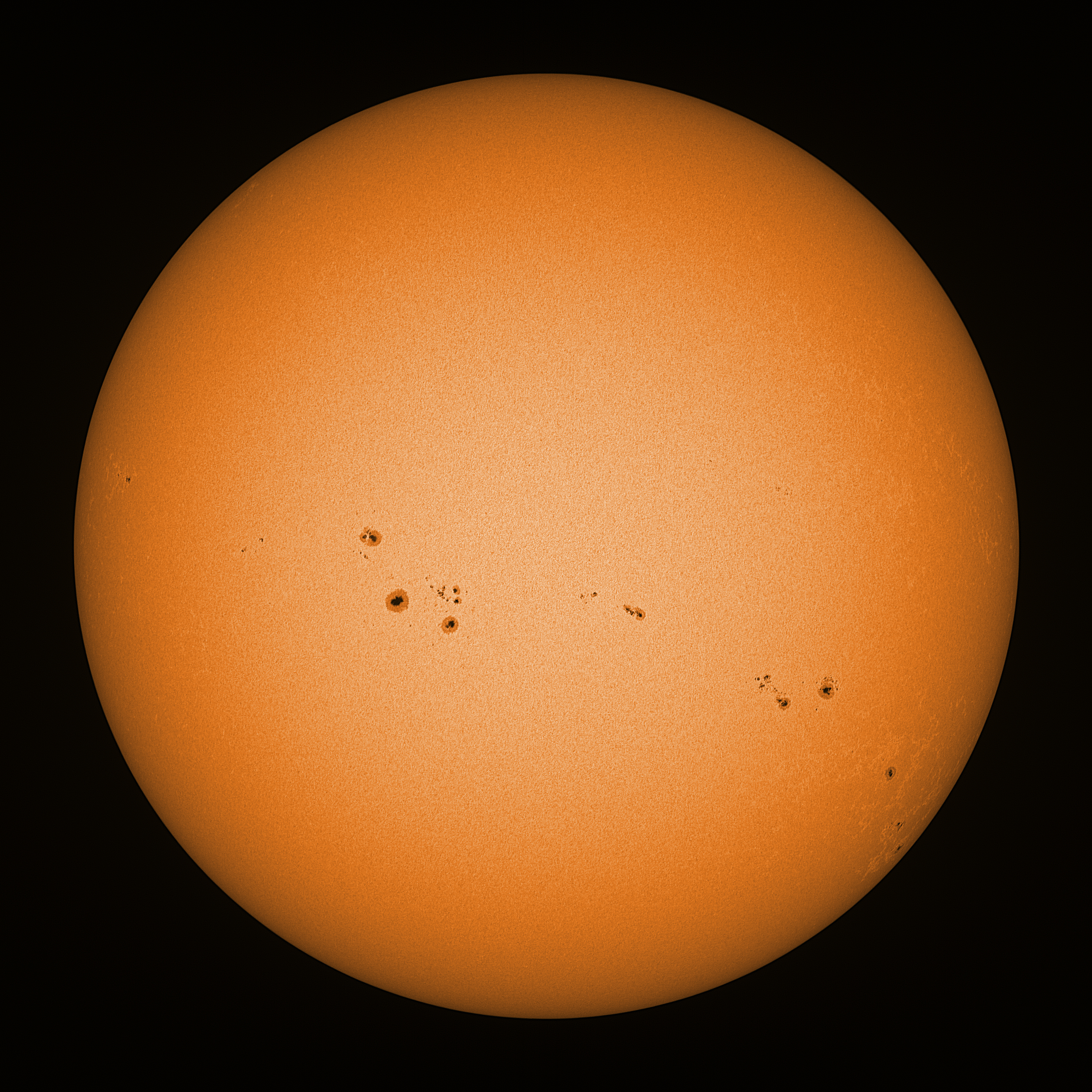 Observation date/time: 21 May 2024 08:17 UTC Telescope: GTT60 (Galileo Type Telescope) Focal length: 1490mm (plano convex singlet) Aperture: 60mm Stop: 30mm Eyepiece: -75mm (plano concave singlet, 24mm aperture) Observation type: projection (349mm distance, 80mm diameter) Reference: Earth's rotation axis Exposure (transparency): 0.500ms (using 82nm bandwidth green filter) Seeing (SSSMon): 5.5-6.0" (3.0" at best) =================================================================== Total number of sunspots: 35 | |