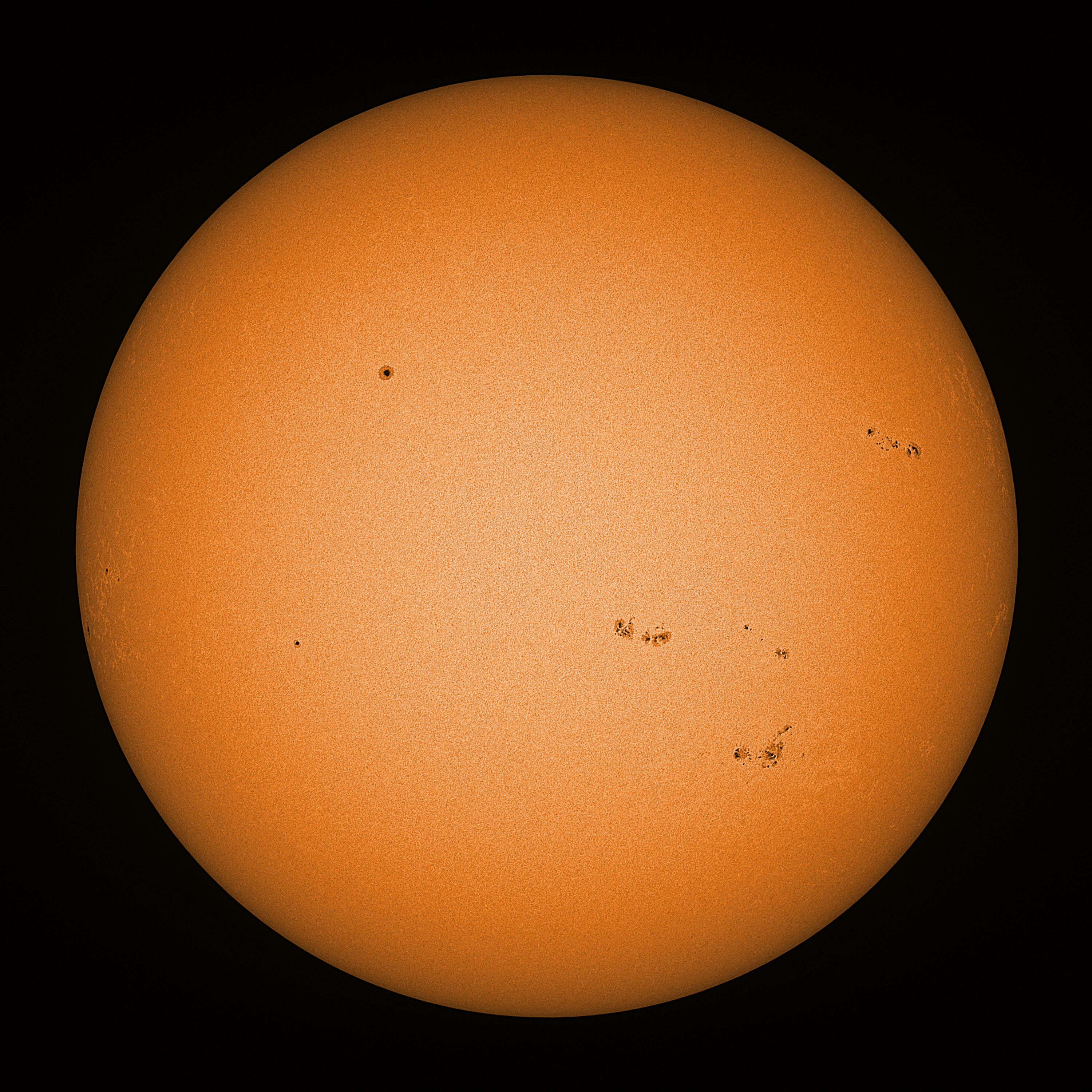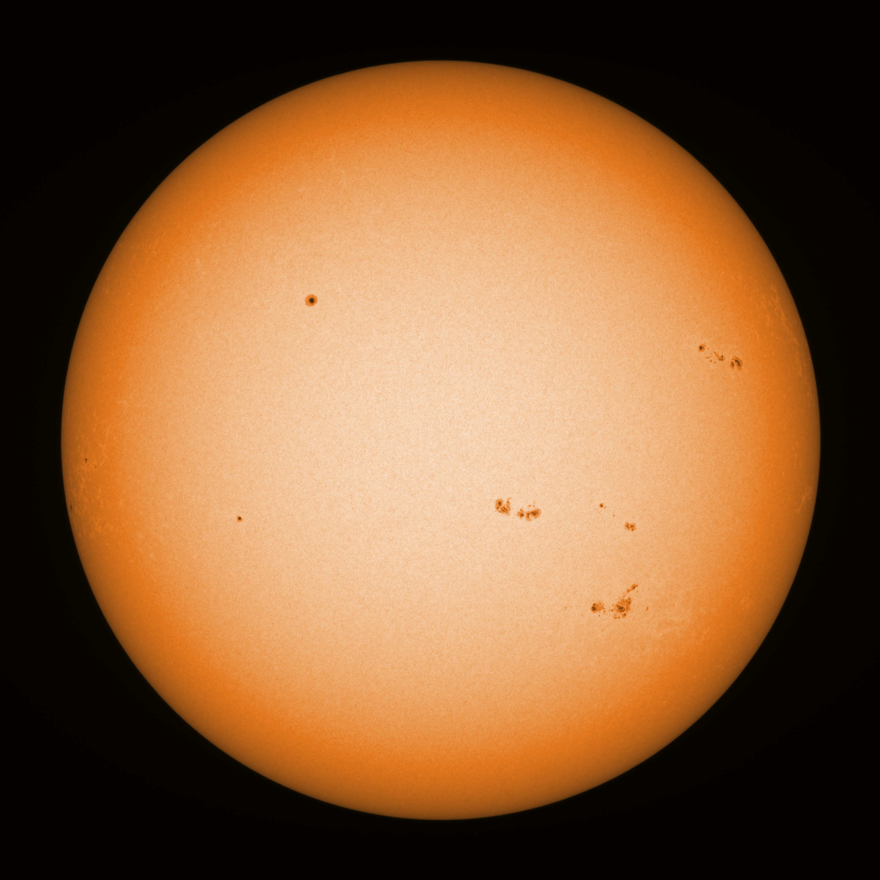 Observation date/time: 06 June 2024 08:36 UTC Telescope: GTT60 (Galileo Type Telescope) Focal length: 1490mm (plano convex singlet) Aperture: 60mm Stop: 30mm Eyepiece: -75mm (plano concave singlet, 24mm aperture) Observation type: projection (349mm distance, 80mm diameter) Reference: Earth's rotation axis Exposure (transparency): 0.400ms (using 82nm bandwidth green filter) Seeing (SSSMon): 3.0-4.0" (2.5" at best) =================================================================== Total number of sunspots: 42 | |