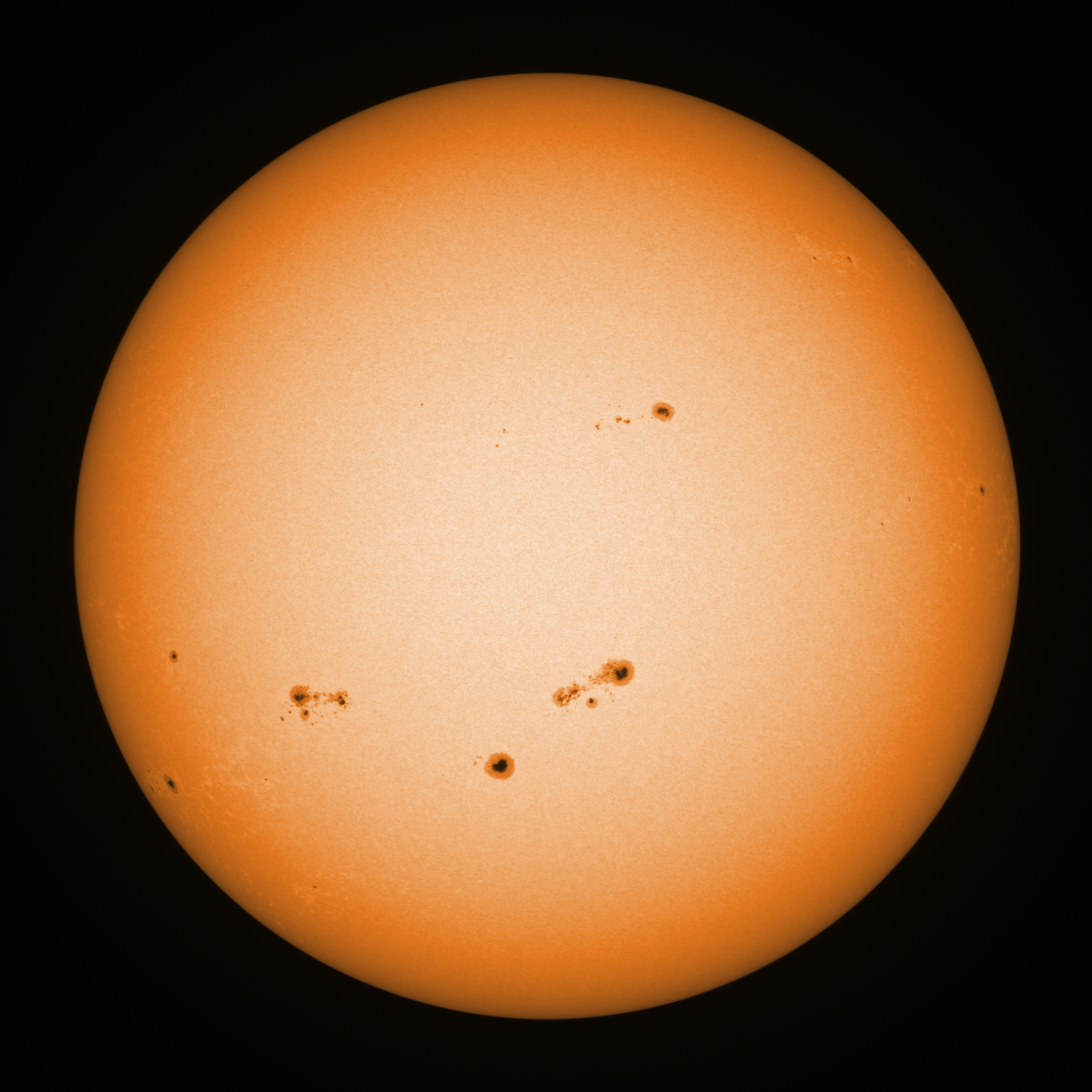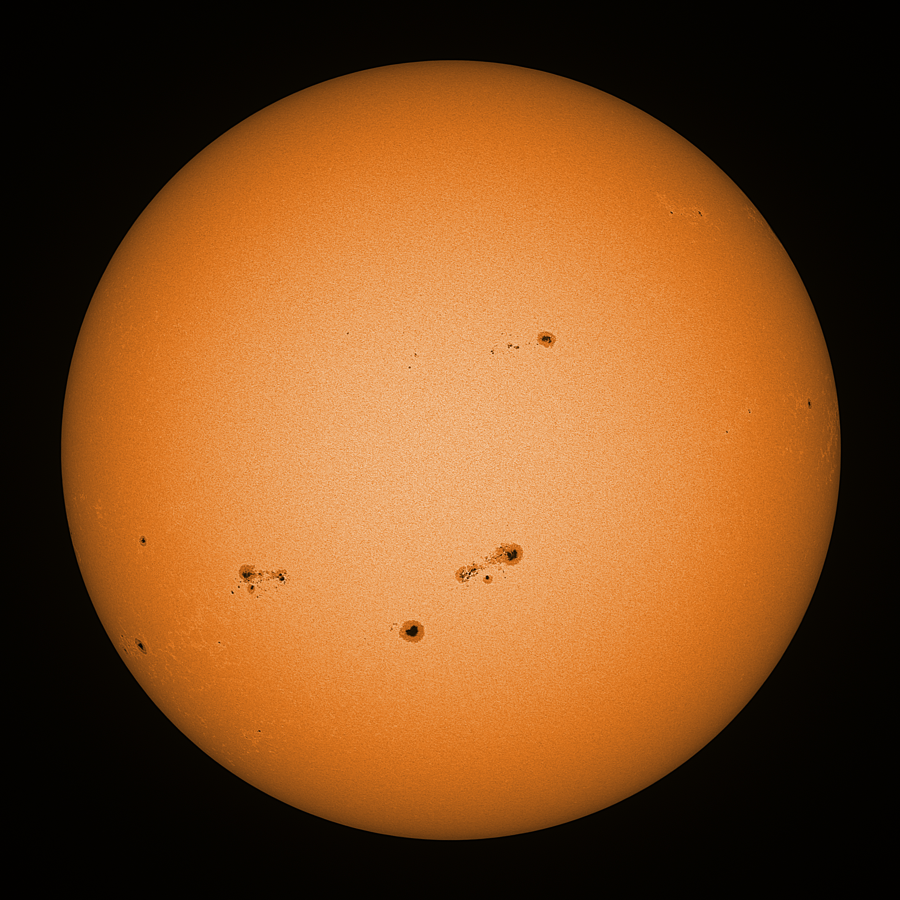 Observation date/time: 21 August 2024 10:56 UTC Telescope: GTT60 (Galileo Type Telescope) Focal length: 1490mm (plano convex singlet) Aperture: 60mm Stop: 30mm Eyepiece: -75mm (plano concave singlet, 24mm aperture) Observation type: projection (349mm distance, 80mm diameter) Reference: Earth's rotation axis Exposure (transparency): 0.360ms (using 82nm bandwidth green filter) Seeing (SSSMon): 3.0-4.0" (2.5" at best) =================================================================== Total number of sunspots: 54 | |