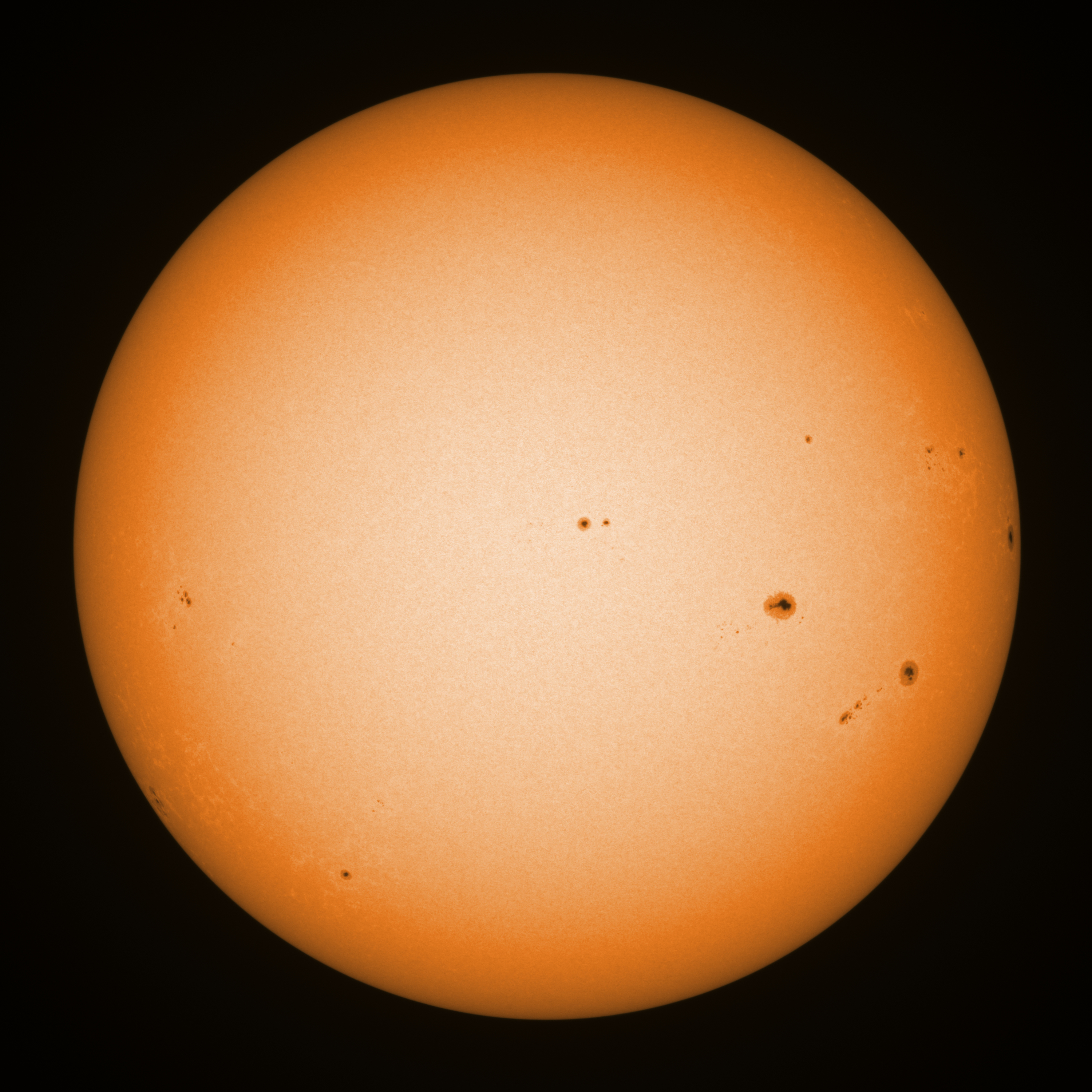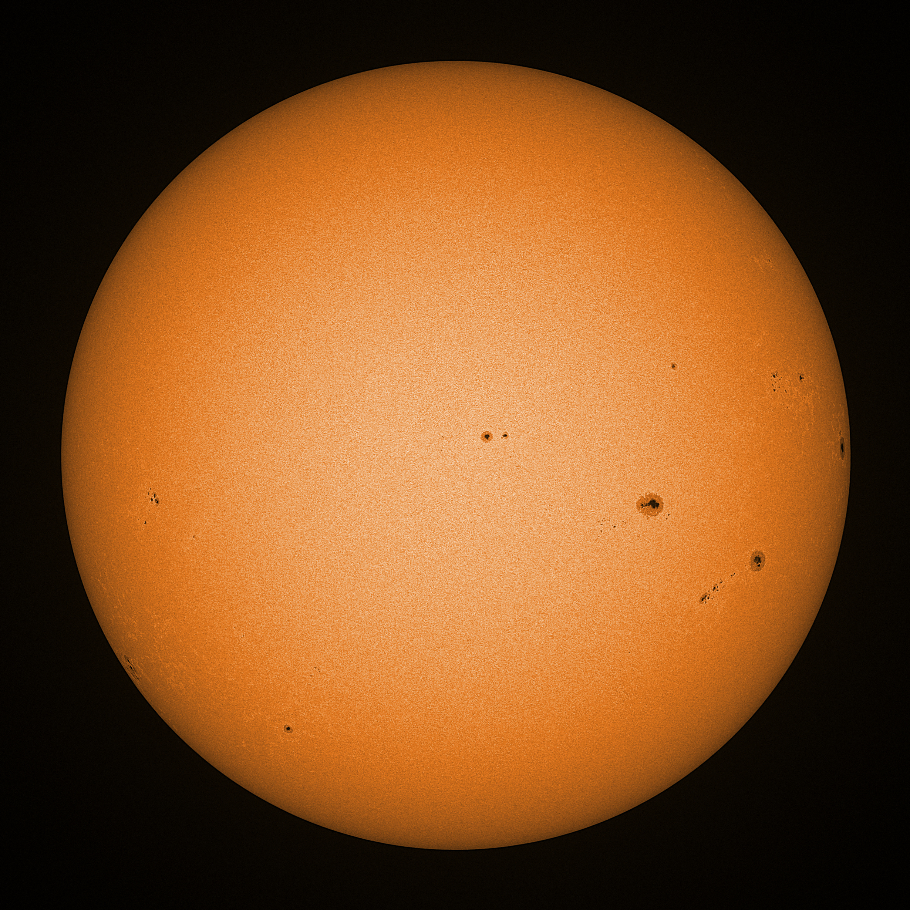 Observation date/time: 28 August 2024 08:33 UTC Telescope: GTT60 (Galileo Type Telescope) Focal length: 1490mm (plano convex singlet) Aperture: 60mm Stop: 30mm Eyepiece: -75mm (plano concave singlet, 24mm aperture) Observation type: projection (348mm distance, 80mm diameter) Reference: Earth's rotation axis Exposure (transparency): 0.630ms (using 82nm bandwidth green filter) Seeing (SSSMon): 3.5-4.5" (2.0" at best) =================================================================== Total number of sunspots: 30 | |