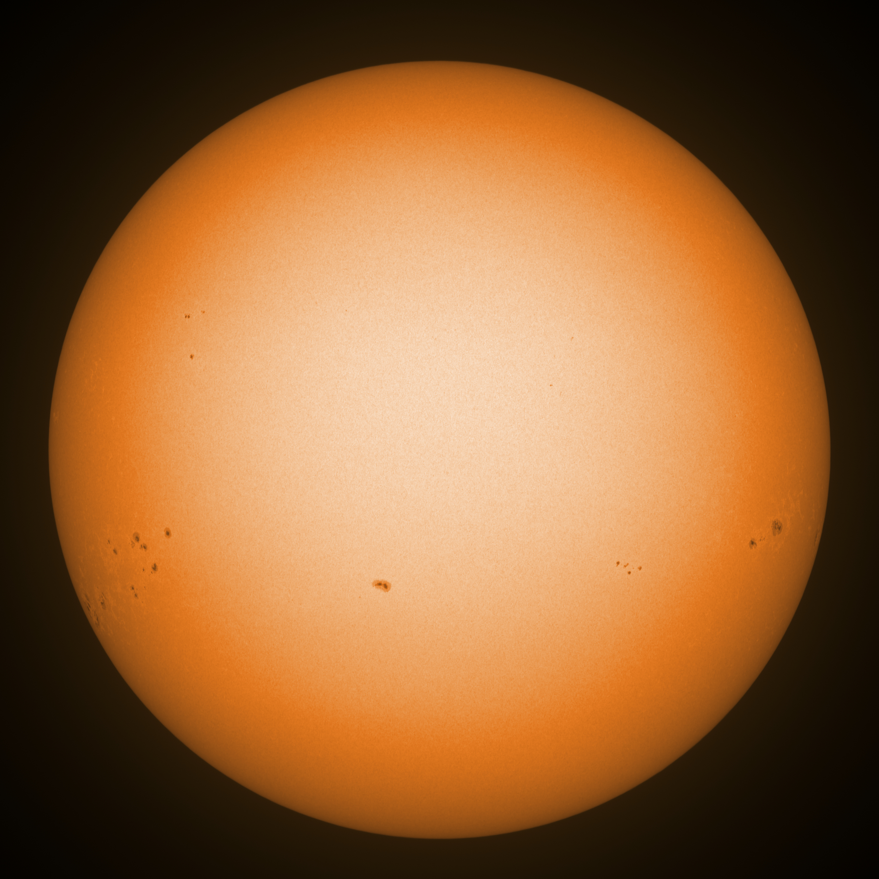 Observation date/time: 20 December 2024 10:29 UTC Telescope: GTT60 (Galileo Type Telescope) Focal length: 1490mm (plano convex singlet) Aperture: 60mm Stop: 30mm Eyepiece: -75mm (plano concave singlet, 24mm aperture) Observation type: projection (342mm distance, 80mm diameter) Reference: Earth's rotation axis Exposure (transparency): 1.980ms (using 82nm bandwidth green filter) Seeing (SSSMon): 1.2-1.8" (0.7" at best) =================================================================== Total number of sunspots: 31 | |