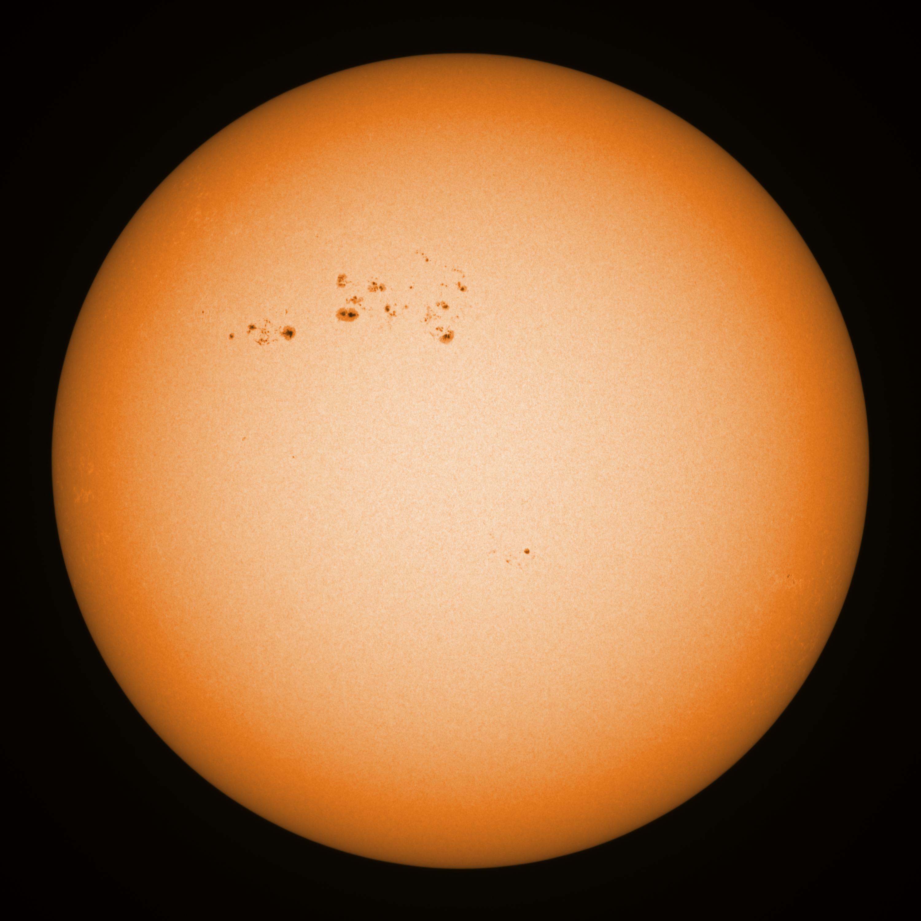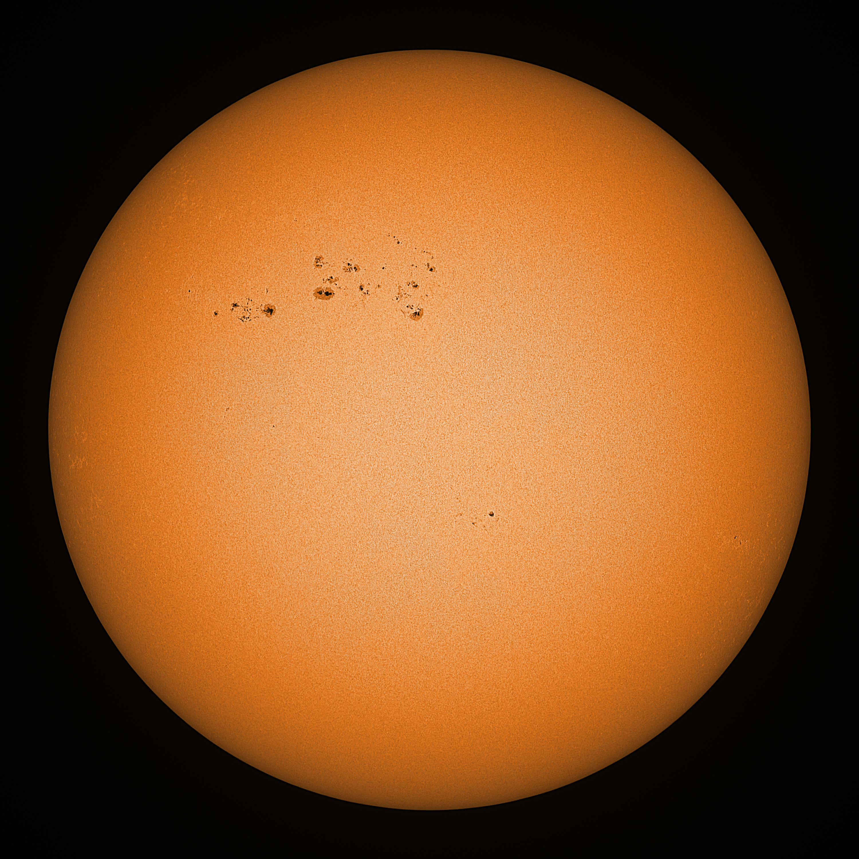 Observation date/time: 02 February 2025 10:20 UTC Telescope: GTT60 (Galileo Type Telescope) Focal length: 1490mm (plano convex singlet) Aperture: 60mm Stop: 30mm Eyepiece: -75mm (plano concave singlet, 24mm aperture) Observation type: projection (341mm distance, 80mm diameter) Reference: Earth's rotation axis Exposure (transparency): 0.580ms (using 82nm bandwidth green filter) Seeing (SSSMon): 2.4-2.5" (1.4" at best) =================================================================== Total number of sunspots: 59 | |