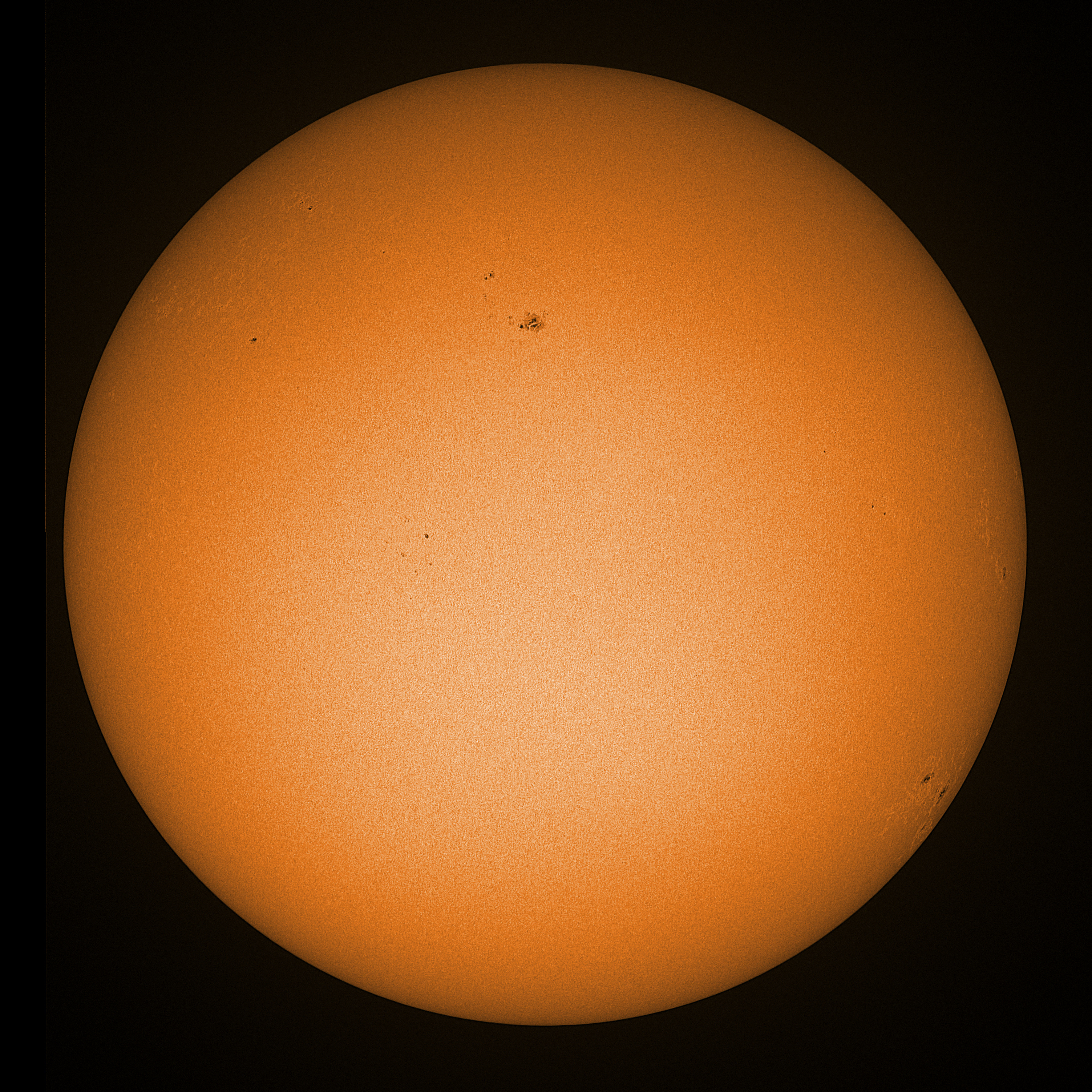 Observation date/time: 27 February 2025 12:19 UTC Telescope: GTT60 (Galileo Type Telescope) Focal length: 1490mm (plano convex singlet) Aperture: 60mm Stop: 30mm Eyepiece: -75mm (plano concave singlet, 24mm aperture) Observation type: projection (342mm distance, 80mm diameter) Reference: Earth's rotation axis Exposure (transparency): 0.630ms (using 82nm bandwidth green filter) Seeing (SSSMon): 2.5-3.0" (2.0" at best) =================================================================== Total number of sunspots: 21 | |