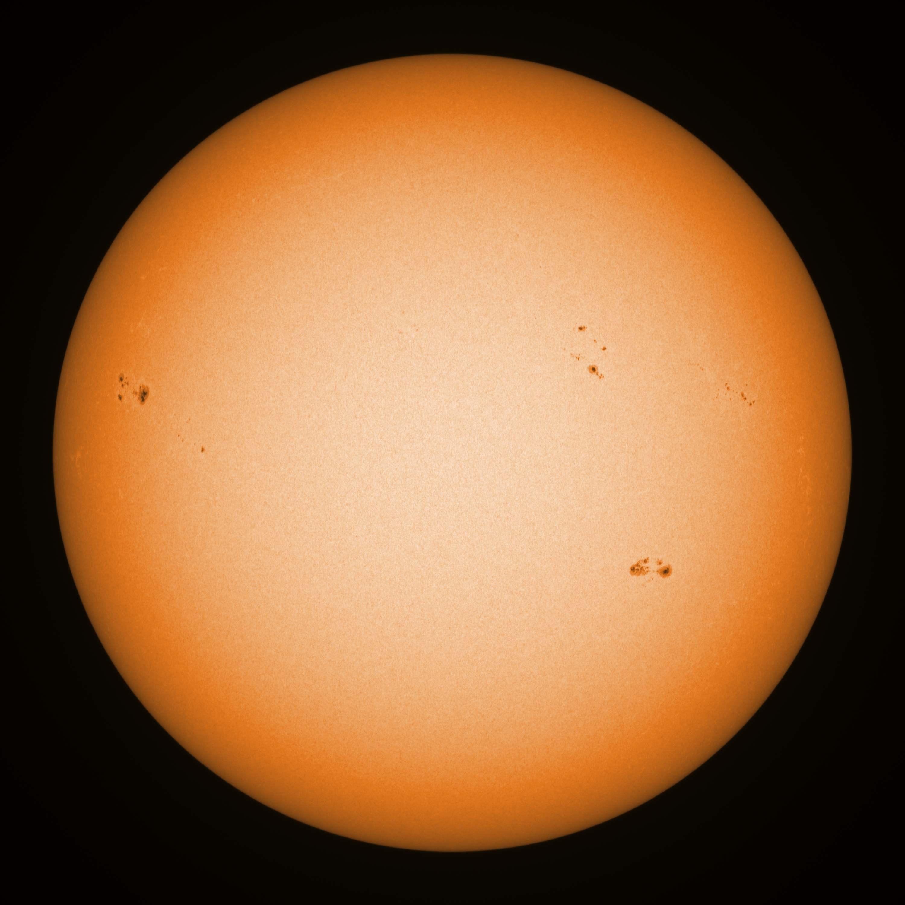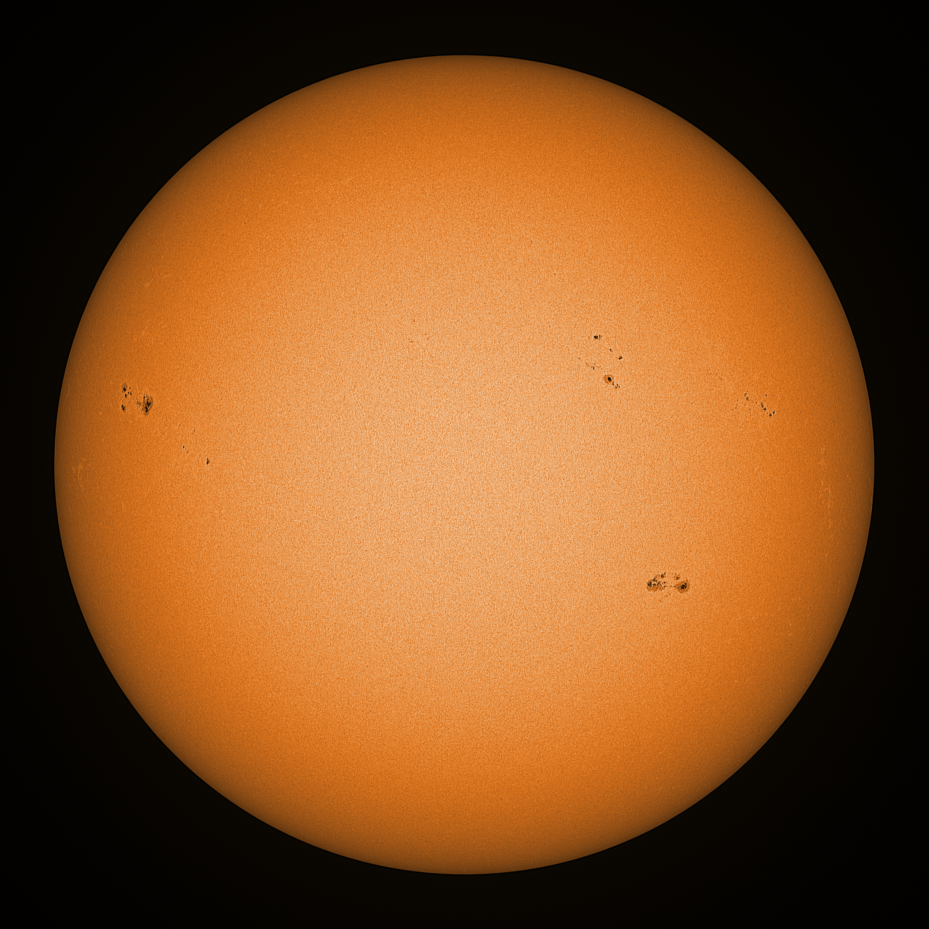 Observation date/time: 03 March 2025 09:29 UTC Telescope: GTT60 (Galileo Type Telescope) Focal length: 1490mm (plano convex singlet) Aperture: 60mm Stop: 30mm Eyepiece: -75mm (plano concave singlet, 24mm aperture) Observation type: projection (342mm distance, 80mm diameter) Reference: Earth's rotation axis Exposure (transparency): 0.830ms (using 82nm bandwidth green filter) Seeing (SSSMon): 3.0-3.5" (2.0" at best) =================================================================== Total number of sunspots: 35 | |