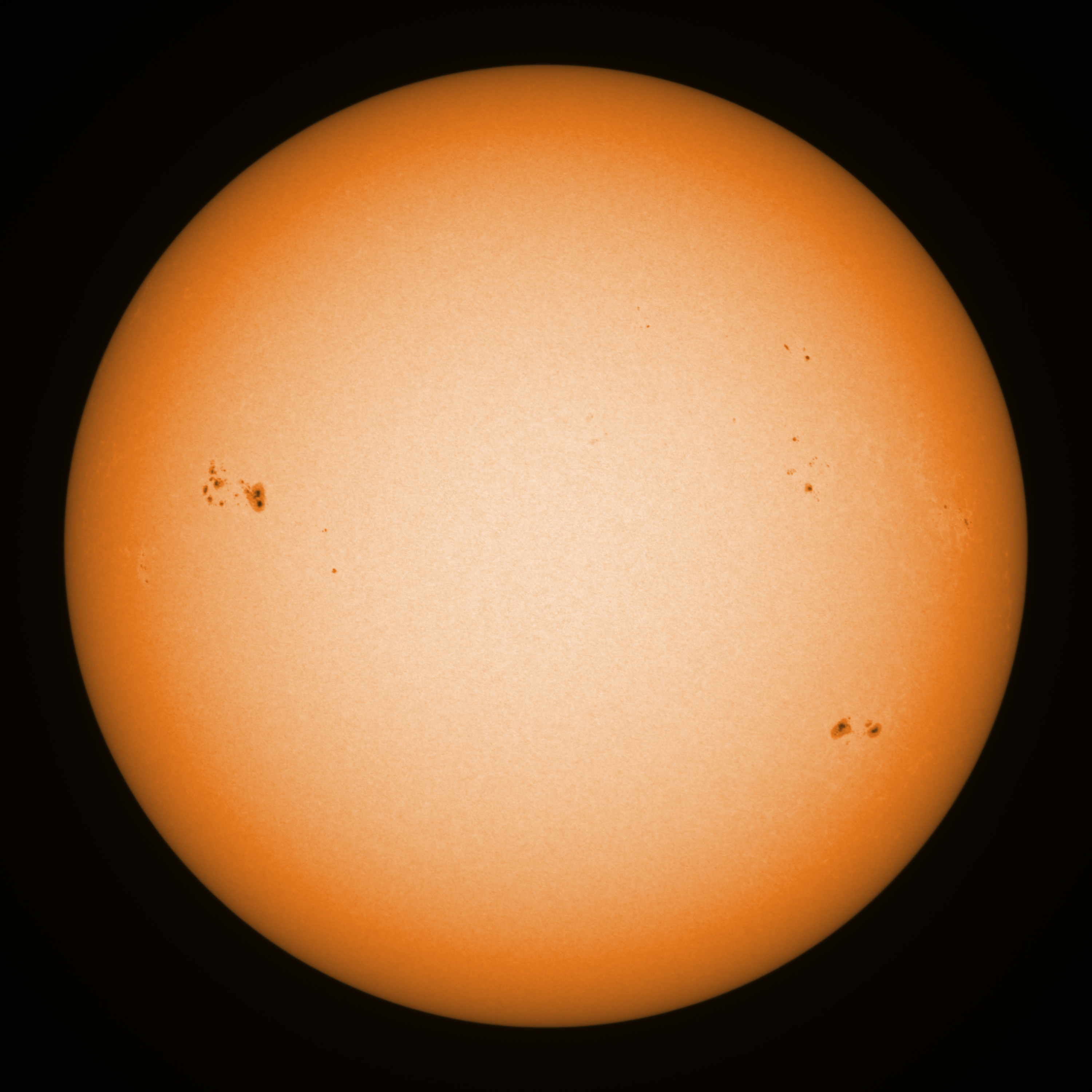 Observation date/time: 04 March 2025 09:56 UTC Telescope: GTT60 (Galileo Type Telescope) Focal length: 1490mm (plano convex singlet) Aperture: 60mm Stop: 30mm Eyepiece: -75mm (plano concave singlet, 24mm aperture) Observation type: projection (342mm distance, 80mm diameter) Reference: Earth's rotation axis Exposure (transparency): 0.530ms (using 82nm bandwidth green filter) Seeing (SSSMon): 4.5-5.5" (2.5" at best) =================================================================== Total number of sunspots: 33 | |