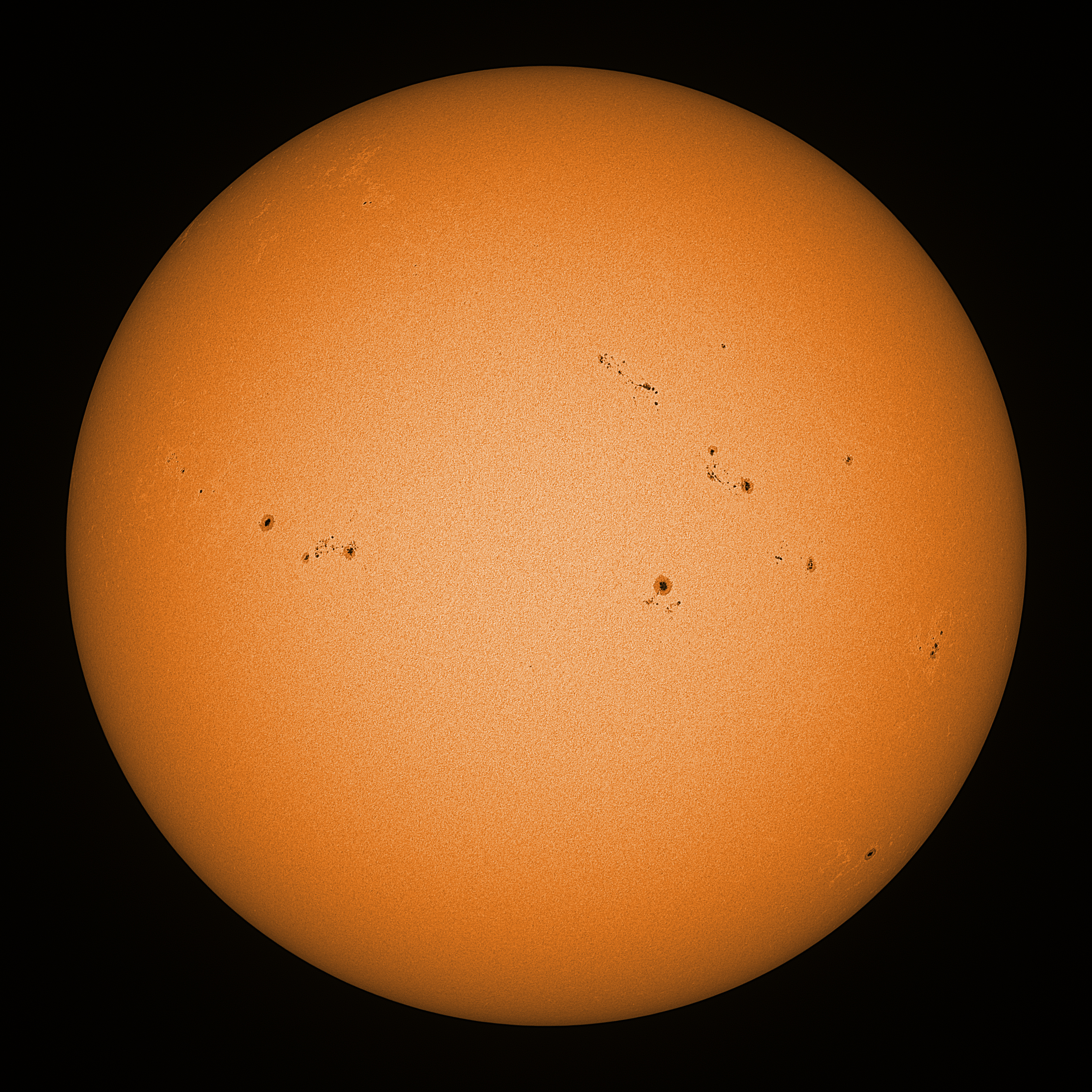 Observation date/time: 17 March 2025 09:14 UTC Telescope: GTT60 (Galileo Type Telescope) Focal length: 1490mm (plano convex singlet) Aperture: 60mm Stop: 30mm Eyepiece: -75mm (plano concave singlet, 24mm aperture) Observation type: projection (342mm distance, 80mm diameter) Reference: Earth's rotation axis Exposure (transparency): 0.430ms (using 82nm bandwidth green filter) Seeing (SSSMon): 3.5-4.5" (2.5" at best) =================================================================== Total number of sunspots: 44 | |