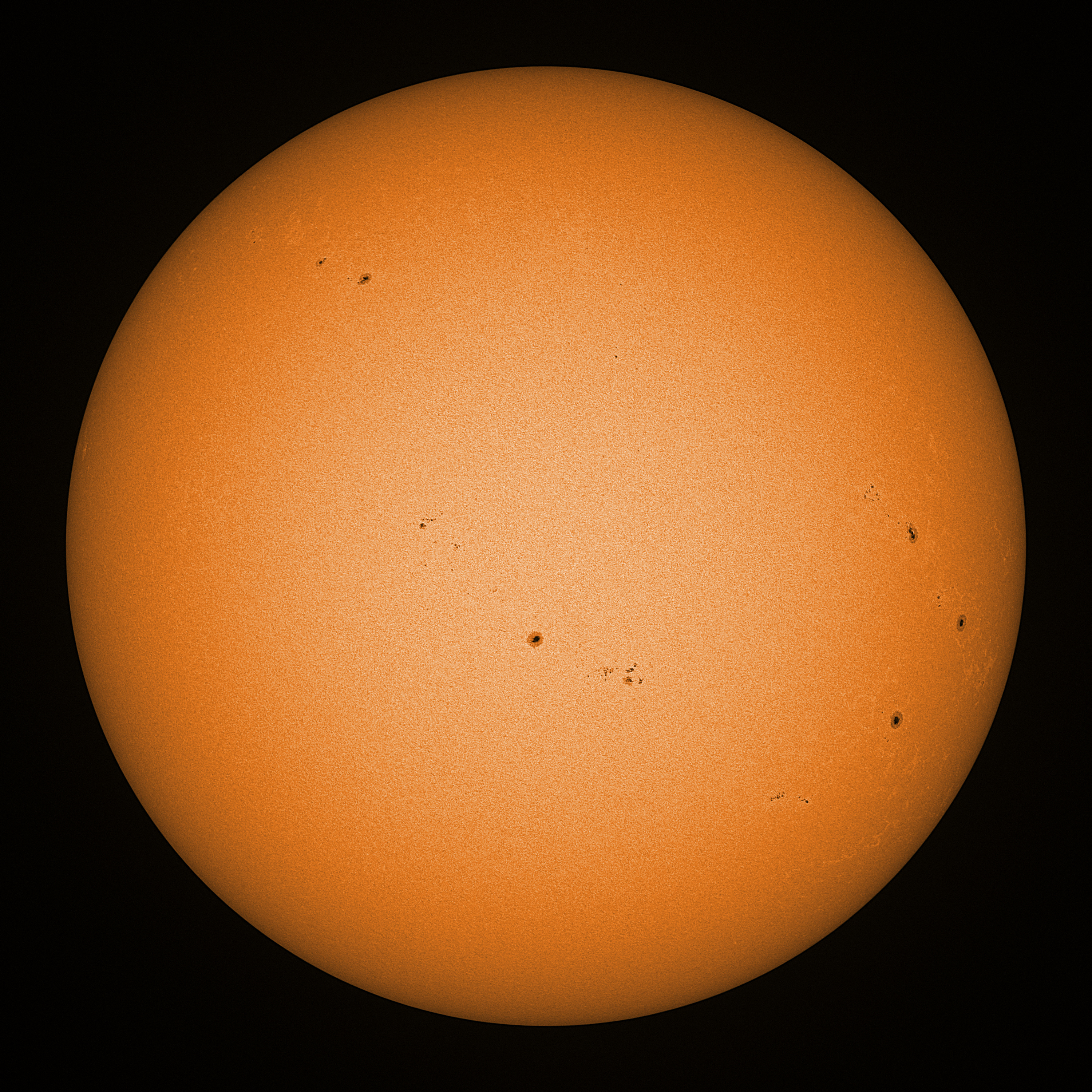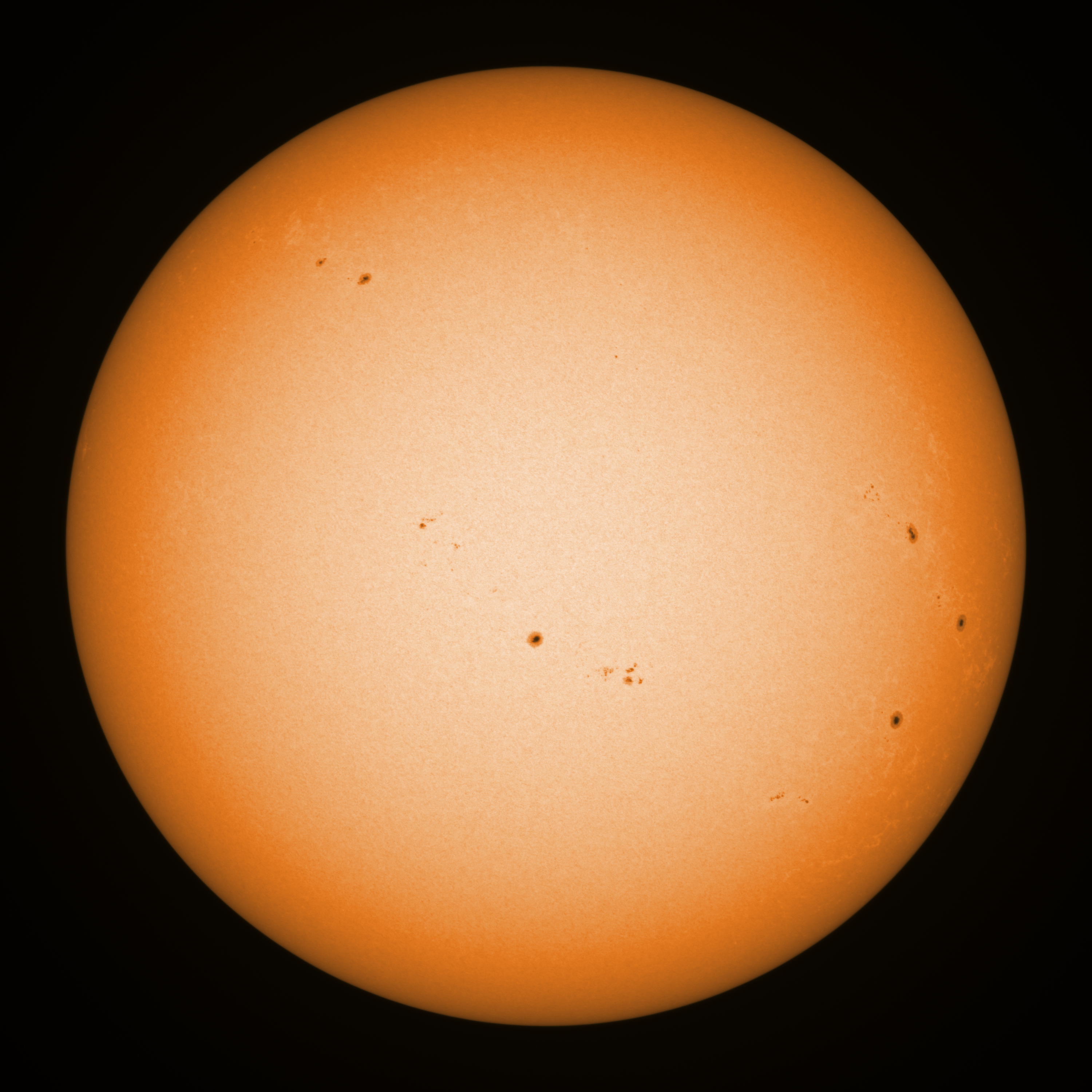 Observation date/time: 20 March 2025 09:36 UTC Telescope: GTT60 (Galileo Type Telescope) Focal length: 1490mm (plano convex singlet) Aperture: 60mm Stop: 30mm Eyepiece: -75mm (plano concave singlet, 24mm aperture) Observation type: projection (343mm distance, 80mm diameter) Reference: Earth's rotation axis Exposure (transparency): 0.480ms (using 82nm bandwidth green filter) Seeing (SSSMon): 3.0-3.5" (2.0" at best) =================================================================== Total number of sunspots: 38 | |