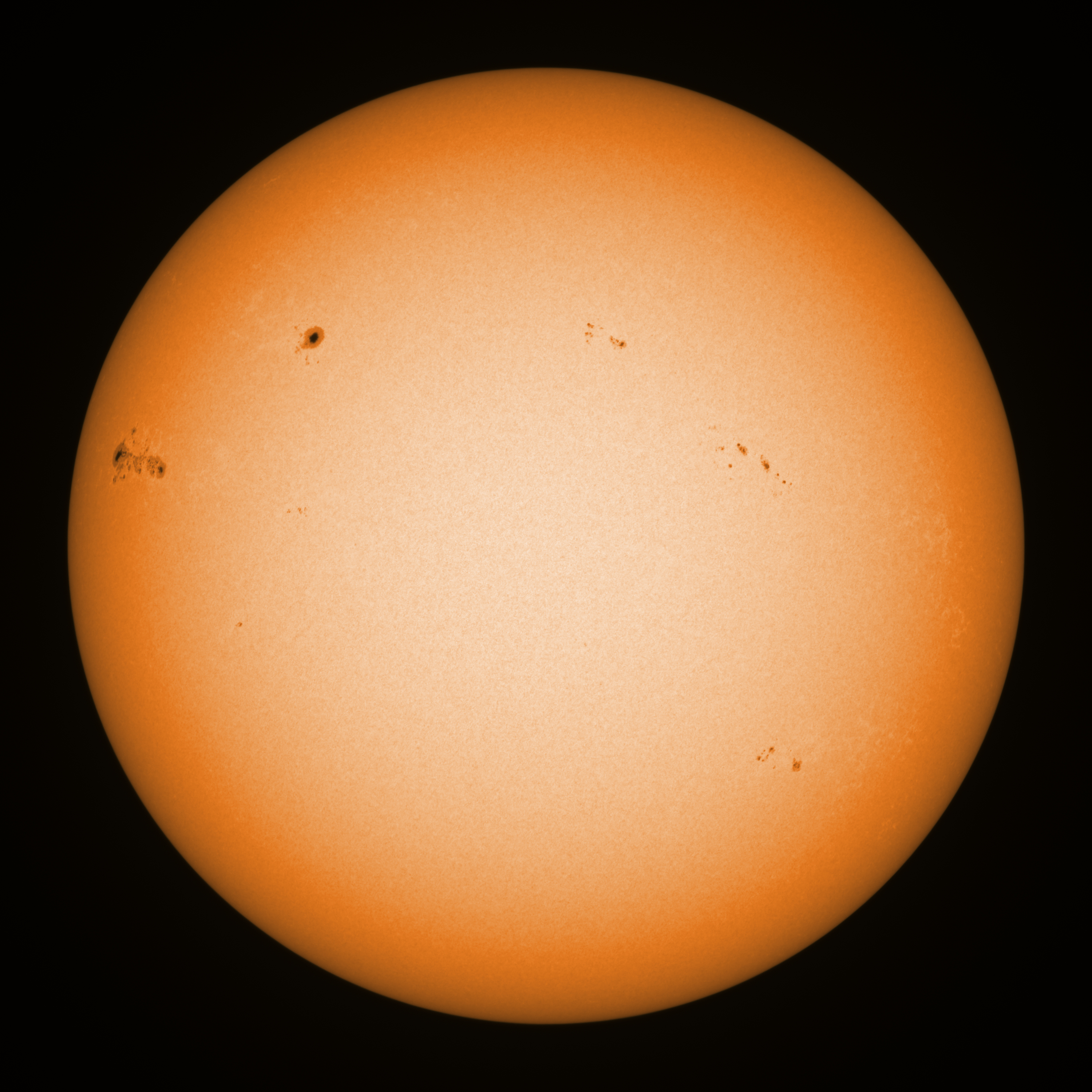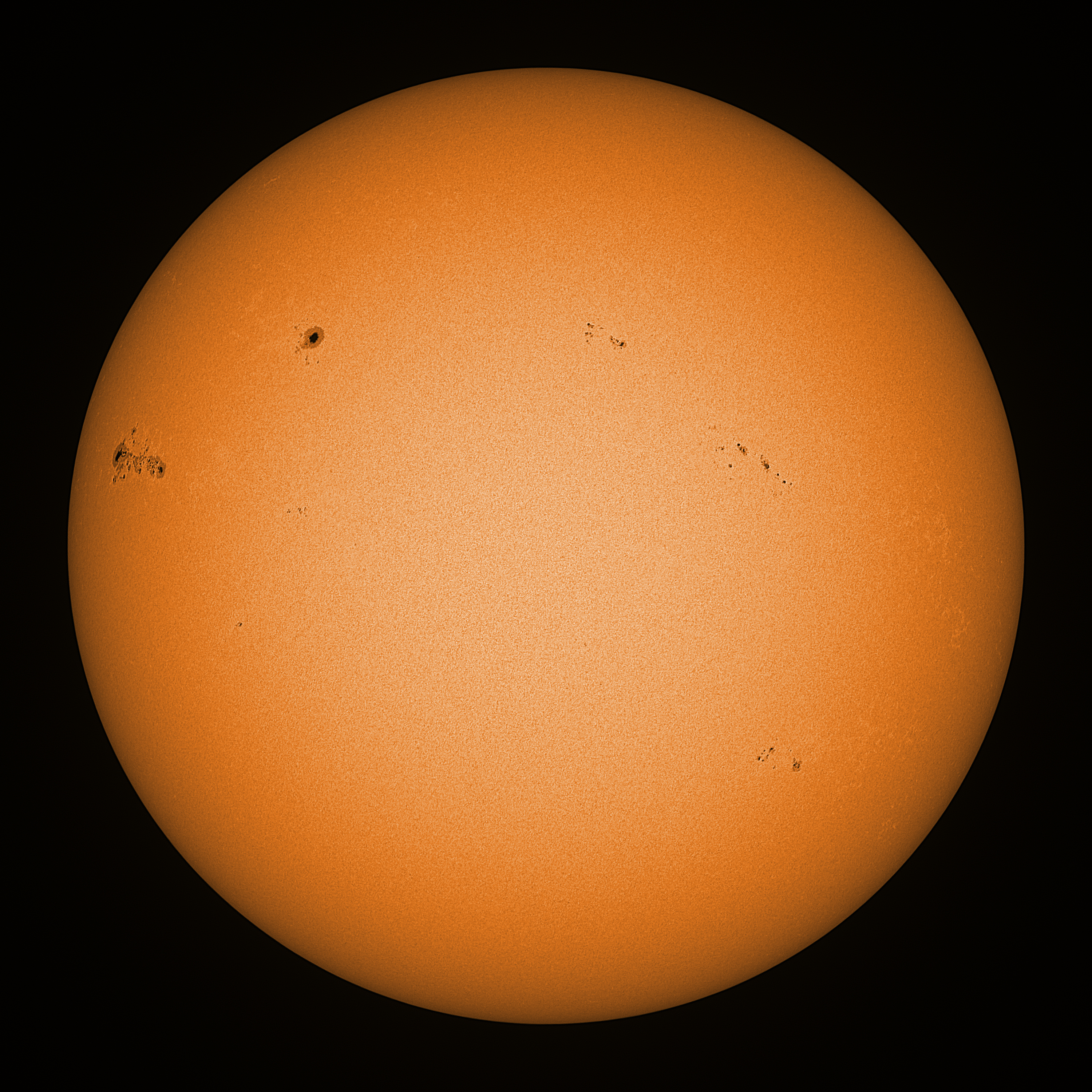 Observation date/time: 31 March 2025 08:57 UTC Telescope: GTT60 (Galileo Type Telescope) Focal length: 1490mm (plano convex singlet) Aperture: 60mm Stop: 30mm Eyepiece: -75mm (plano concave singlet, 24mm aperture) Observation type: projection (343mm distance, 80mm diameter) Reference: Earth's rotation axis Exposure (transparency): 0.480ms (using 82nm bandwidth green filter) Seeing (SSSMon): 3.5-4.5" (3.0" at best) =================================================================== Total number of sunspots: 51 | |