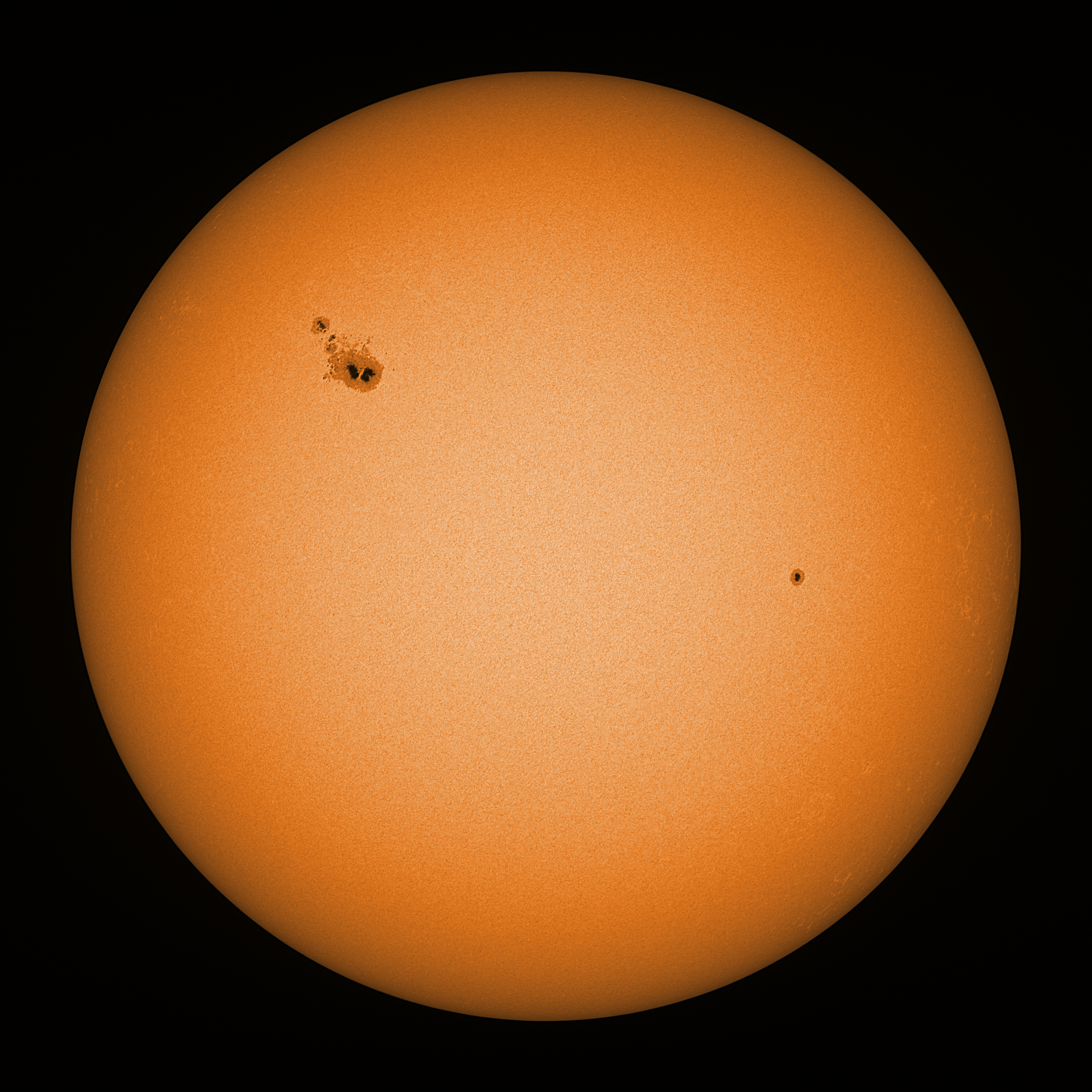 Observation date/time: 02 May 2025 14:56 UTC Telescope: GTT60 (Galileo Type Telescope) Focal length: 1490mm (plano convex singlet) Aperture: 60mm Stop: 30mm Eyepiece: -75mm (plano concave singlet, 24mm aperture) Observation type: projection (345mm distance, 80mm diameter) Reference: Earth's rotation axis Exposure (transparency): 0.480ms (using 82nm bandwidth green filter) Seeing (SSSMon): 6.0-7.5" (4.0" at best) =================================================================== Total number of sunspots: 10 | |