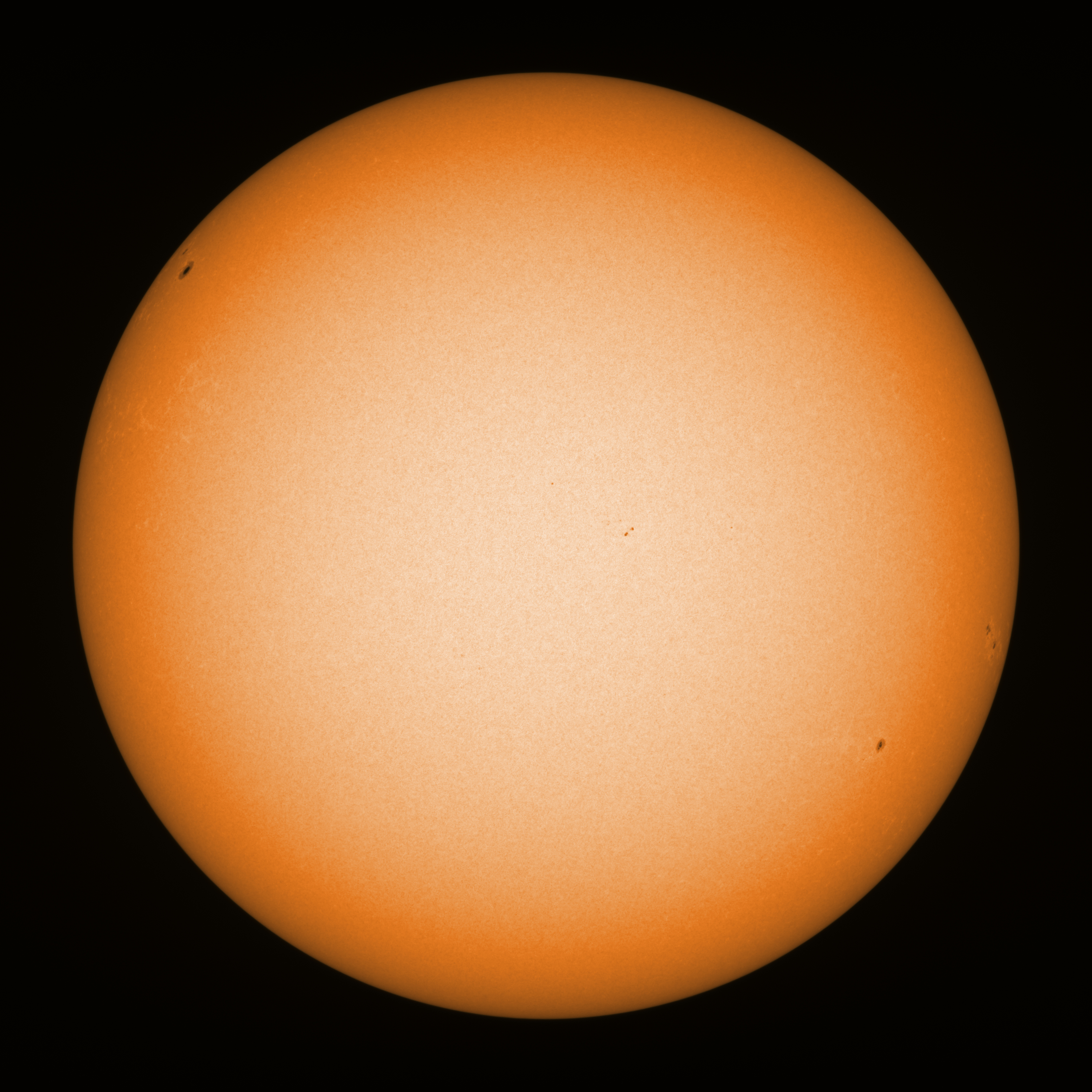 Observation date/time: 13 May 2025 08:16 UTC Telescope: GTT60 (Galileo Type Telescope) Focal length: 1490mm (plano convex singlet) Aperture: 60mm Stop: 30mm Eyepiece: -75mm (plano concave singlet, 24mm aperture) Observation type: projection (348mm distance, 80mm diameter) Reference: Earth's rotation axis Exposure (transparency): 0.330ms (using 82nm bandwidth green filter) Seeing (SSSMon): 3.5-4.5" (2.0" at best) =================================================================== Total number of sunspots: 7 | |