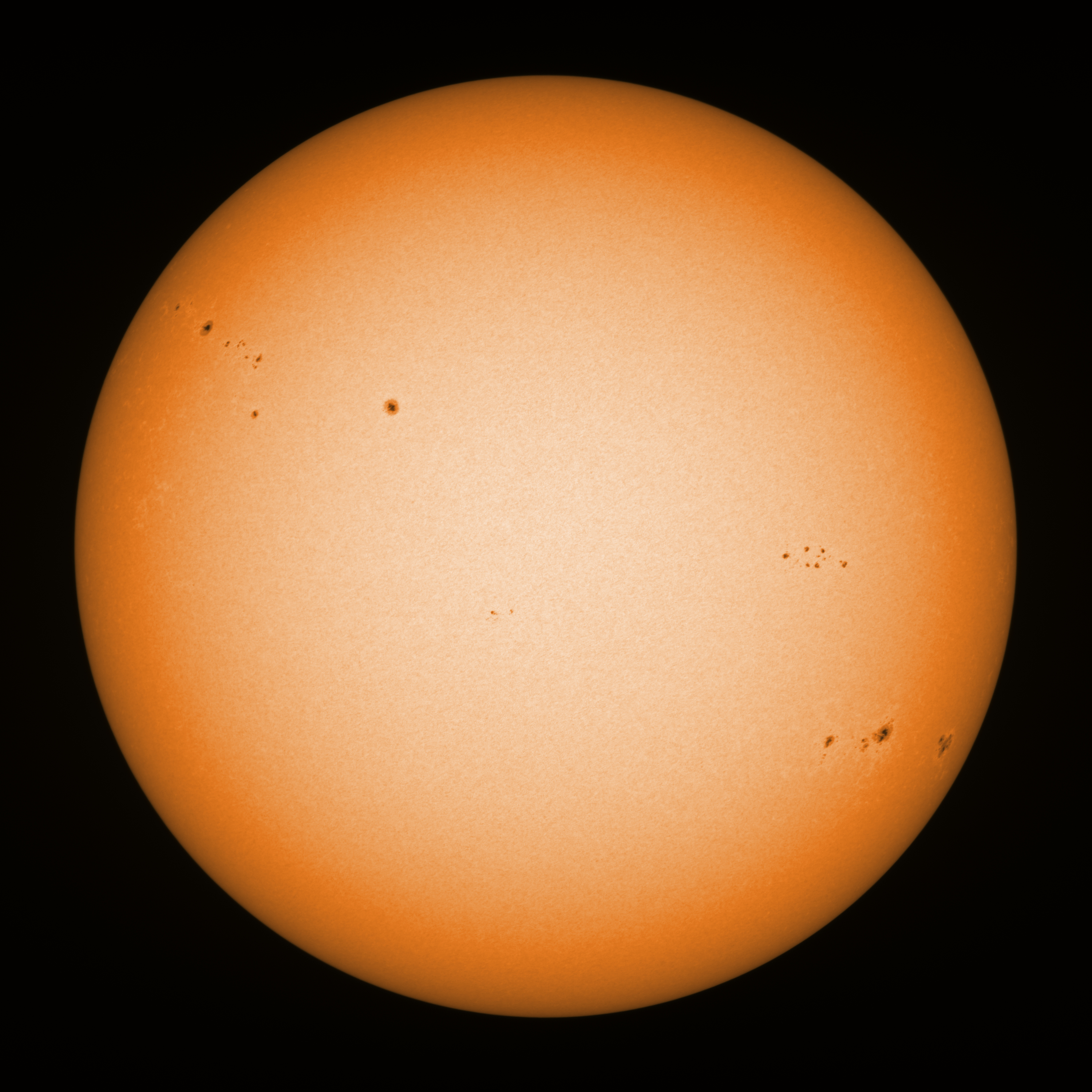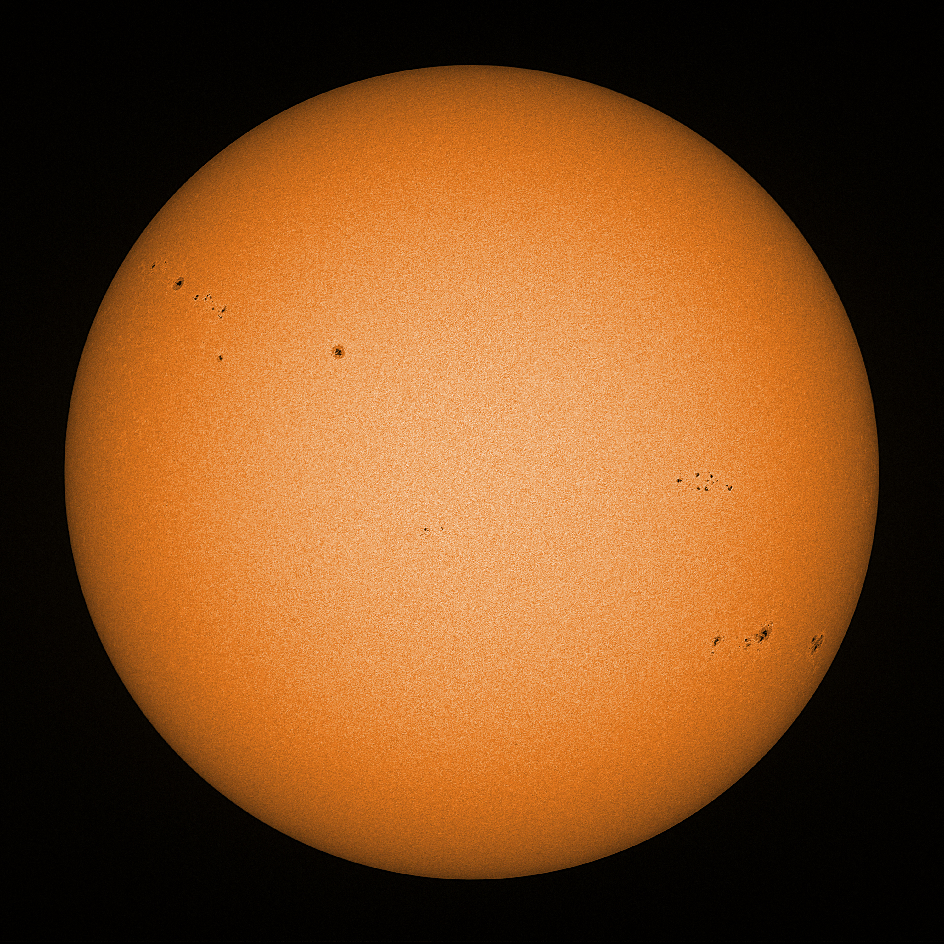 Observation date/time: 13 June 2025 07:49 UTC Telescope: GTT60 (Galileo Type Telescope) Focal length: 1490mm (plano convex singlet) Aperture: 60mm Stop: 30mm Eyepiece: -75mm (plano concave singlet, 24mm aperture) Observation type: projection (348mm distance, 80mm diameter) Reference: Earth's rotation axis Exposure (transparency): 0.530ms (using 82nm bandwidth green filter) Seeing (SSSMon): 4.5-5.0" (2.5" at best) =================================================================== Total number of sunspots: 33 | |