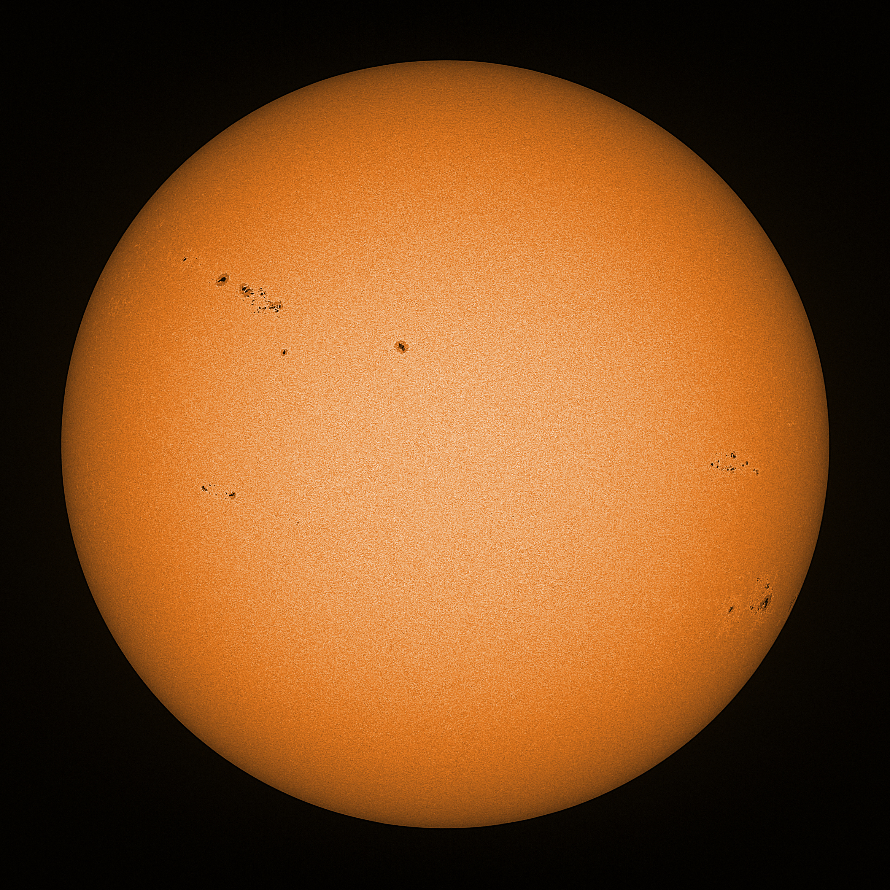 Observation date/time: 14 June 2025 08:34 UTC Telescope: GTT60 (Galileo Type Telescope) Focal length: 1490mm (plano convex singlet) Aperture: 60mm Stop: 30mm Eyepiece: -75mm (plano concave singlet, 24mm aperture) Observation type: projection (348mm distance, 80mm diameter) Reference: Earth's rotation axis Exposure (transparency): 0.430ms (using 82nm bandwidth green filter) Seeing (SSSMon): 1.6-2.0" (0.8" at best) =================================================================== Total number of sunspots: 33 | |