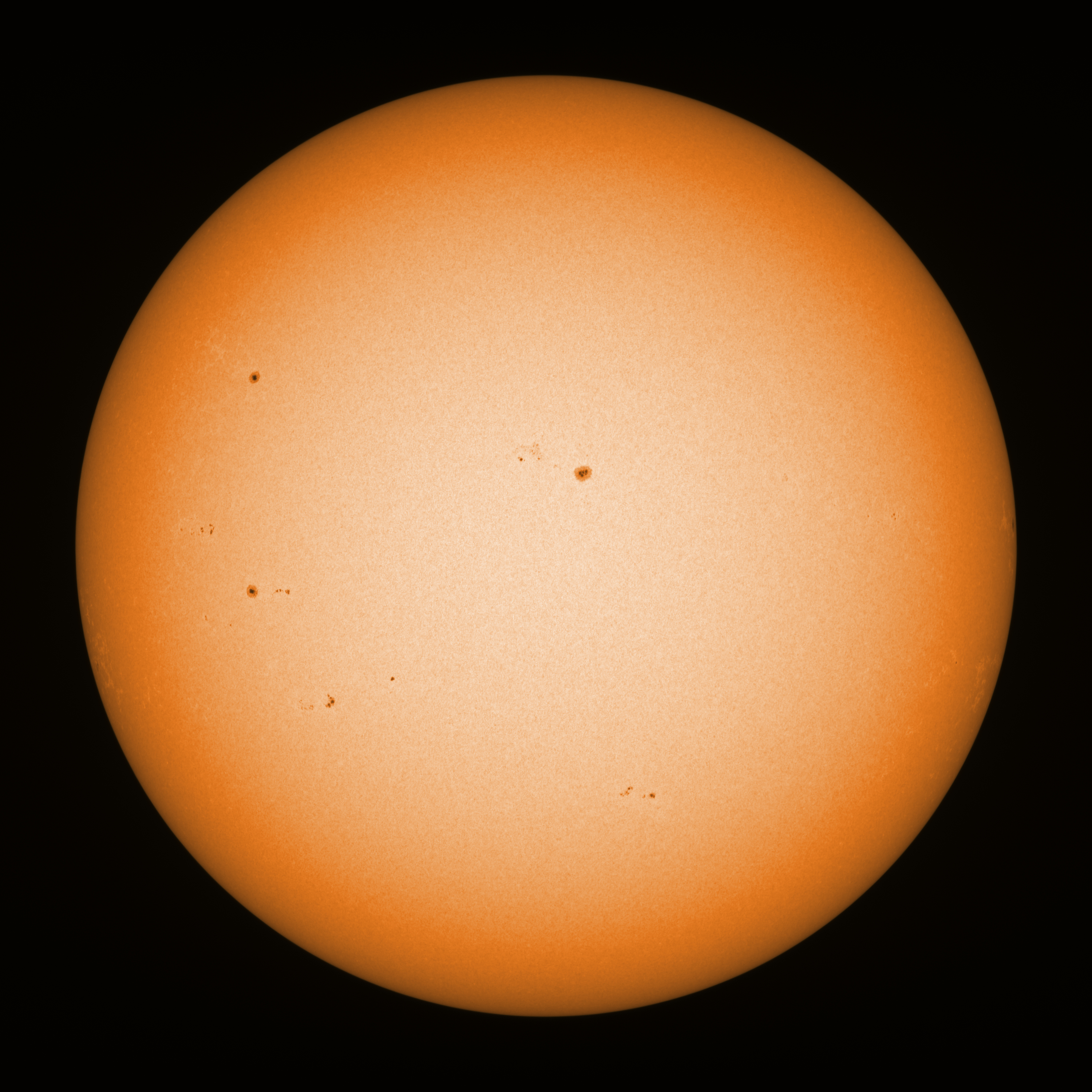 Observation date/time: 30 June 2025 07:53 UTC Telescope: GTT60 (Galileo Type Telescope) Focal length: 1490mm (plano convex singlet) Aperture: 60mm Stop: 30mm Eyepiece: -75mm (plano concave singlet, 24mm aperture) Observation type: projection (348mm distance, 80mm diameter) Reference: Earth's rotation axis Exposure (transparency): 0.380ms (using 82nm bandwidth green filter) Seeing (SSSMon): 1.7-1.8" (1.1" at best) =================================================================== Total number of sunspots: 25 | |