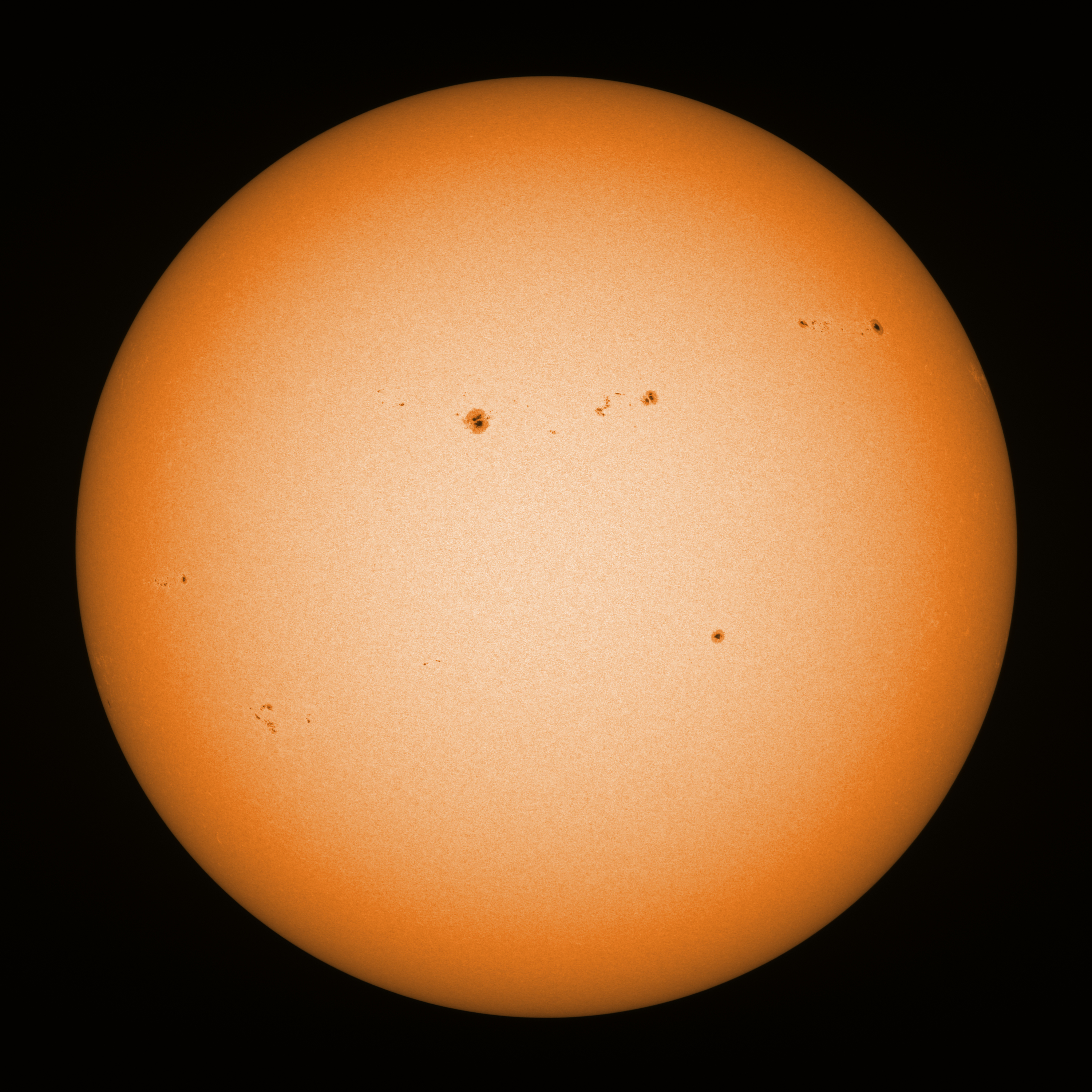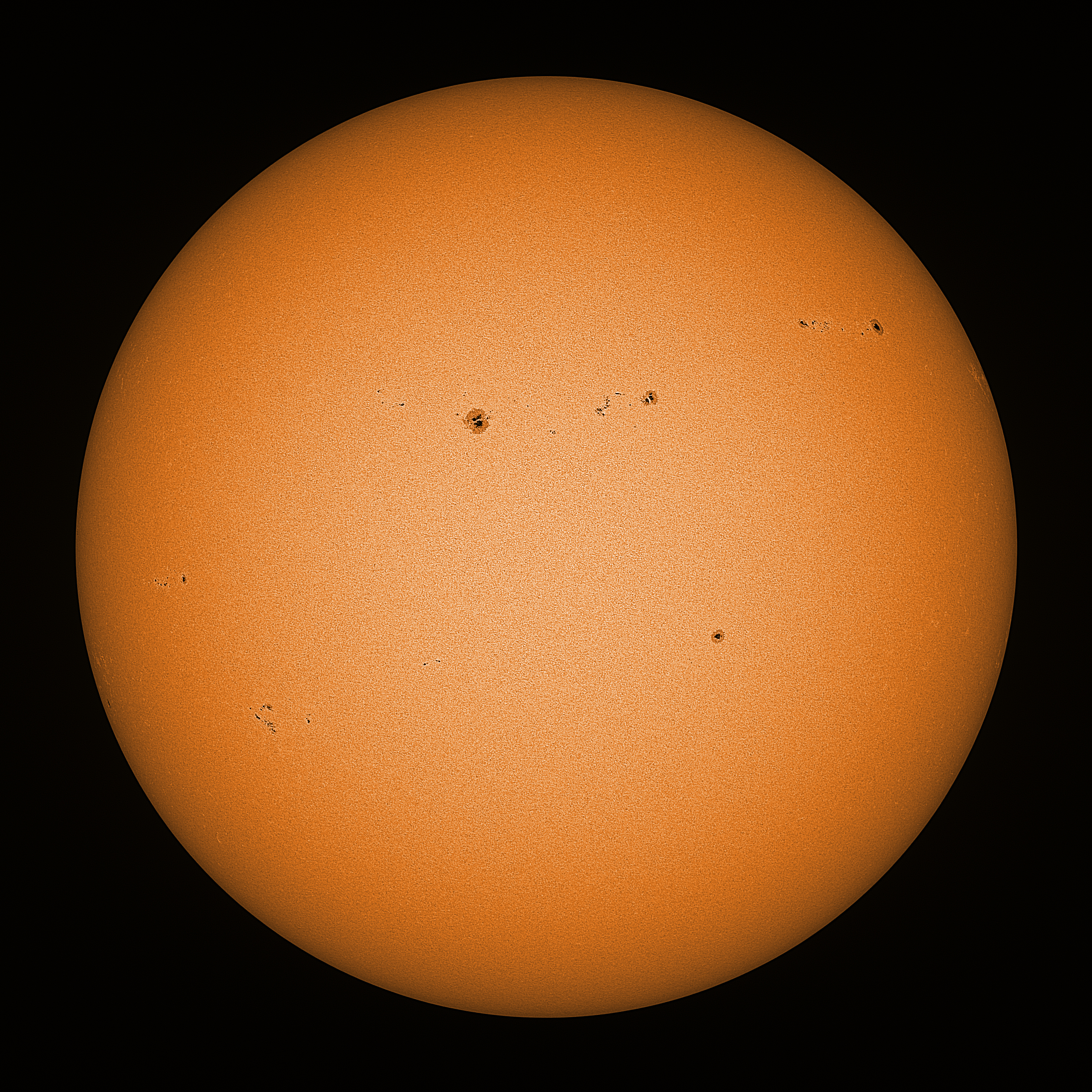 Observation date/time: 14 July 2025 16:04 UTC Telescope: GTT60 (Galileo Type Telescope) Focal length: 1490mm (plano convex singlet) Aperture: 60mm Stop: 30mm Eyepiece: -75mm (plano concave singlet, 24mm aperture) Observation type: projection (348mm distance, 80mm diameter) Reference: Earth's rotation axis Exposure (transparency): 0.680ms (using 82nm bandwidth green filter) Seeing (SSSMon): 2.6-2.7" (1.8" at best) =================================================================== Total number of sunspots: 36 | |