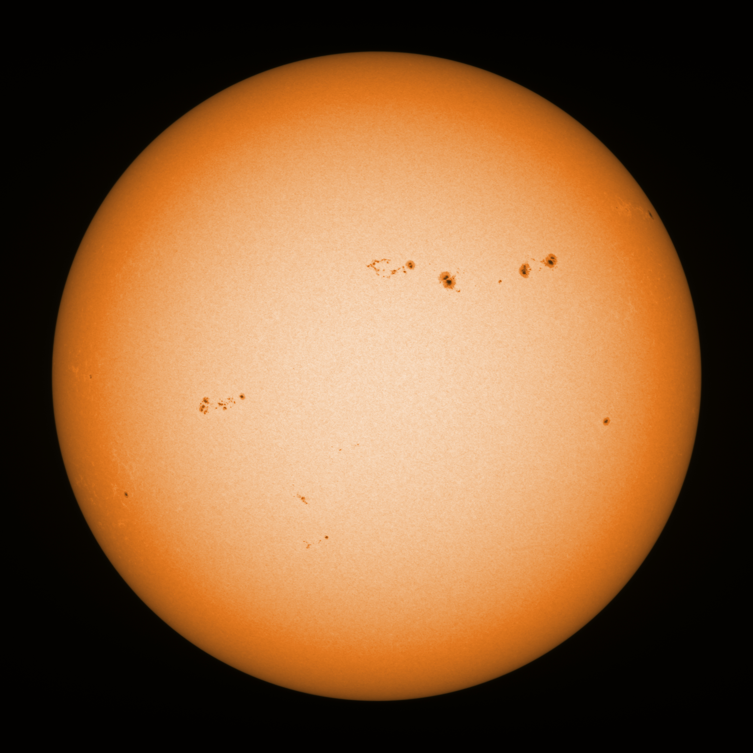 Observation date/time: 16 July 2025 10:21 UTC Telescope: GTT60 (Galileo Type Telescope) Focal length: 1490mm (plano convex singlet) Aperture: 60mm Stop: 30mm Eyepiece: -75mm (plano concave singlet, 24mm aperture) Observation type: projection (348mm distance, 80mm diameter) Reference: Earth's rotation axis Exposure (transparency): 0.380ms (using 82nm bandwidth green filter) Seeing (SSSMon): 4.5-5.0" (2.5" at best) =================================================================== Total number of sunspots: 47 | |