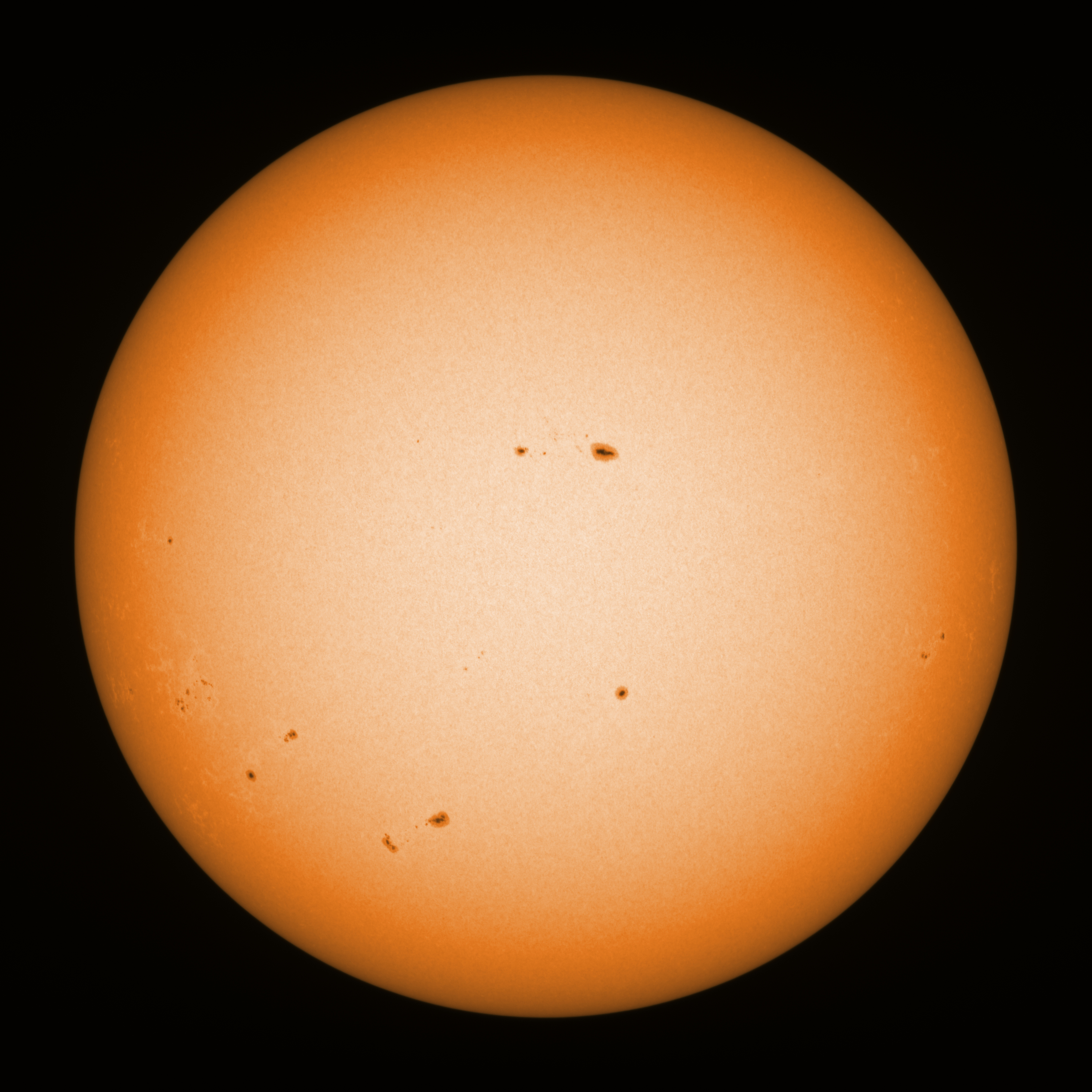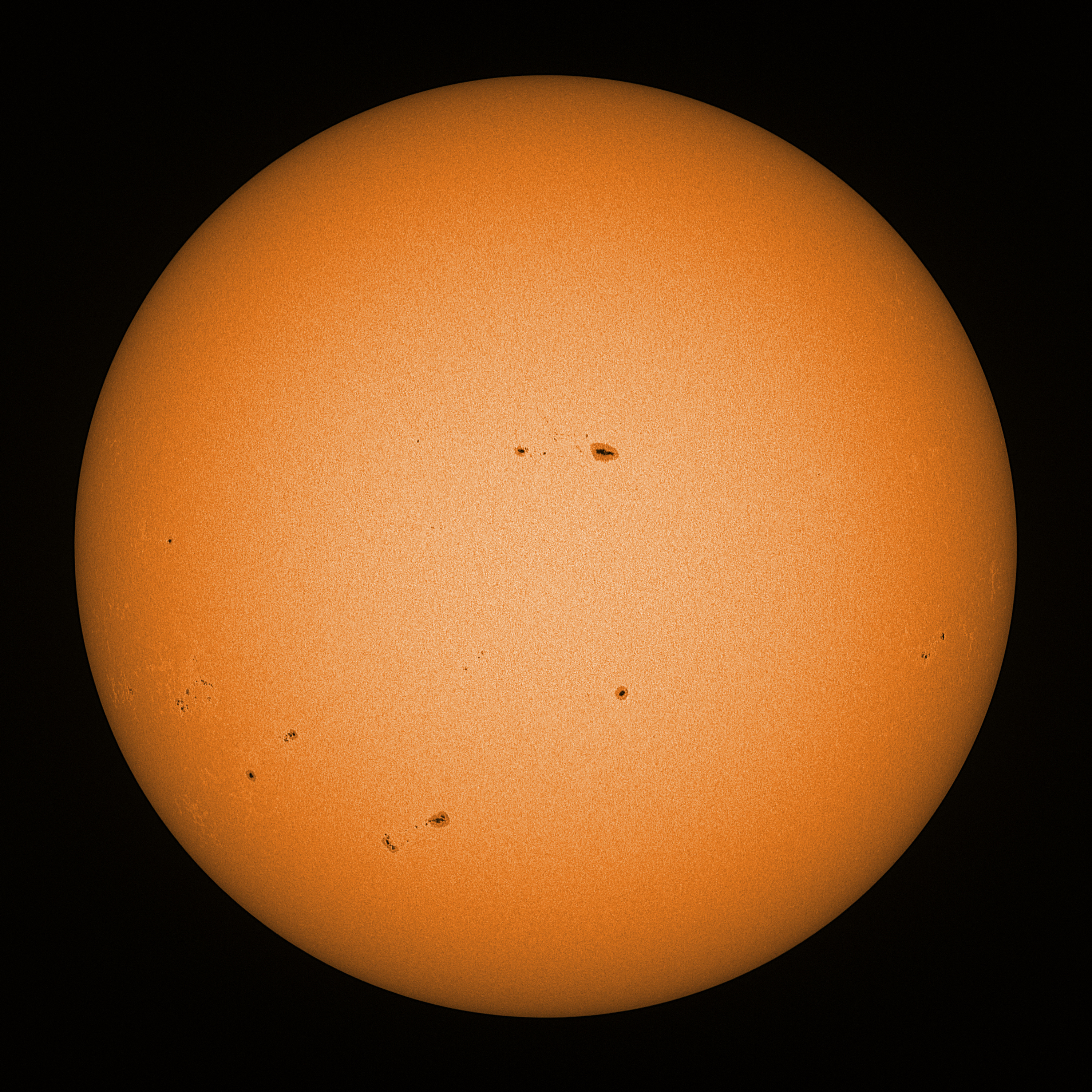 Observation date/time: 25 July 2025 13:32 UTC Telescope: GTT60 (Galileo Type Telescope) Focal length: 1490mm (plano convex singlet) Aperture: 60mm Stop: 30mm Eyepiece: -75mm (plano concave singlet, 24mm aperture) Observation type: projection (350mm distance, 80mm diameter) Reference: Earth's rotation axis Exposure (transparency): 0.380ms (using 82nm bandwidth green filter) Seeing (SSSMon): 5.0-5.5" (3.5" at best) =================================================================== Total number of sunspots: 31 | |
