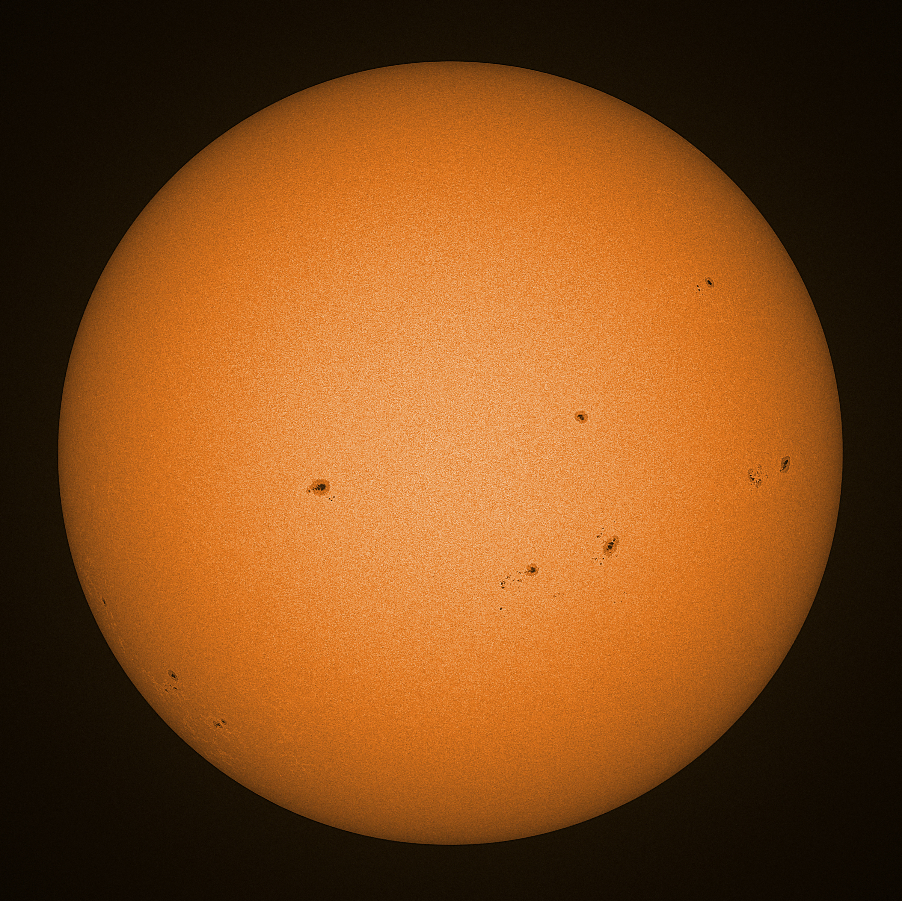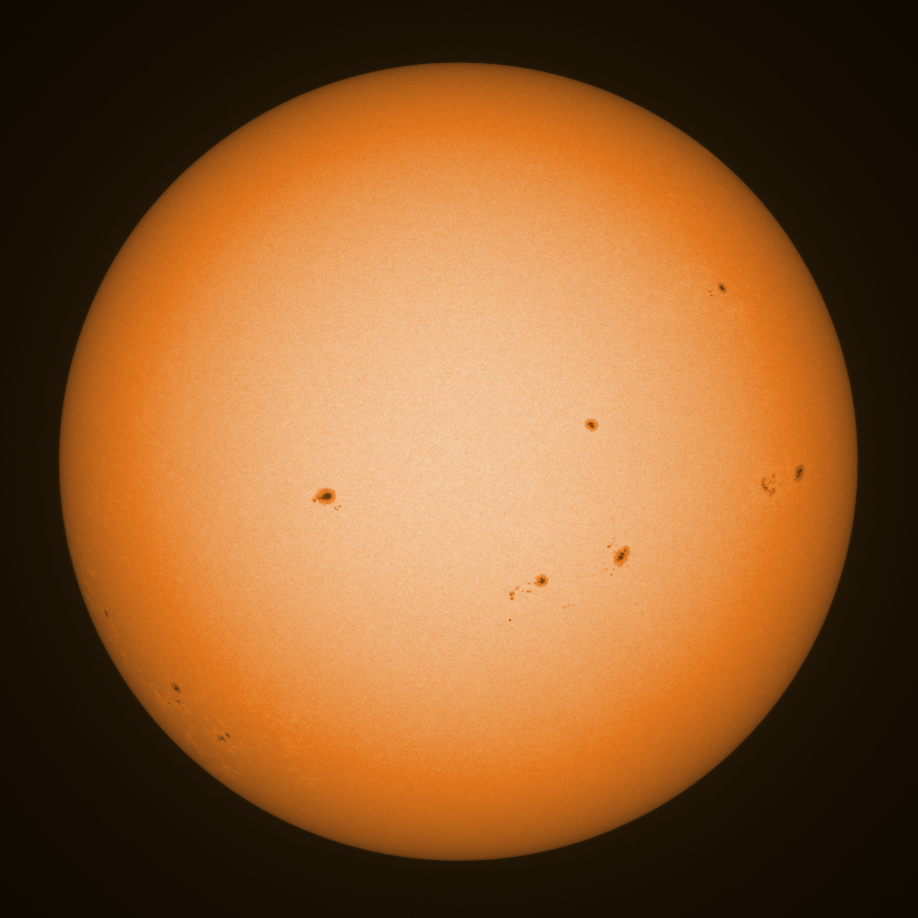 Observation date/time: 21 September 2025 12:57 UTC Telescope: GTT60 (Galileo Type Telescope) Focal length: 1490mm (plano convex singlet) Aperture: 60mm Stop: 30mm Eyepiece: -75mm (plano concave singlet, 24mm aperture) Observation type: projection (347mm distance, 80mm diameter) Reference: Earth's rotation axis Exposure (transparency): 0.480ms (using 82nm bandwidth green filter) Seeing (SSSMon): 4.5-5.0" (2.0" at best) =================================================================== Total number of sunspots: 35 | |