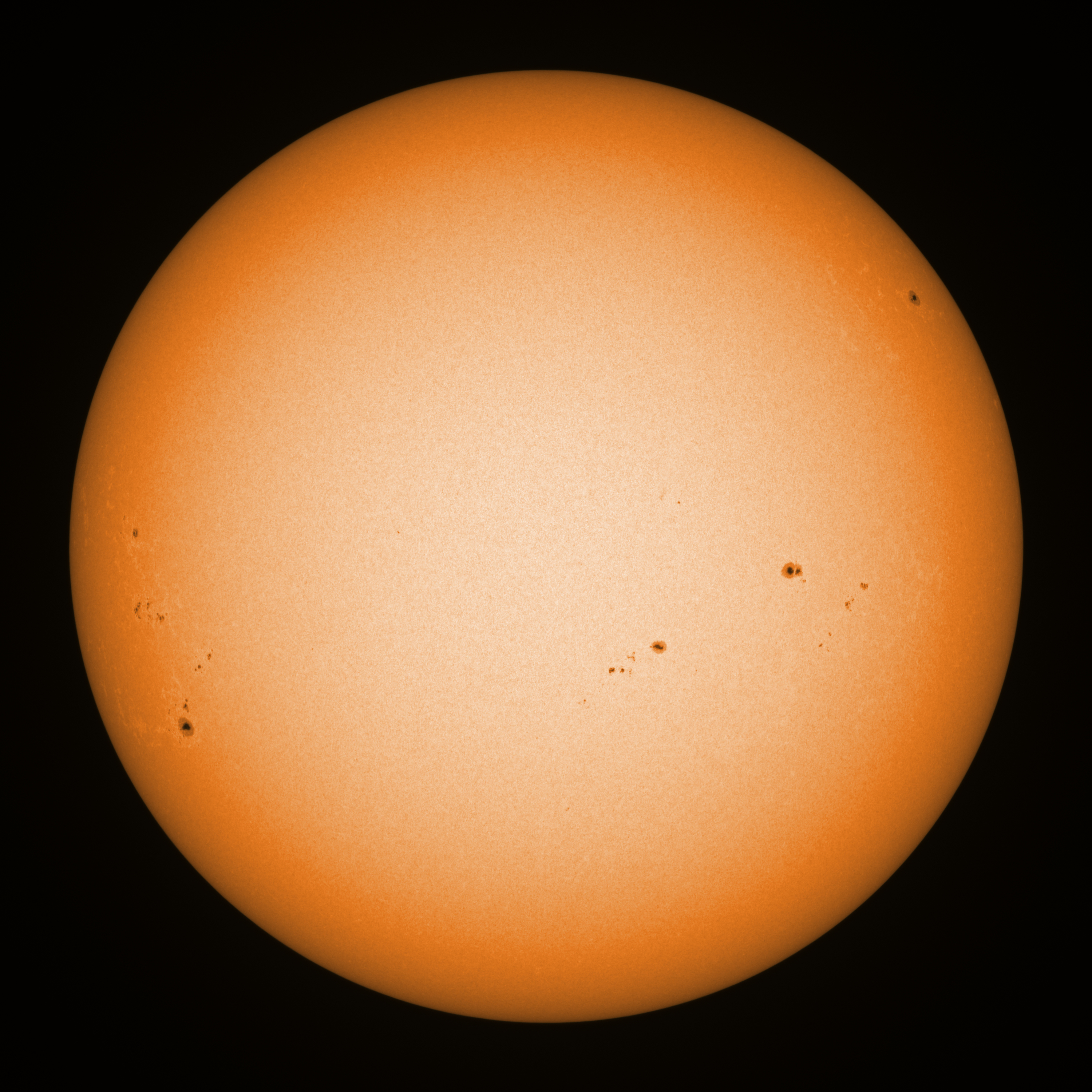 Observation date/time: 28 September 2025 08:35 UTC Telescope: GTT60 (Galileo Type Telescope) Focal length: 1490mm (plano convex singlet) Aperture: 60mm Stop: 30mm Eyepiece: -75mm (plano concave singlet, 24mm aperture) Observation type: projection (347mm distance, 80mm diameter) Reference: Earth's rotation axis Exposure (transparency): 0.430ms (using 82nm bandwidth green filter) Seeing (SSSMon): 1.5-1.8" (0.7" at best) =================================================================== Total number of sunspots: 36 | |
