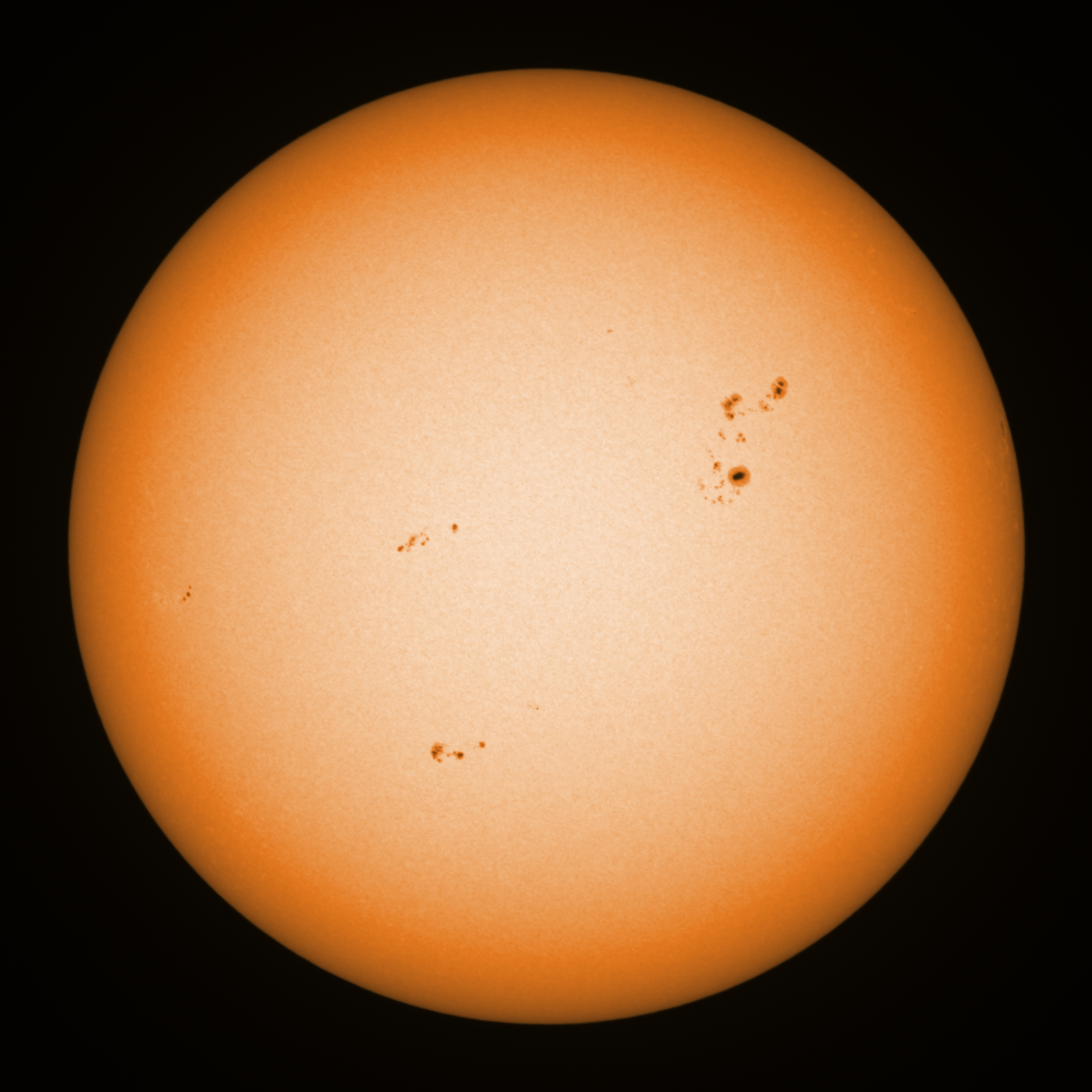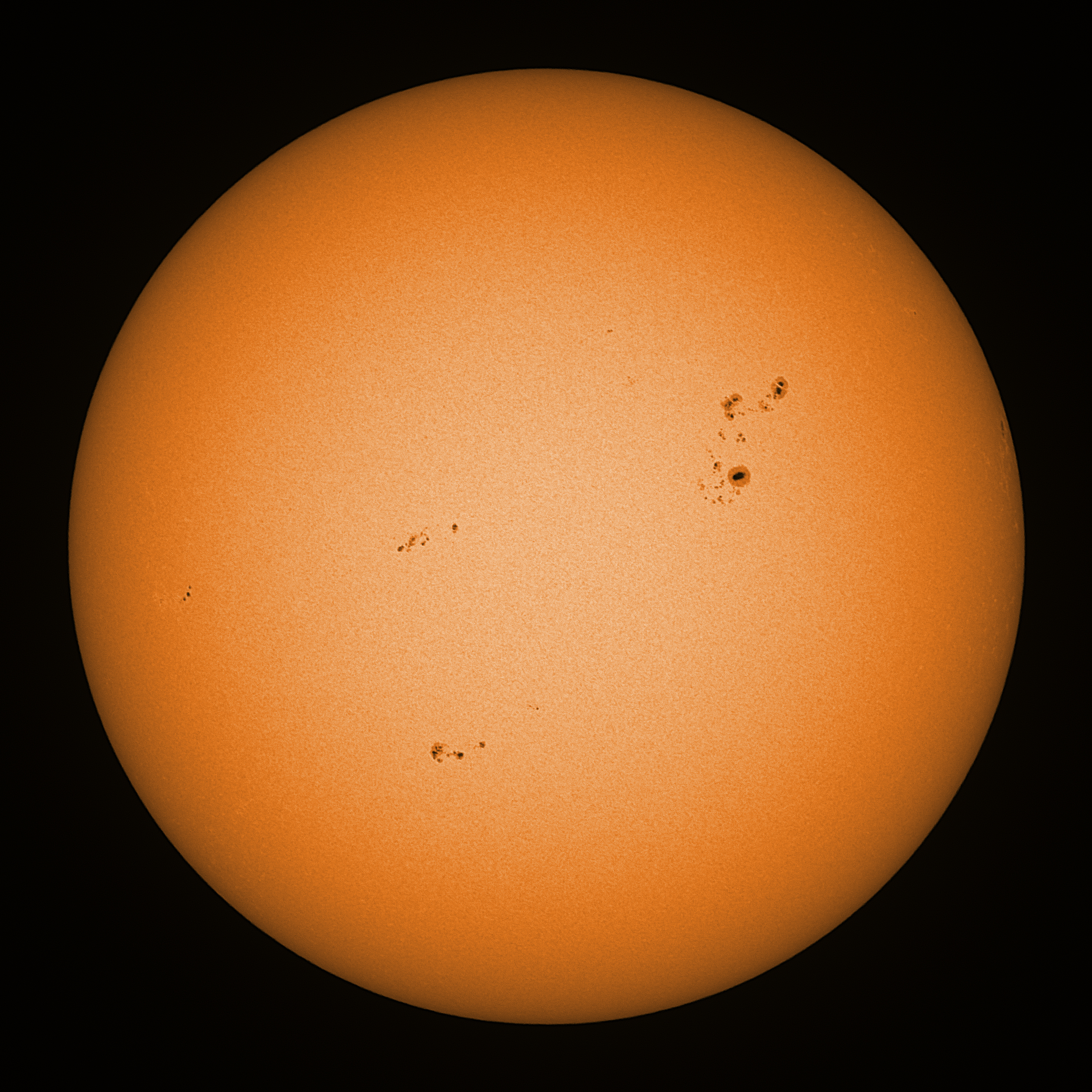 Observation date/time: 04 October 2025 09:04 UTC Telescope: GTT60 (Galileo Type Telescope) Focal length: 1490mm (plano convex singlet) Aperture: 60mm Stop: 30mm Eyepiece: -75mm (plano concave singlet, 24mm aperture) Observation type: projection (347mm distance, 80mm diameter) Reference: Earth's rotation axis Exposure (transparency): 0.480ms (using 82nm bandwidth green filter) Seeing (SSSMon): 2.4-2.7" (1.0" at best) =================================================================== Total number of sunspots: 50 | |
