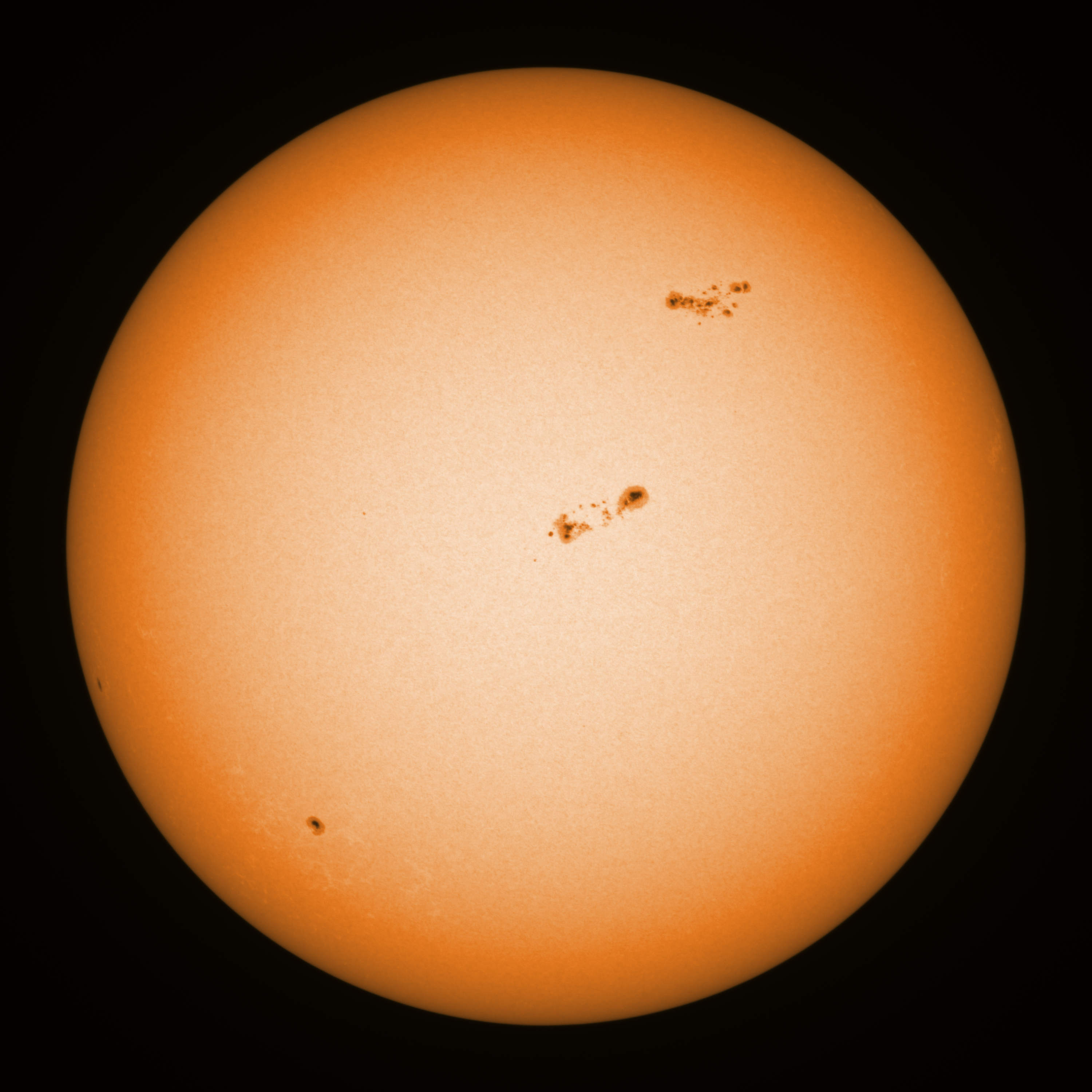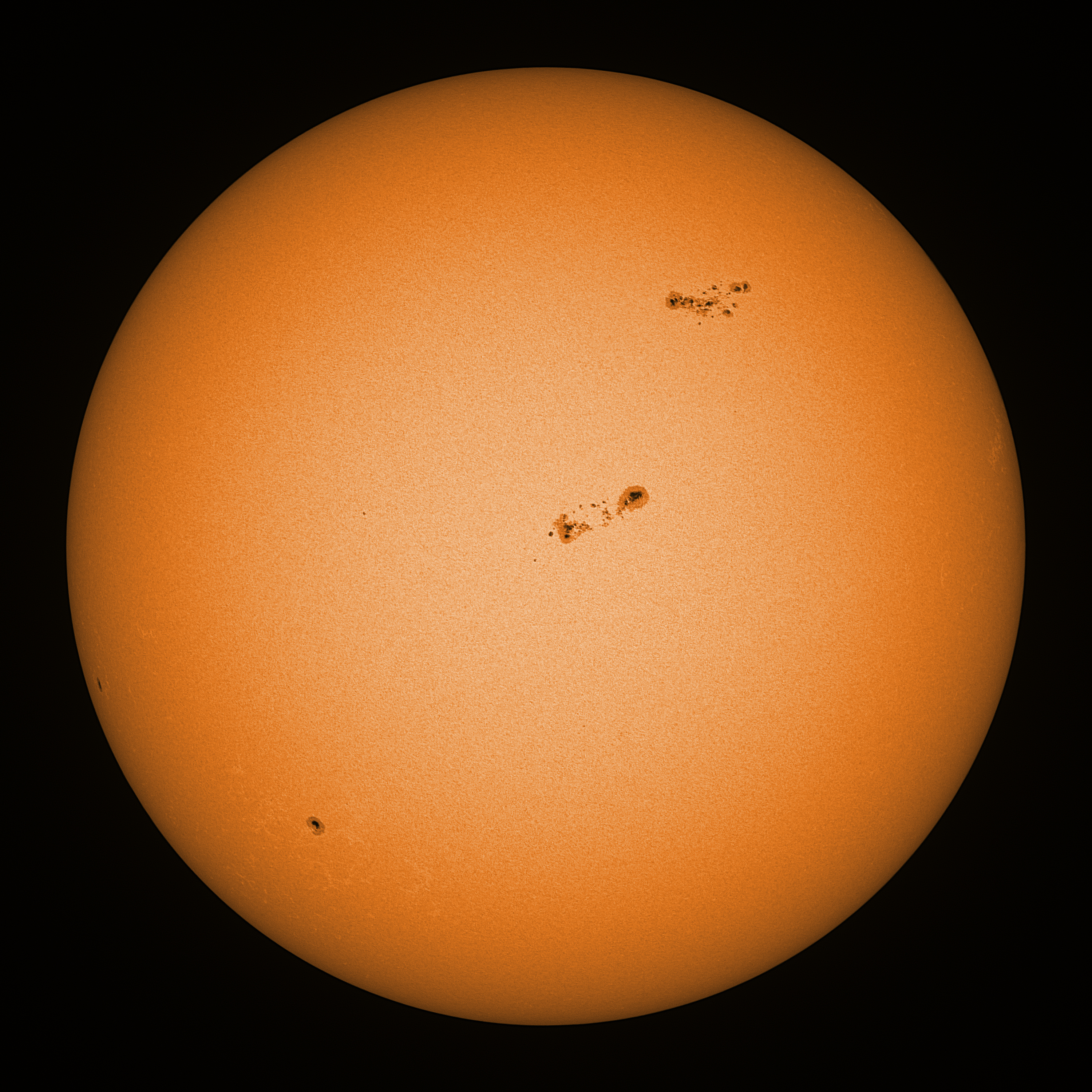 Observation date/time: 14 October 2025 13:41 UTC Telescope: GTT60 (Galileo Type Telescope) Focal length: 1490mm (plano convex singlet) Aperture: 60mm Stop: 30mm Eyepiece: -75mm (plano concave singlet, 24mm aperture) Observation type: projection (347mm distance, 80mm diameter) Reference: Earth's rotation axis Exposure (transparency): 0.380ms (using 82nm bandwidth green filter) Seeing (SSSMon): 3.5-5.0" (2.0" at best) =================================================================== Total number of sunspots: 26 | |