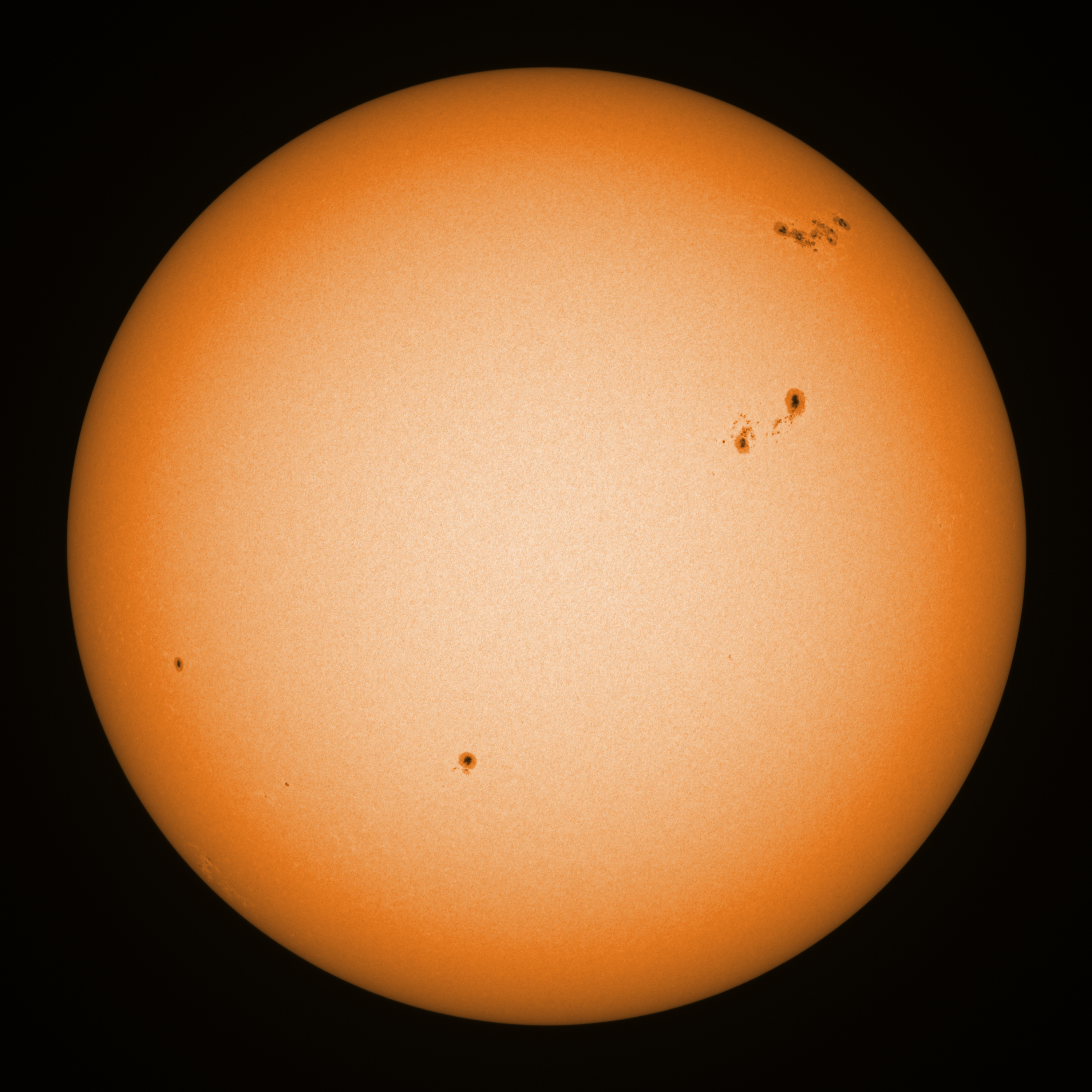 Observation date/time: 16 October 2025 09:30 UTC Telescope: GTT60 (Galileo Type Telescope) Focal length: 1490mm (plano convex singlet) Aperture: 60mm Stop: 30mm Eyepiece: -75mm (plano concave singlet, 24mm aperture) Observation type: projection (347mm distance, 80mm diameter) Reference: Earth's rotation axis Exposure (transparency): 0.380ms (using 82nm bandwidth green filter) Seeing (SSSMon): 3.0-3.5" (1.7" at best) =================================================================== Total number of sunspots: 33 | |