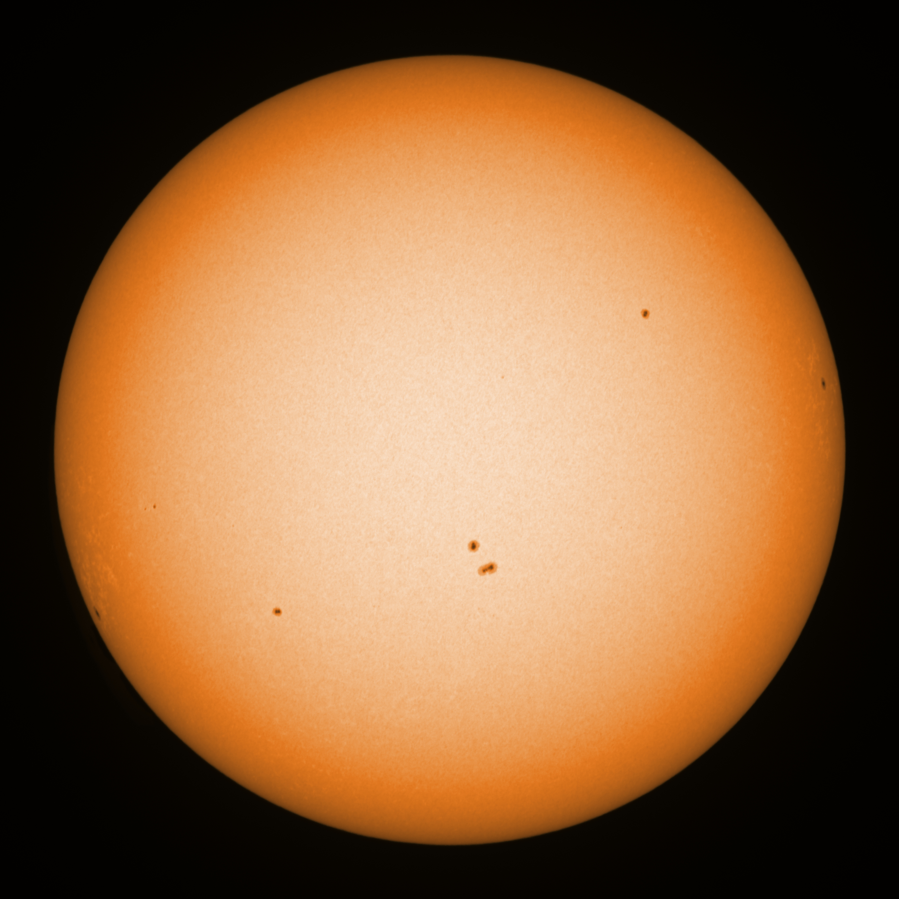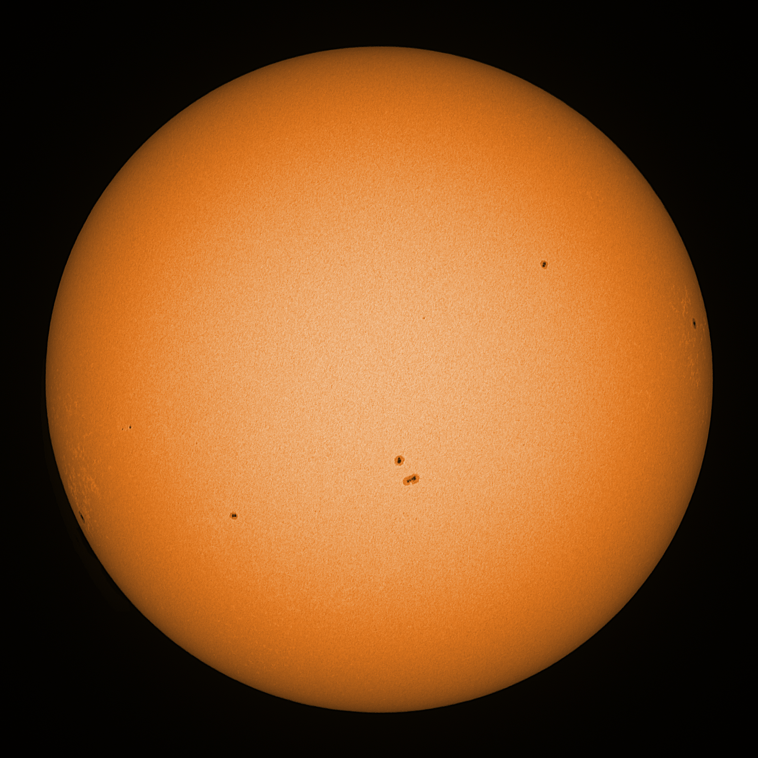 Observation date/time: 23 October 2025 08:55 UTC Telescope: GTT60 (Galileo Type Telescope) Focal length: 1490mm (plano convex singlet) Aperture: 60mm Stop: 30mm Eyepiece: -75mm (plano concave singlet, 24mm aperture) Observation type: projection (343mm distance, 80mm diameter) Reference: Earth's rotation axis Exposure (transparency): 0.430ms (using 82nm bandwidth green filter) Seeing (SSSMon): 1.0-1.1" (0.7" at best) =================================================================== Total number of sunspots: 8 | |