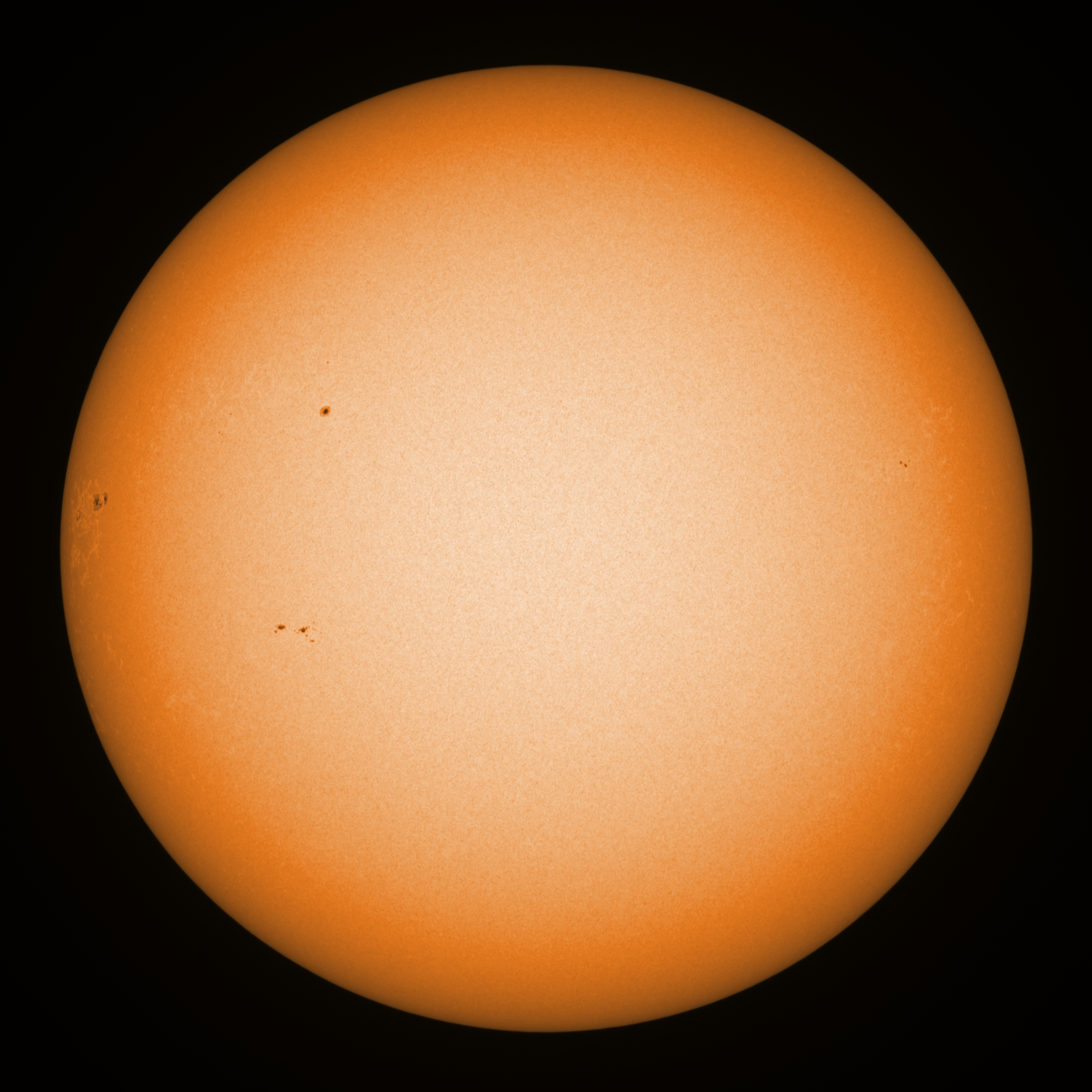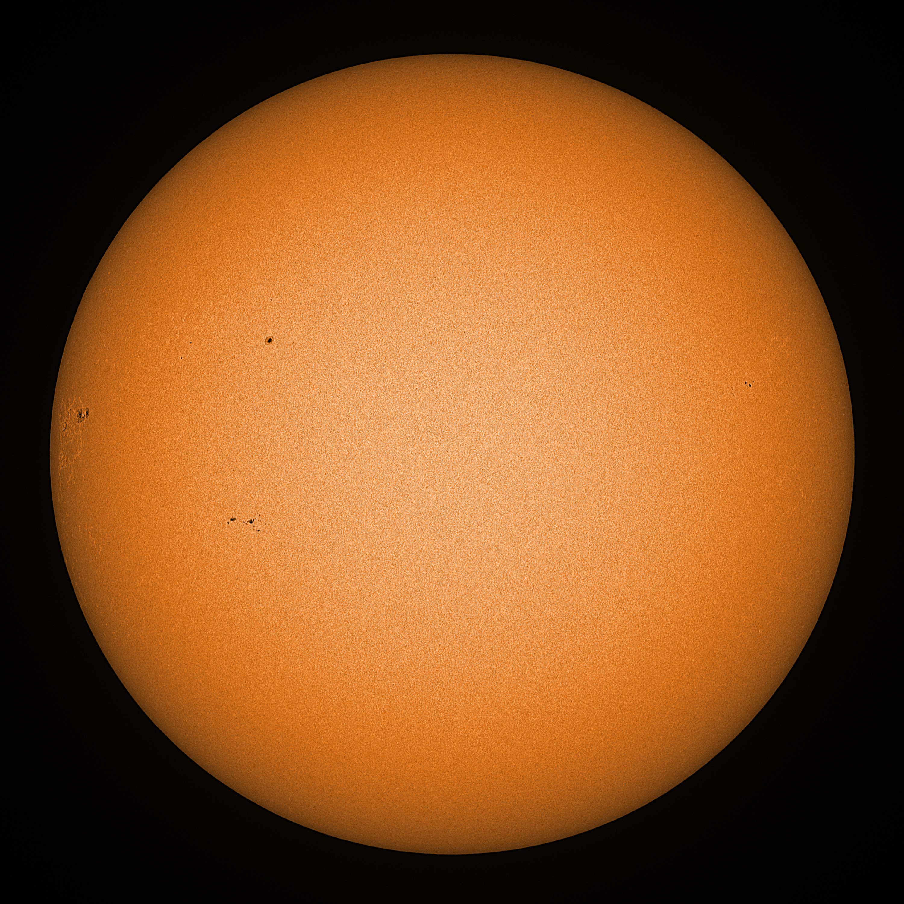 Observation date/time: 21 December 2025 12:35 UTC Telescope: GTT60 (Galileo Type Telescope) Focal length: 1490mm (plano convex singlet) Aperture: 60mm Stop: 30mm Eyepiece: -75mm (plano concave singlet, 24mm aperture) Observation type: projection (338mm distance, 80mm diameter) Reference: Earth's rotation axis Exposure (transparency): 1.230ms (using 82nm bandwidth green filter) Seeing (SSSMon): 1.8-2.5" (1.1" at best) =================================================================== Total number of sunspots: 11 | |