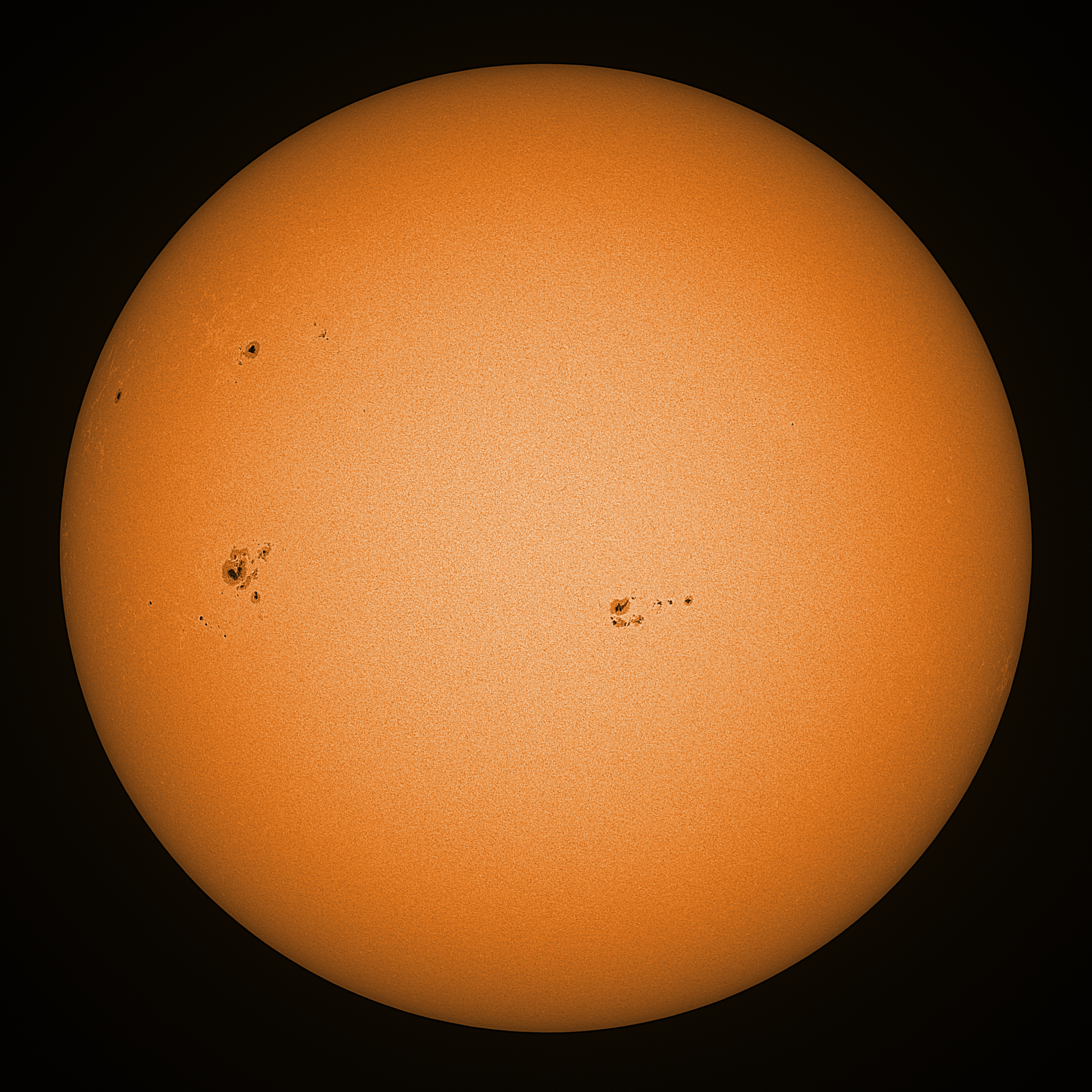 Observation date/time: 17 January 2026 10:23 UTC Telescope: GTT60 (Galileo Type Telescope) Focal length: 1490mm (plano convex singlet) Aperture: 60mm Stop: 30mm Eyepiece: -75mm (plano concave singlet, 24mm aperture) Observation type: projection (338mm distance, 80mm diameter) Reference: Earth's rotation axis Exposure (transparency): 0.780ms (using 82nm bandwidth green filter) Seeing (SSSMon): 1.2-1.4" (0.5" at best) =================================================================== Total number of sunspots: 34 | |