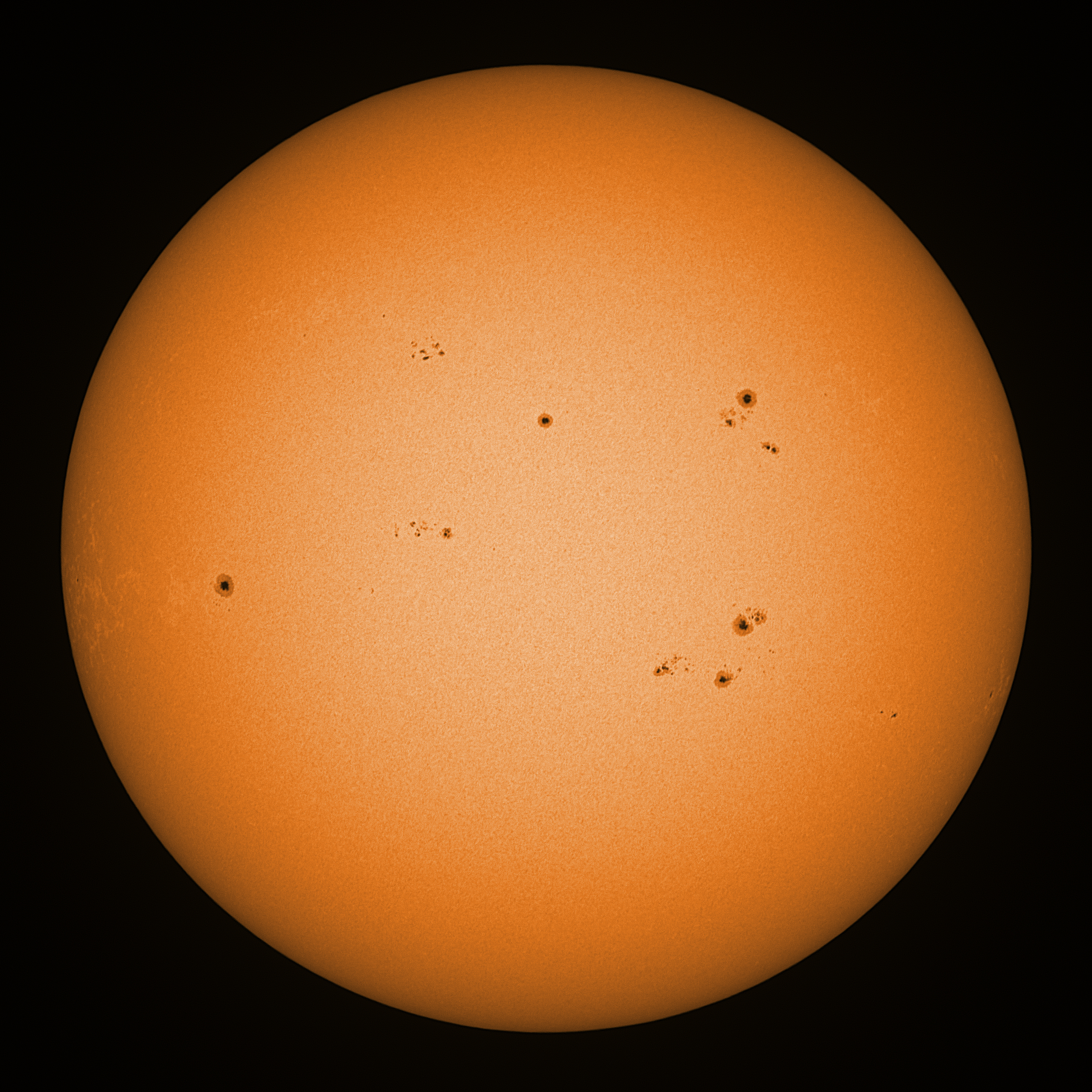 Observation date/time: 22 January 2026 10:05 UTC Telescope: GTT60 (Galileo Type Telescope) Focal length: 1490mm (plano convex singlet) Aperture: 60mm Stop: 30mm Eyepiece: -75mm (plano concave singlet, 24mm aperture) Observation type: projection (338mm distance, 80mm diameter) Reference: Earth's rotation axis Exposure (transparency): 0.780ms (using 82nm bandwidth green filter) Seeing (SSSMon): 2.3-2.5" (1.6" at best) =================================================================== Total number of sunspots: 36 | |