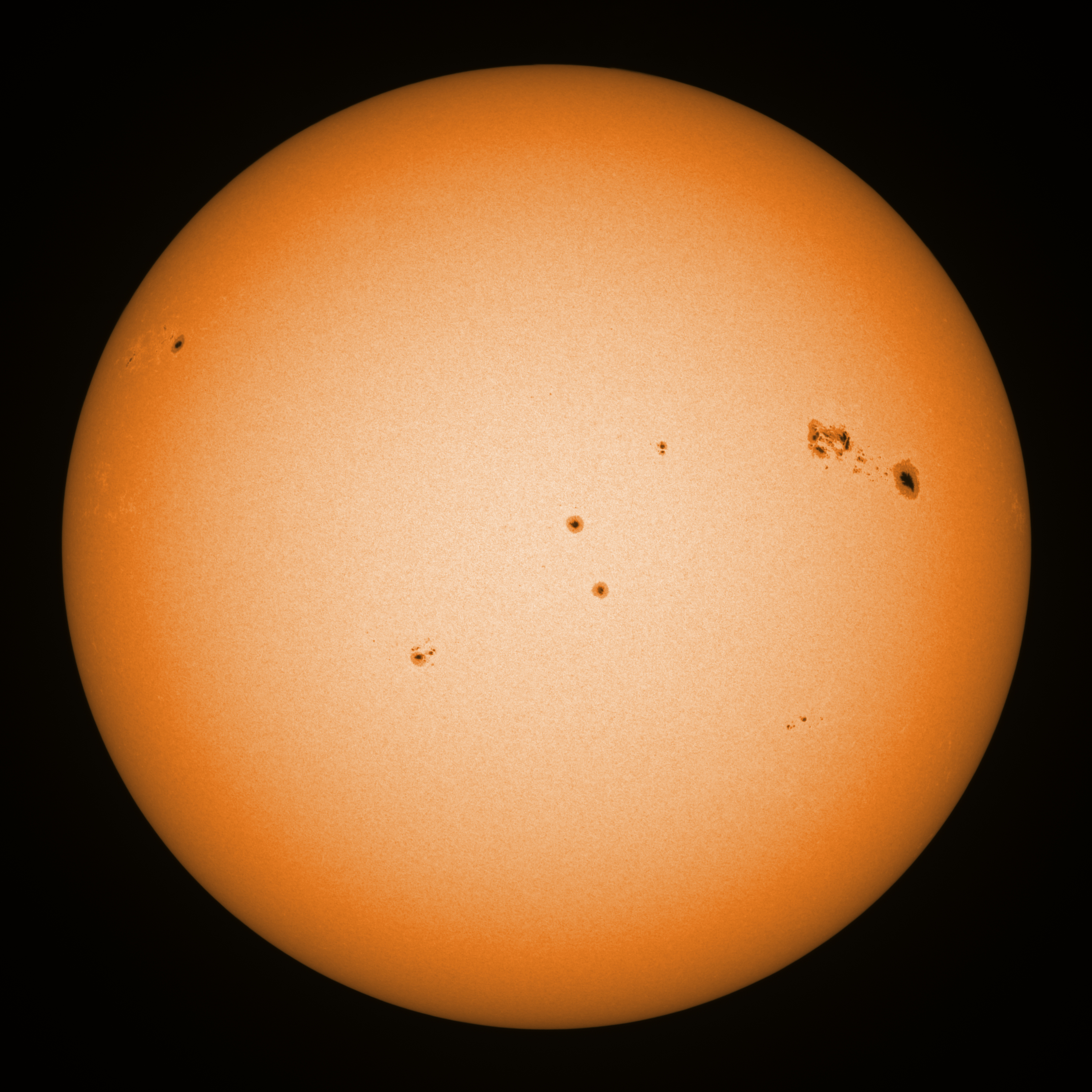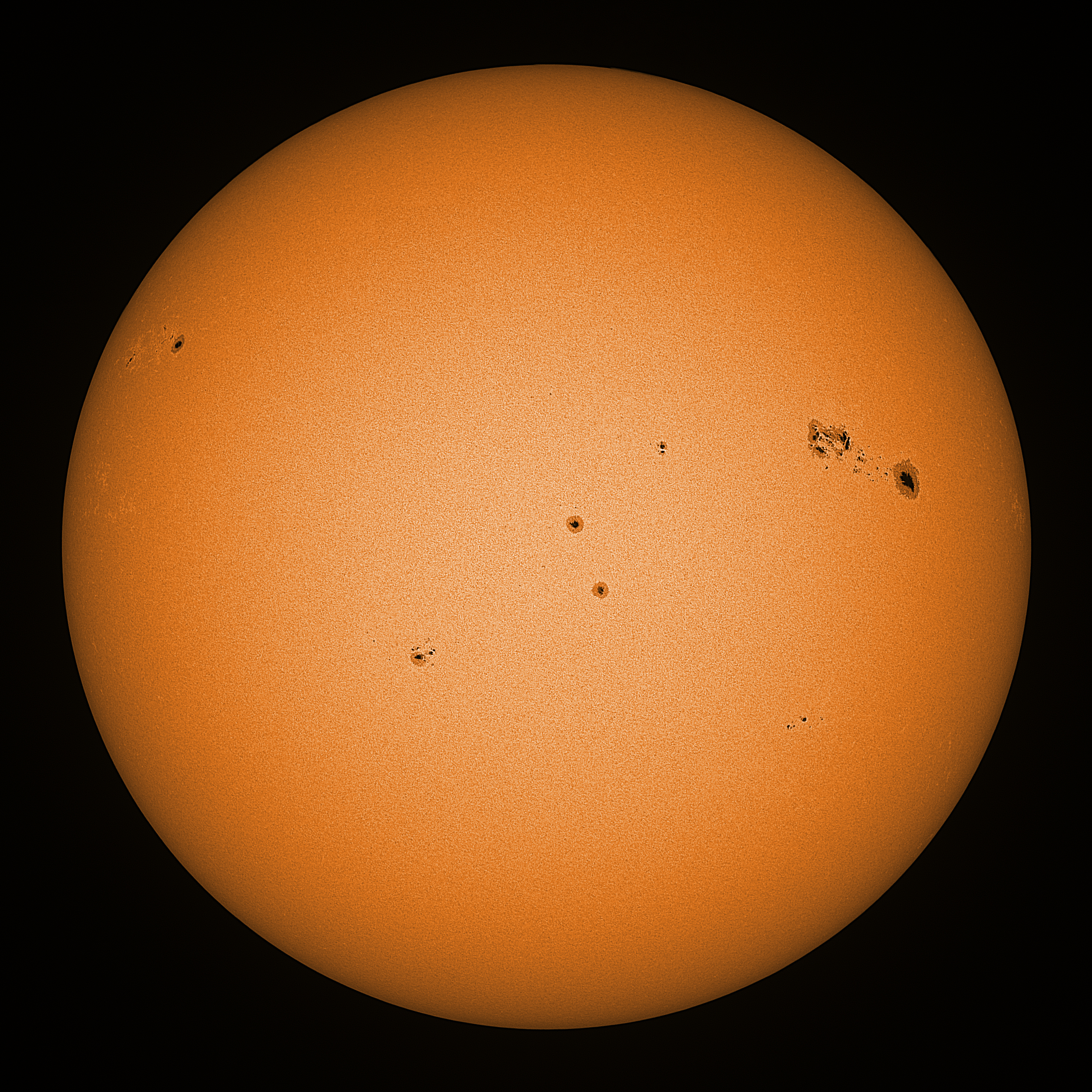 Observation date/time: 07 February 2026 10:25 UTC Telescope: GTT60 (Galileo Type Telescope) Focal length: 1490mm (plano convex singlet) Aperture: 60mm Stop: 30mm Eyepiece: -75mm (plano concave singlet, 24mm aperture) Observation type: projection (338mm distance, 80mm diameter) Reference: Earth's rotation axis Exposure (transparency): 0.530ms (using 82nm bandwidth green filter) Seeing (SSSMon): 1.2-2.0" (0.4" at best) =================================================================== Total number of sunspots: 36 | |